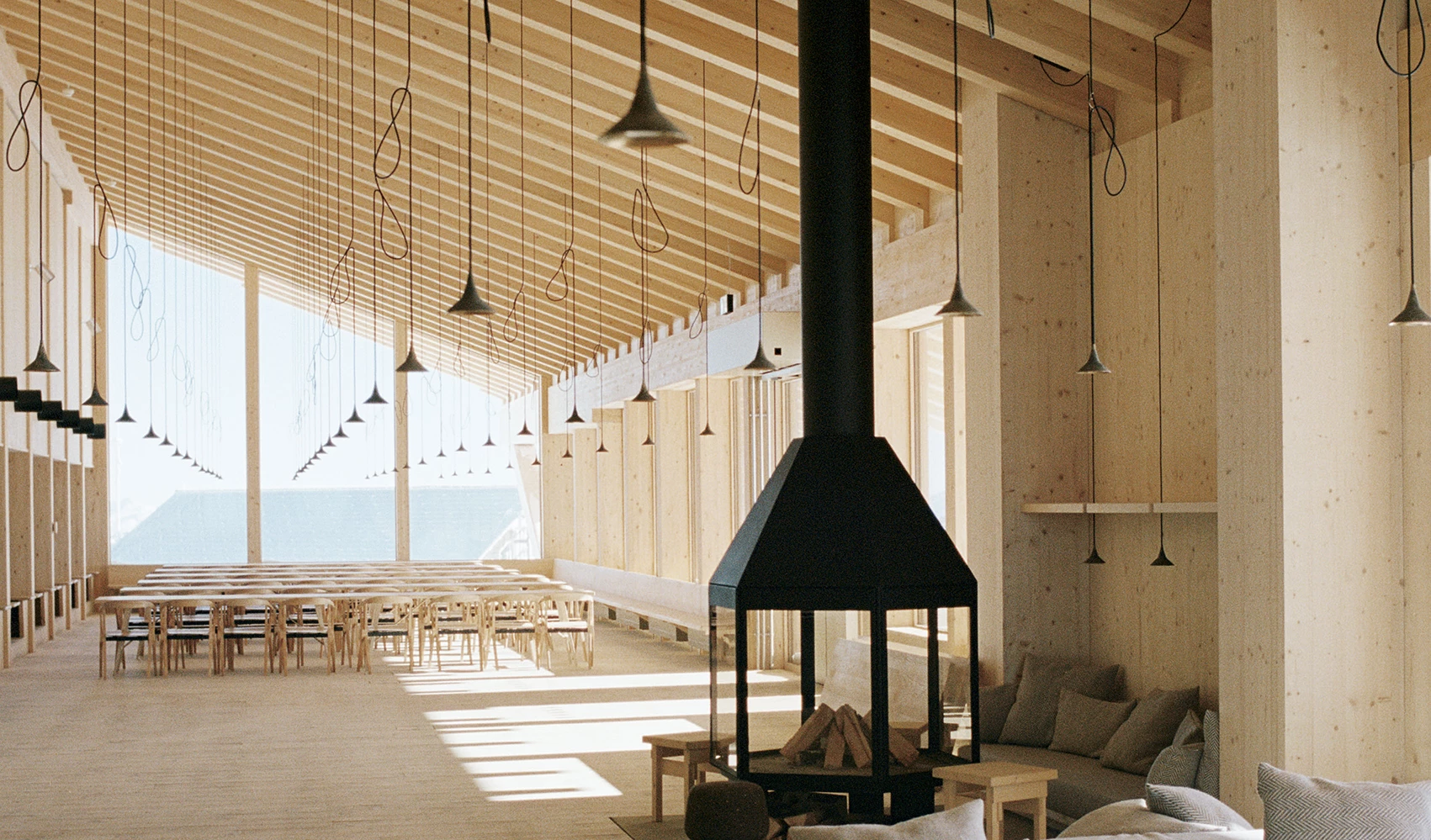 El restaurante es un espacio largo y flexible cuya atmósfera está marcada por la carpintería del interior, realizada en madera de abeto local. El elemento dominante del edificio es la cubierta a dos aguas, que vuela sobre una terraza en el frente sur del restaurante. Con tres de sus fachadas cerradas en vidrio, el espacio ofrece espectaculares vistas del paisaje. El frente restante está conformado por una serie de alcobas con bancos y mesas empotrados, cada una rematada por una ventana que enmarca una parte determinada de las montañas del norte.