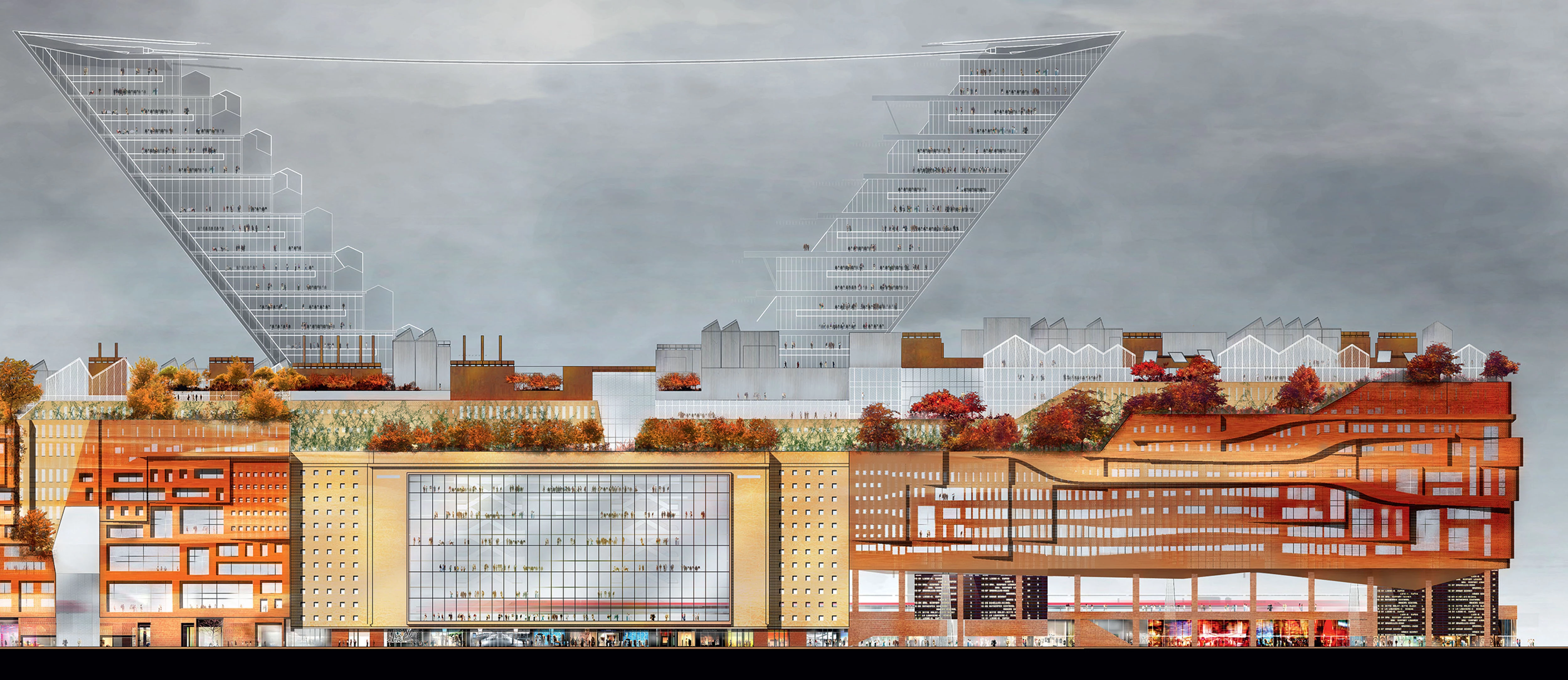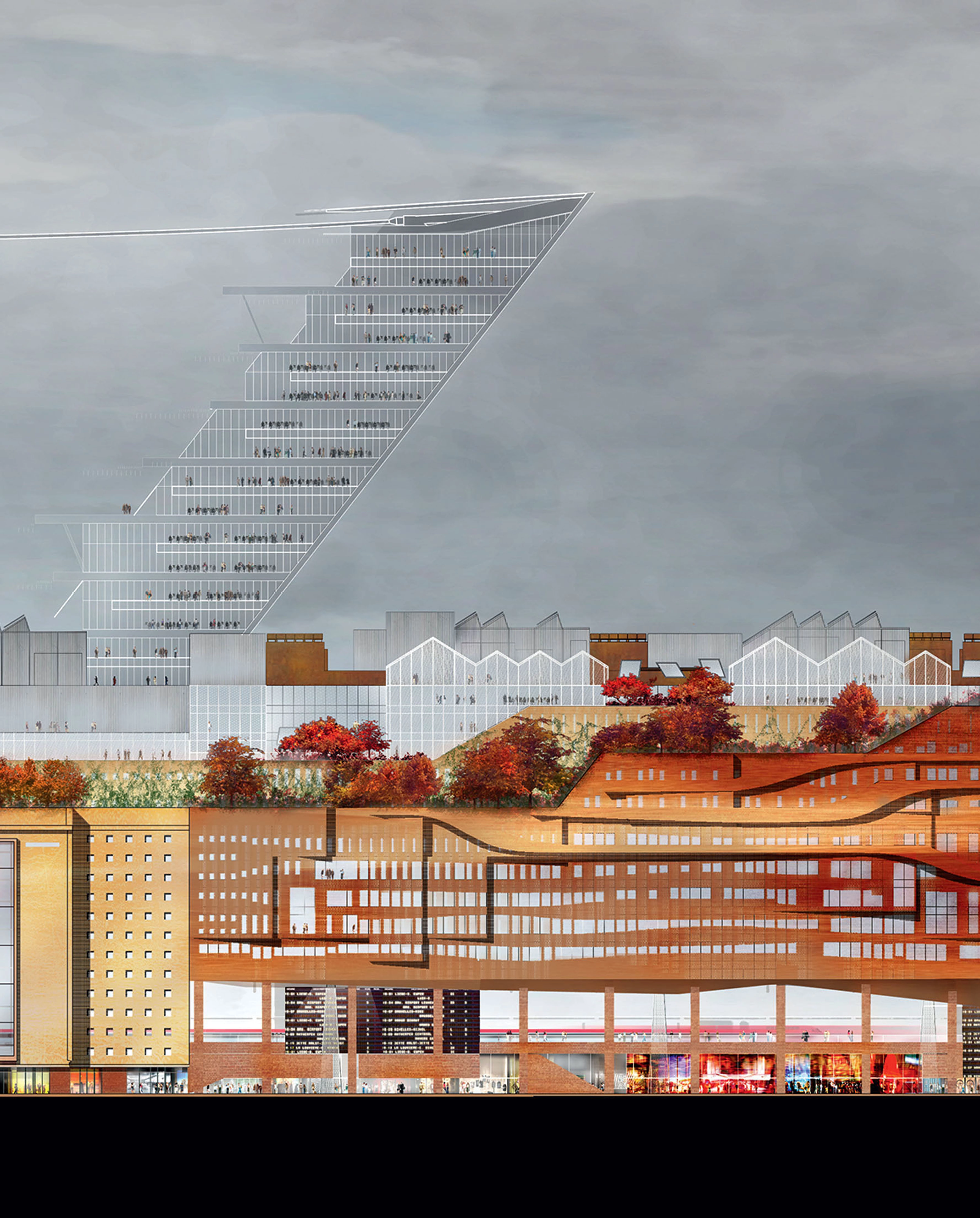 El edificio de oficinas en forma de V —de 120 m de altura— está revestido de vidrio y se inclina 52º para convertirse en un espejo hacia la ciudad; en su cara interior, la fachada sur está protegida mediante brise-soleil y la norte, por invernaderos de cristal... [+]