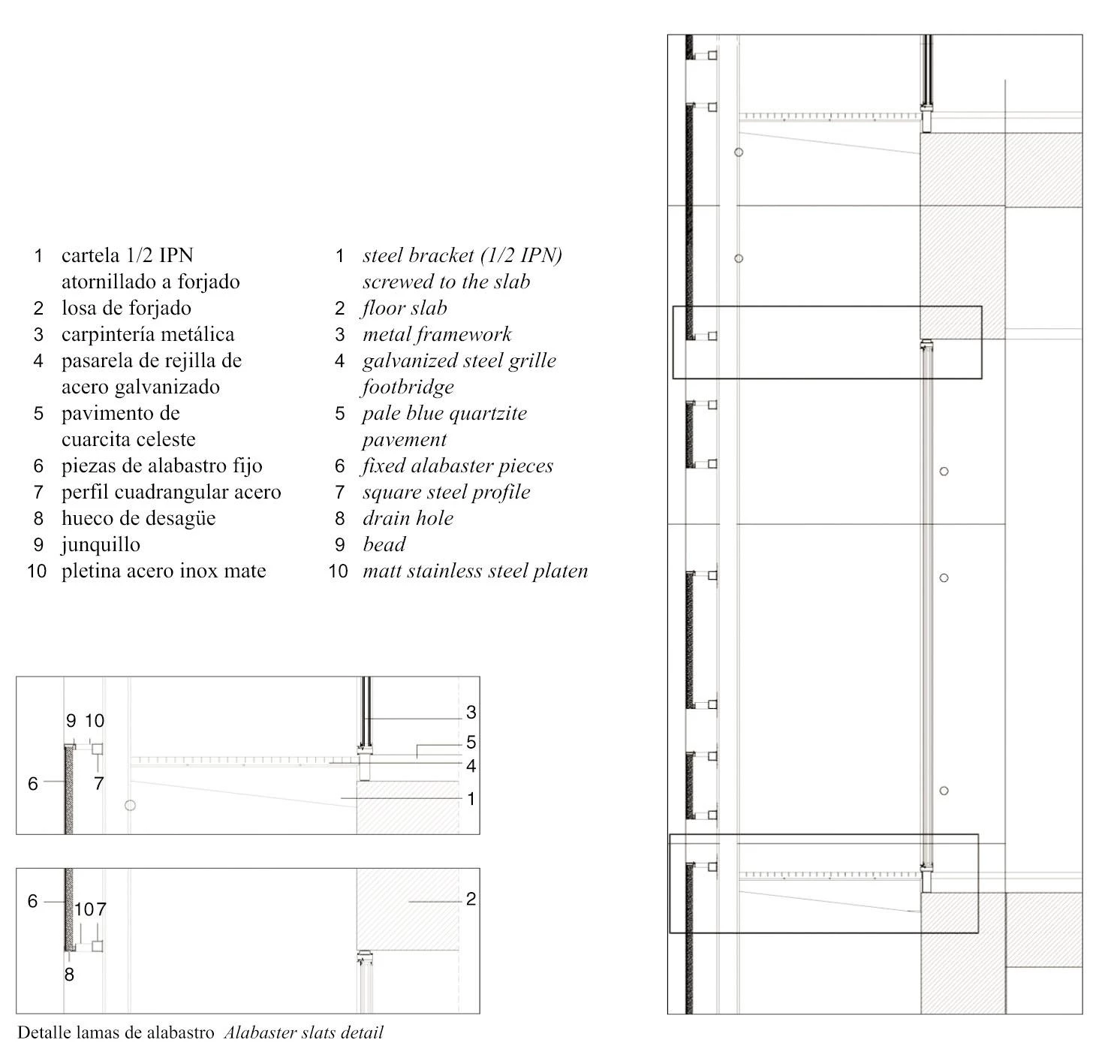 La gran dimensión de la estación propicia distintas fachadas: retícula de huecos al este (salidas), lamas de alabastro al oeste (llegadas), ventanales corridos al norte (fachada de hoteles) y hormigón ciego al sur (accesos).