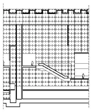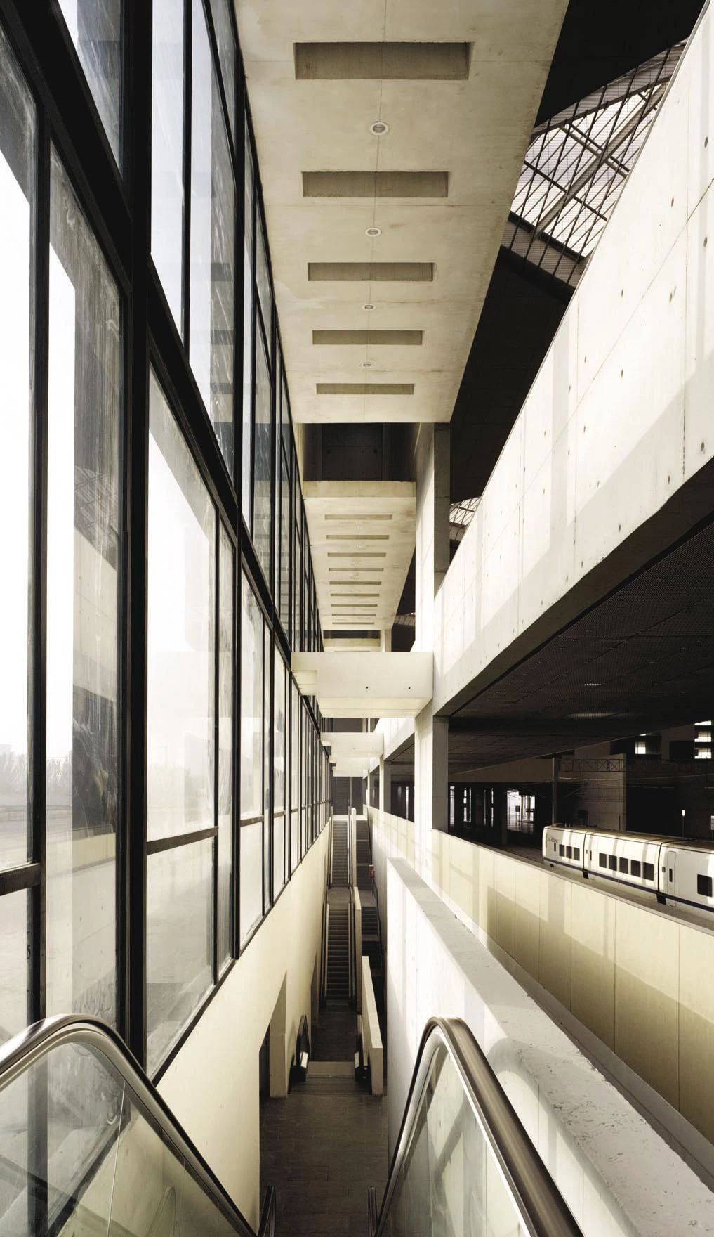 Dos elementos —los muros de fachada y la cubierta— se revelan esenciales en la construcción de este complejo espacio multifuncional. Los primeros, con un espesor de treinta centímetros en todas sus caras y una altura de 27 metros, conforman en cinco crujías un paralelogramo de 500 x 110 metros sin pilares intermedios, que aloja el espacio principal. La segunda, una malla de 40.000 metros cuadrados compuesta por triángulos de forma tetraédrica —por los que penetra la luz— y apoyada sobre vigas vierendel, se sustenta a partir de nueve arcos metálicos anclados al hormigón. En el interior, un cielo raso de triángulos bidimensionales de malla metálica y madera (luz y sombra) cuelga de las vigas, acompañando como telón de fondo el movimiento incesante de trenes y viajeros. Completando el diseño en lo que se refiere a la información y el confort en los vestíbulos y andenes, se han desarrollado diversas tecnologías de comunicación: antorchas multimedia y videomuros permiten al viajero visualizar las condiciones horarias y ambientales de la estación y de sus múltiples destinos.