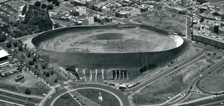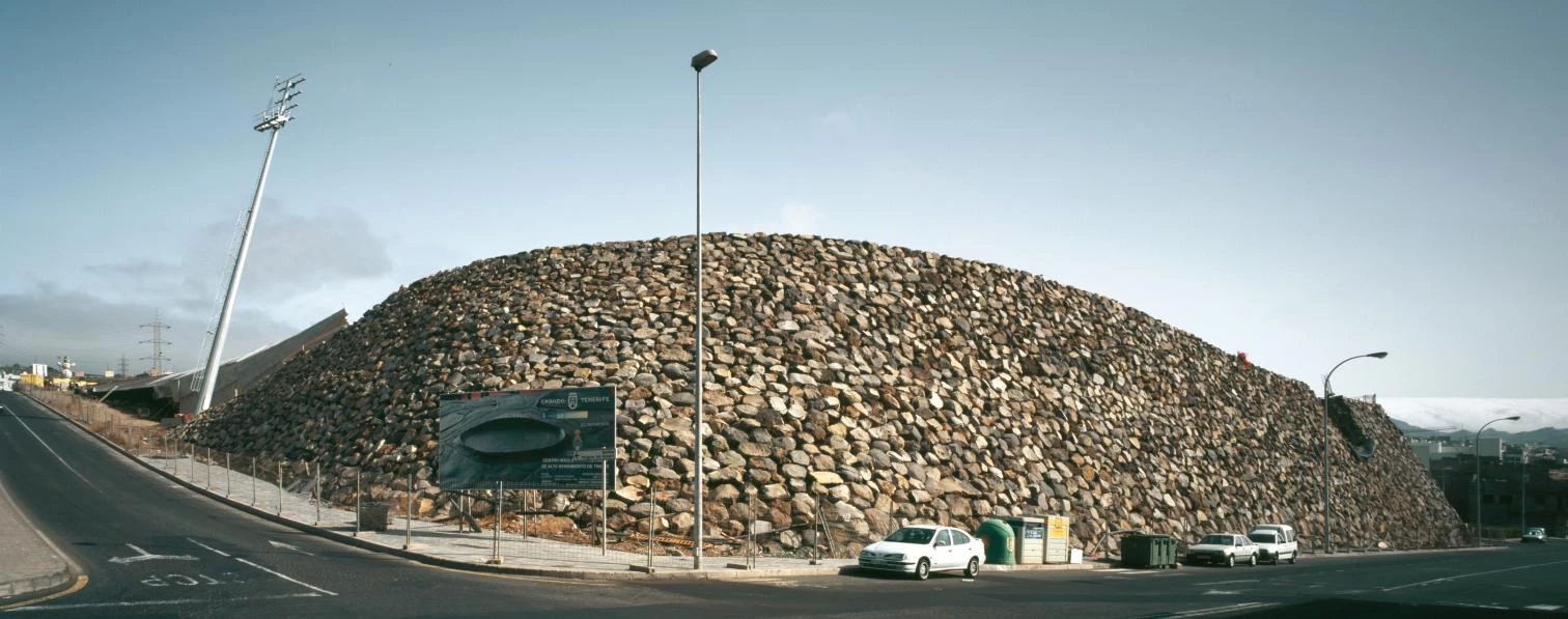 Un proyecto de entidad monumental que refleja el origen volcánico de la isla en la formalización de un cráter cuyas laderas se fijan gracias al peso de las ciclópeas rocas que las cubren, hasta configurar una imagen evocadora de un cono piroclástico.