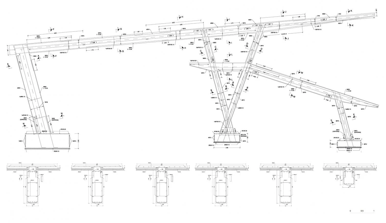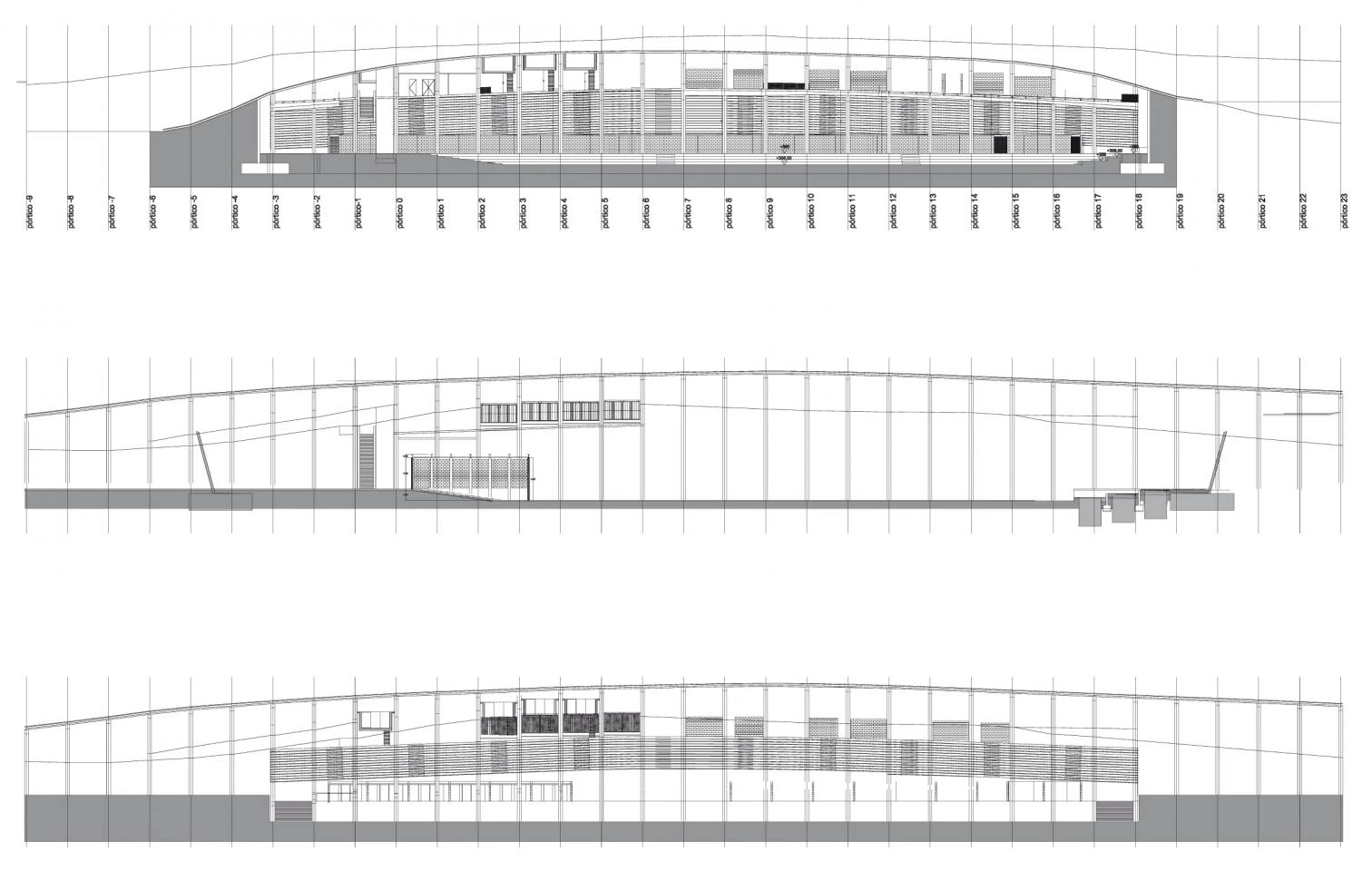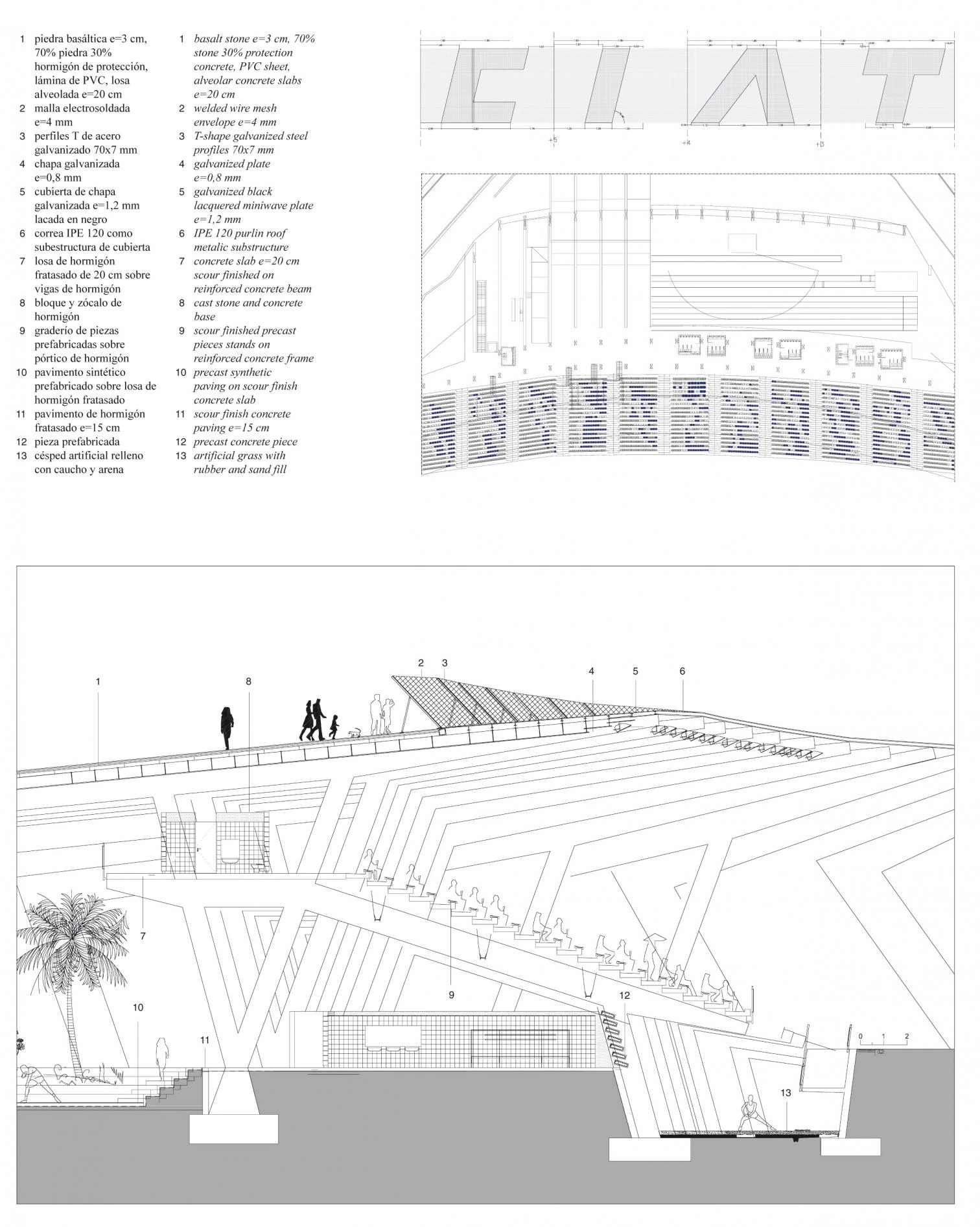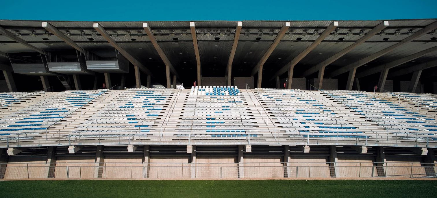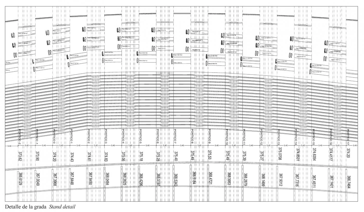 El hormigón se erige como protagonista indiscutible tanto del proceso constructivo como de la estructura, configurando una sucesión de pórticos que forman las gradas a la vez que soportan la cubierta acabada en chapa galvanizada. Este mismo material es empleado de manera postensada en el caso de las vigas, con lo que se logra reducir considerablemente su sección estructural.