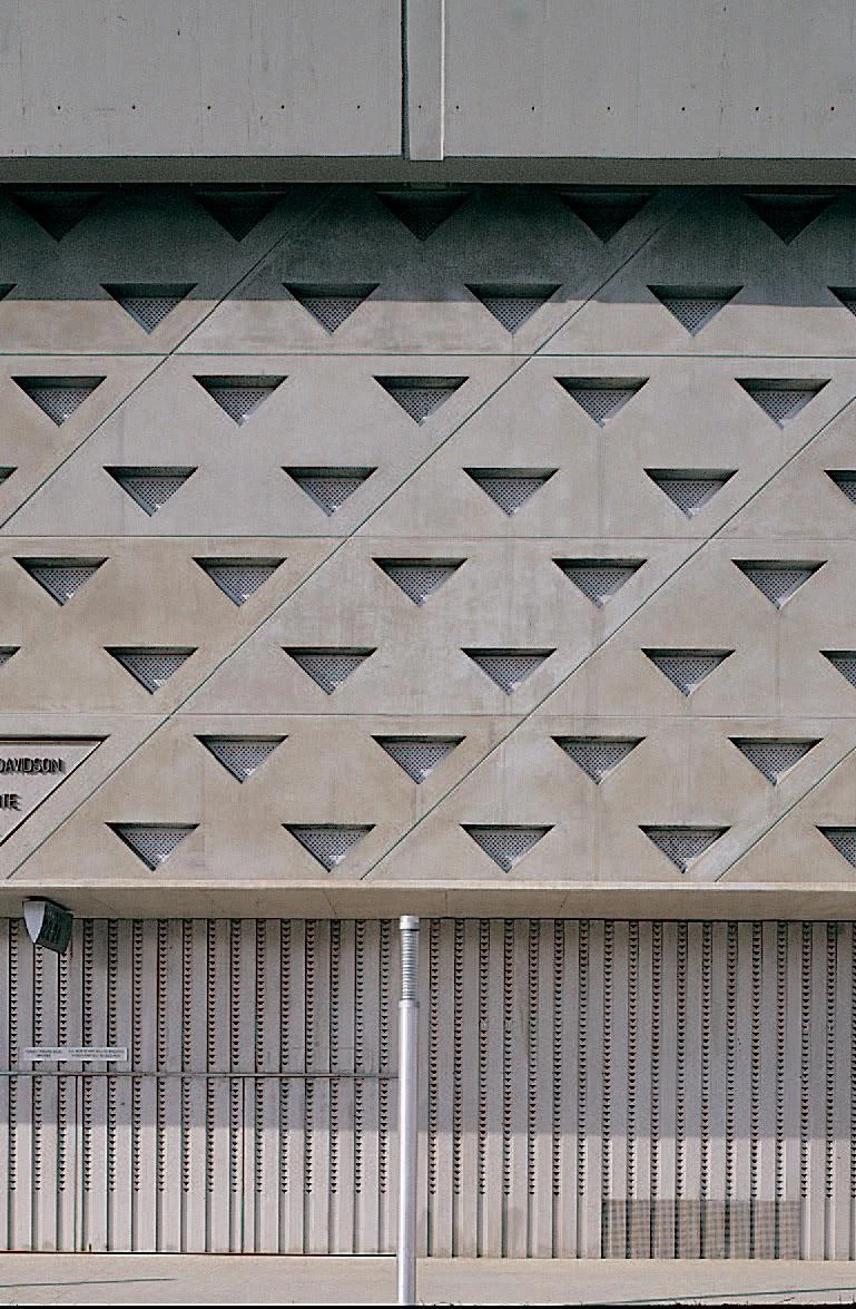 La horizontalidad de la viga de coronación y la marquesina del zócalo imponen al exterior la escala del estadio, oculto tras una piel de GRC perforada con huecos triangulares inspirados en el escudo del Betis.