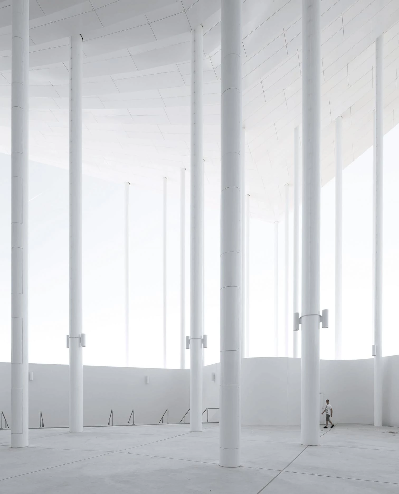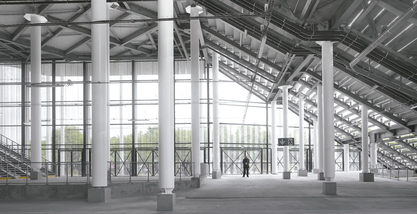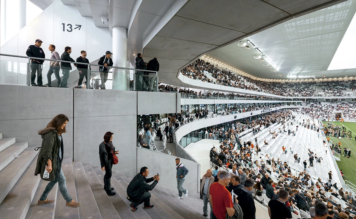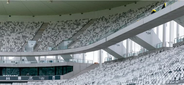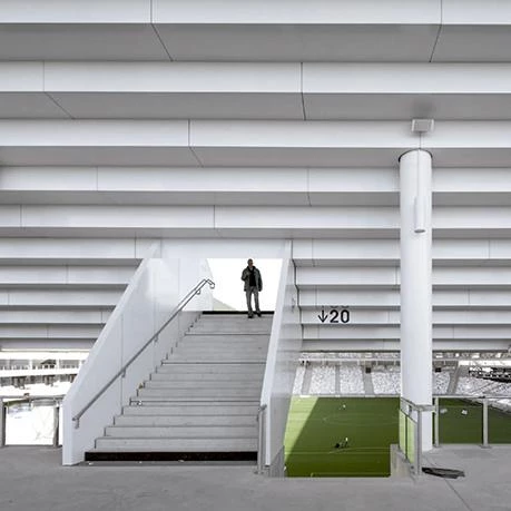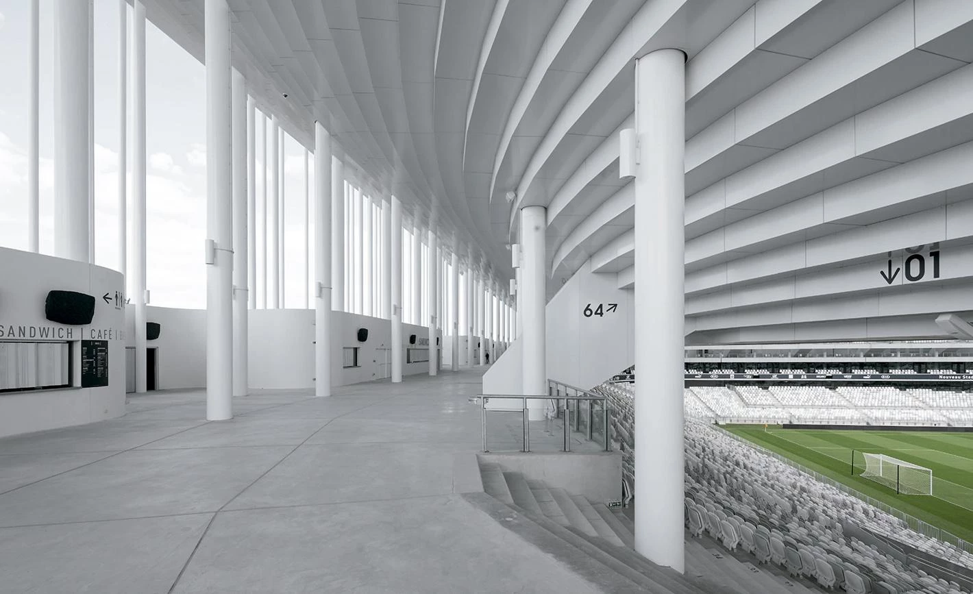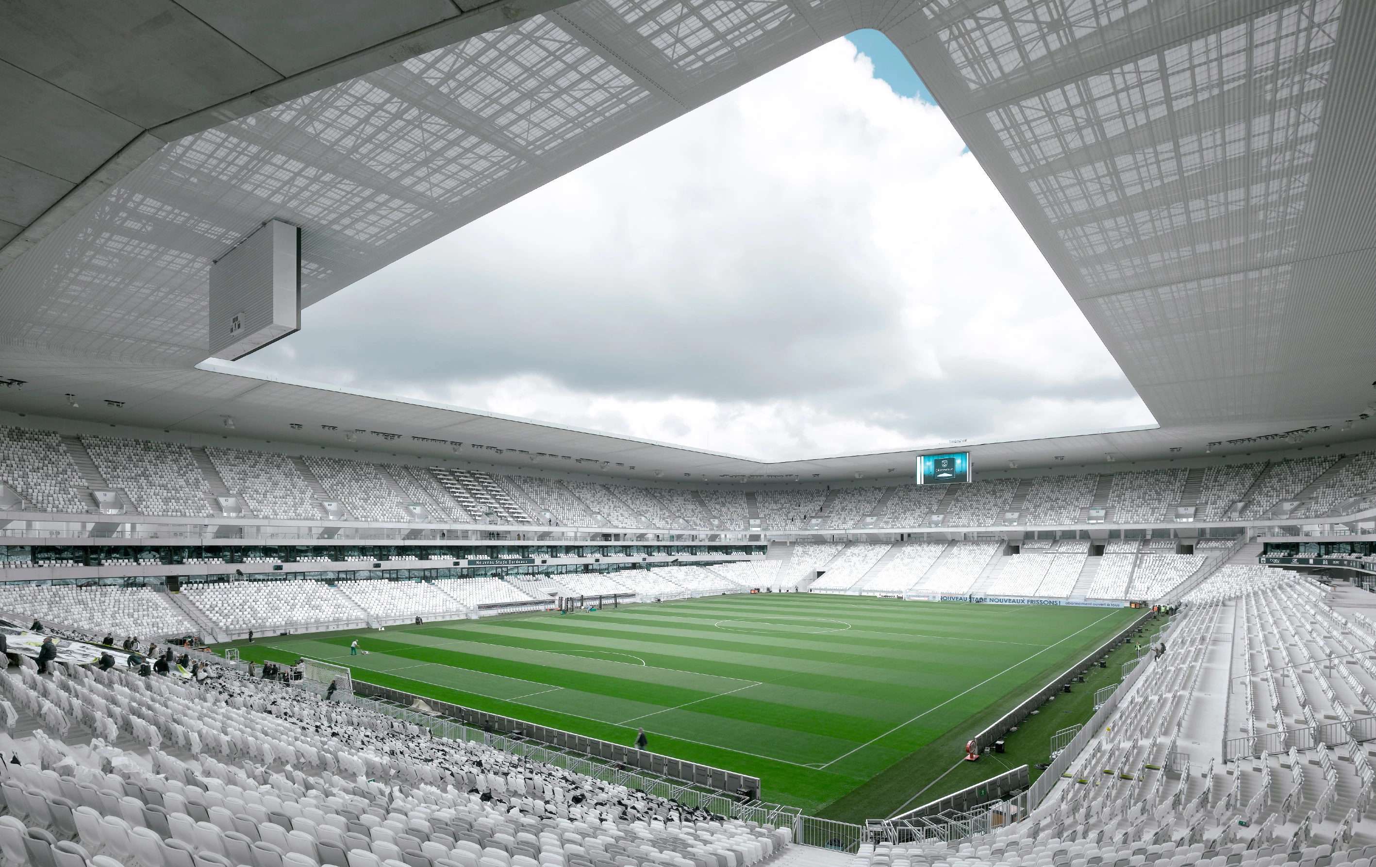 Como si fuera la de un templo clásico, una cortina de columnas posada sobre un plinto emerge sobre la llanura de Burdeos. Pero, a diferencia de los templos, este estadio transforma su podio en una escalinata muy marcada, y el resultado es que se desmaterializan los límites entre el interior y el exterior, y al cabo todo el conjunto resulta liviano.