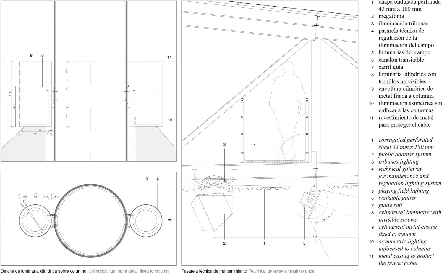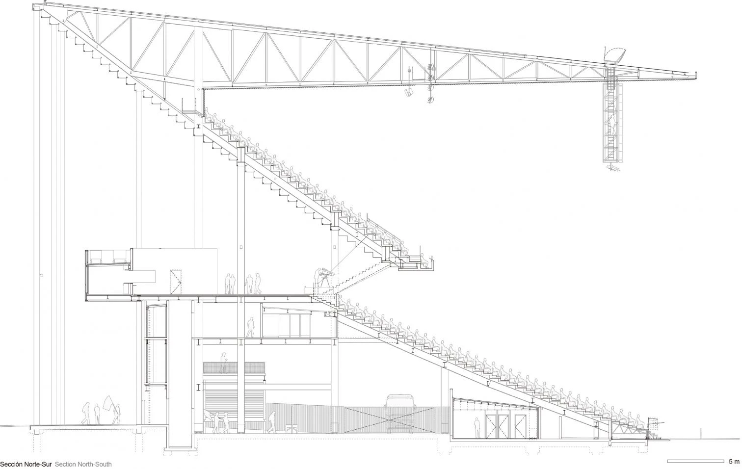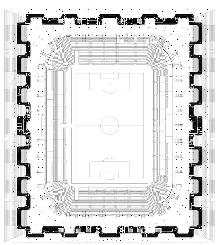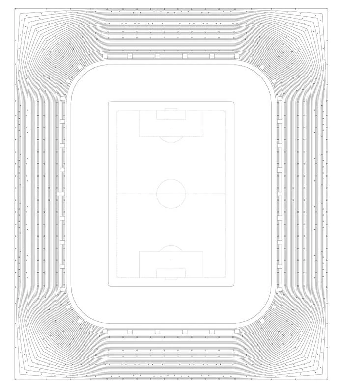 Aunque la imagen desencadenante del proyecto sea metafórica —un bosque de columnas—, el edificio consiste en un riguroso ejercicio funcional destinado a dar cabida a 42.000 espectadores en las mejores condiciones posibles de visibilidad. Con este fin, entre la pista situada al nivel del suelo y la cota de acceso exterior se ha dispuesto un cuerpo en forma de cuña, donde se cobija el programa, desde las instalaciones hasta la sala VIP. La geometría de este cuerpo acuñado se define, al exterior, por la sección de la escalinata, mientras que al interior se ajusta a la pendiente del graderío. Esta disposición rompe con los esquemas tradicionales de los estadios: en lugar de moverse por baterías de escaleras o rampas, las masas lo hacen por la escalinata exterior hasta alcanzar el punto medio del graderío; como desde esta cota se controla panópticamente el estadio resulta posible acceder, sin mayores problemas de orientación, a las gradas inferiores o superiores, situadas a distancias equidistantes.