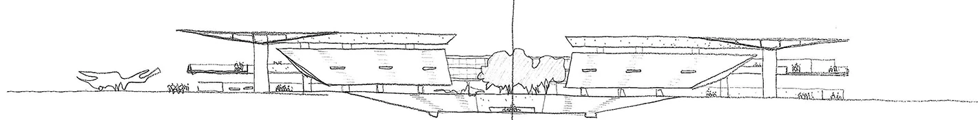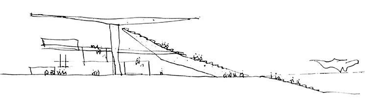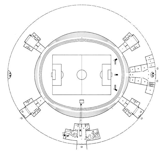 Enterrado a partir de su mitad inferior, el volumen se percibe desde el exterior como un objeto de dimensiones controladas integrado en el paisaje de su entorno. Aunque finalmente no se llegaron a ejecutar, el proyecto original contaba con amplios jardines y programas deportivos complementarios situados en los alrededores del campo, que se relacionaban directamente con el interior, gracias a la permeabilidad de su perímetro.