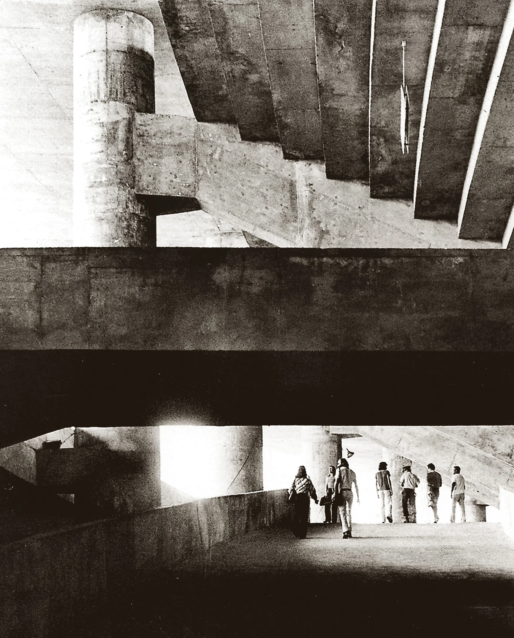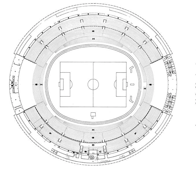Apoyado sobre un conjunto ritmado de mástiles, un inmenso alerón curvo salva una luz de más de cuarenta metros mediante ménsulas que parten desde el centro en voladizo. Esta cubierta de hormigón protege por un lado las gradas y por otro un área general de accesos, circulación, bares, vestuarios, taquillas y servicios de apoyo al público.