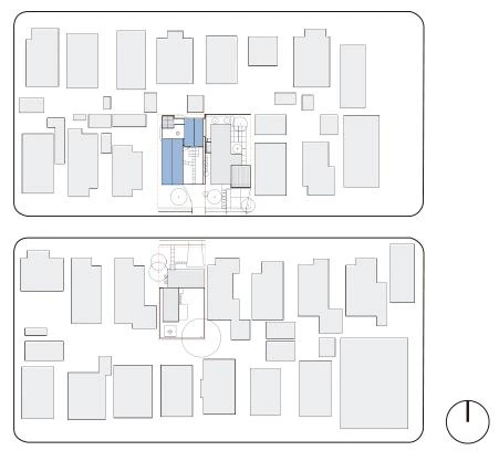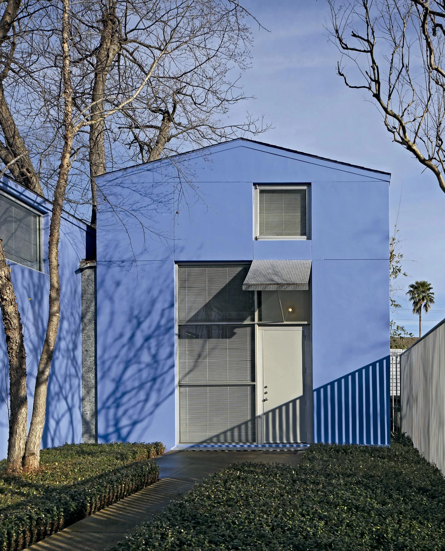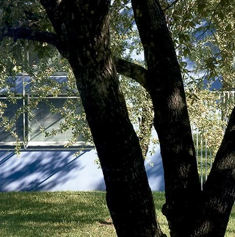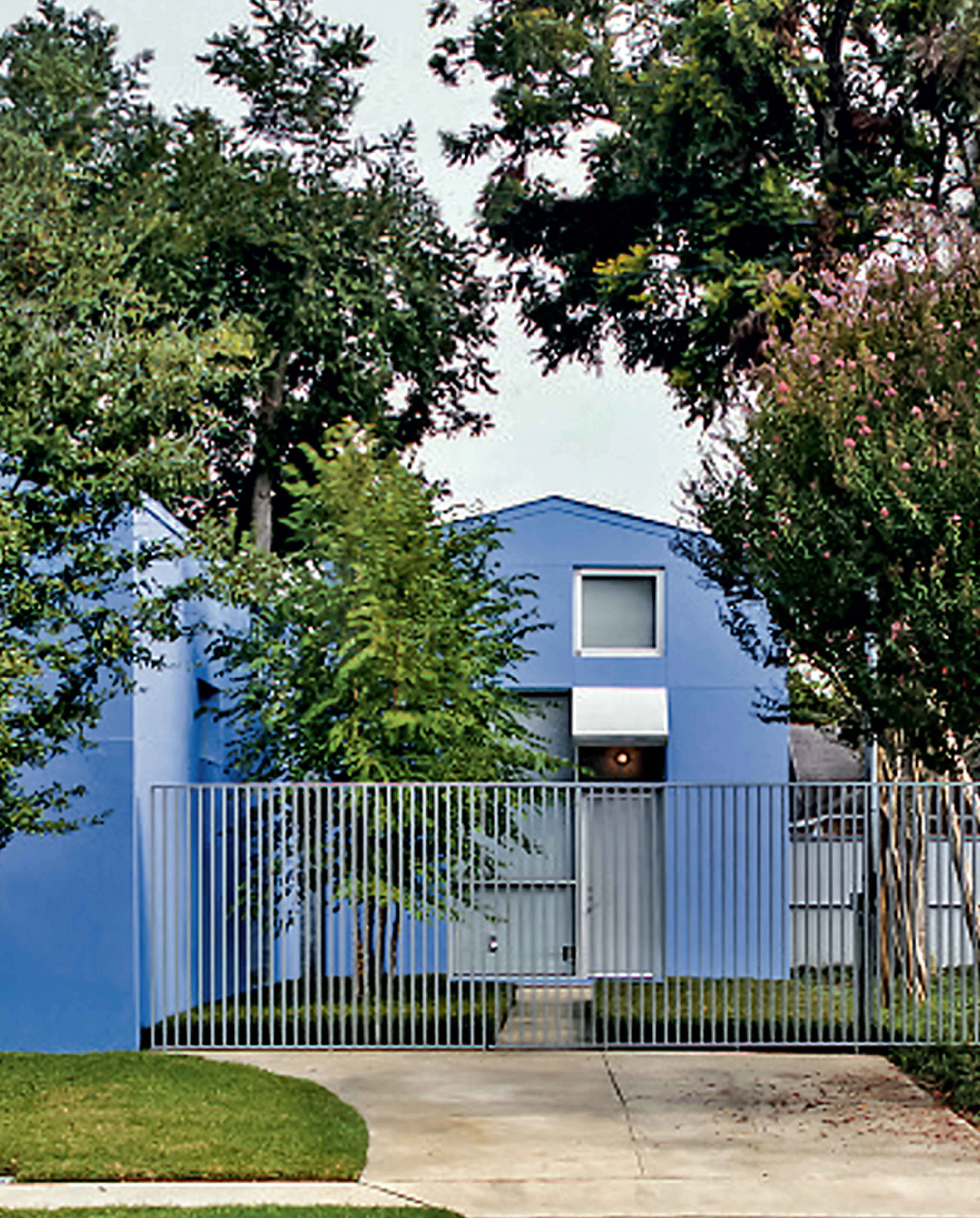 Este trabajo de variación formal y tipológica ha sido posible gracias a la sencilla geometría ortogonal de las piezas, que ha resultado muy versátil en cada una de las etapas de la intervención para responder a las necesidades de la vida, el trabajo y todas las circunstancias asociadas o imprevistas. Construidos con muros de fábrica de bloques de hormigón acabados al exterior con un suave estuco, los edificios están pintados de un intenso azul lavanda que evoca los muchos matices que suele presentar el cielo de Houston. En torno a ellos, delimitando el perímetro del solar, se levanta una valla de acero que acentúa la sensación de privacidad. En el interior de la parcela, el conjunto de piezas se entrelaza con los árboles preexistentes y los recién plantados, y también con los patios y la luz, para enriquecer al cabo las experiencias de la vida cotidiana.
