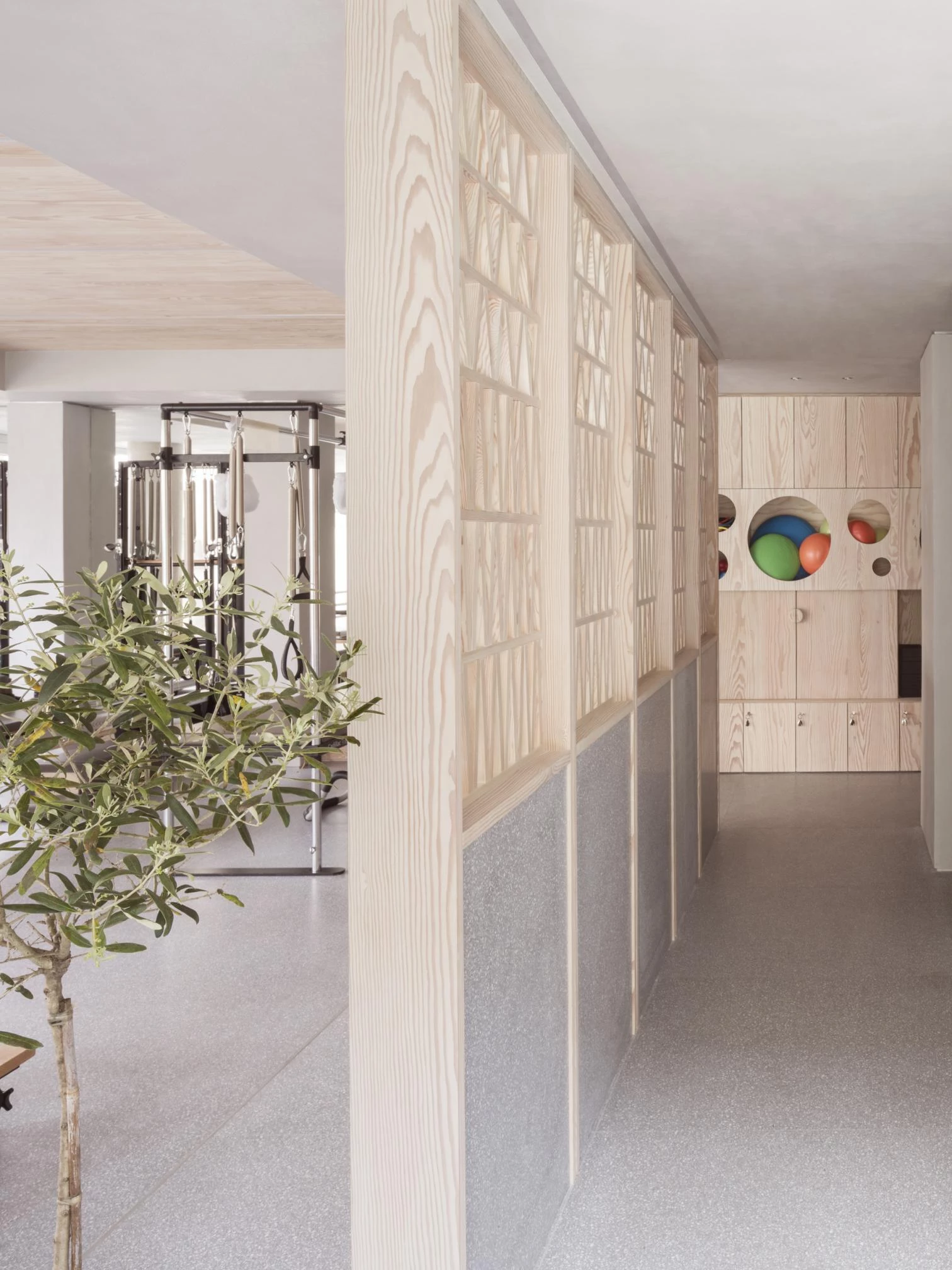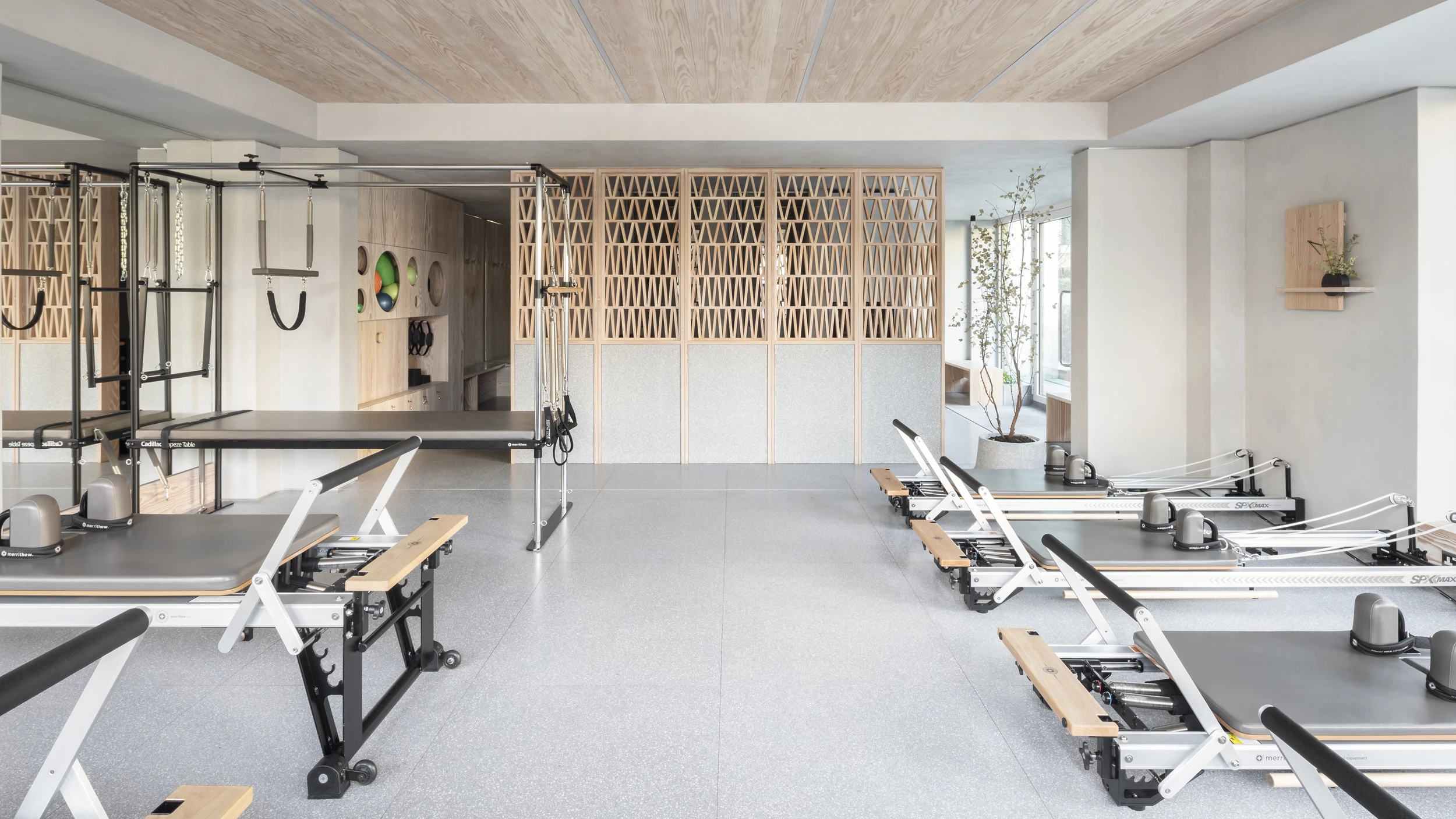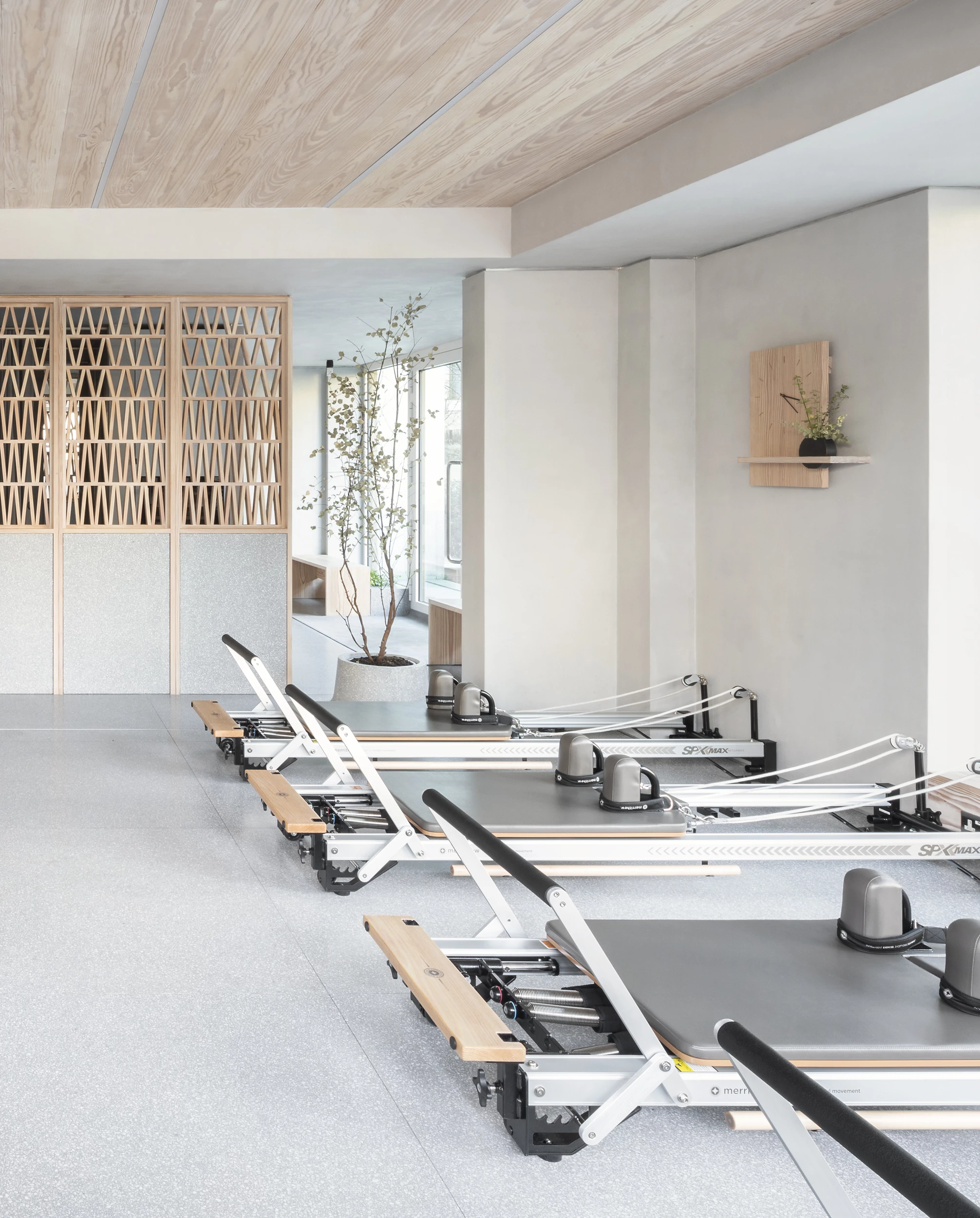 El local de tamaño reducido atiende los diferentes requisitos programáticos del estudio de pilates: espacios para las nueve máquinas reformer y almacenamiento, una recepción, dos vestuarios, un aseo y un área de descanso. La circulación abierta e ininterrumpida sólo se encuentra con una puerta (la de aseo) y la celosía central que organiza la sala, formada por 360 piezas unidas con ensambles tradicionales de galleta.