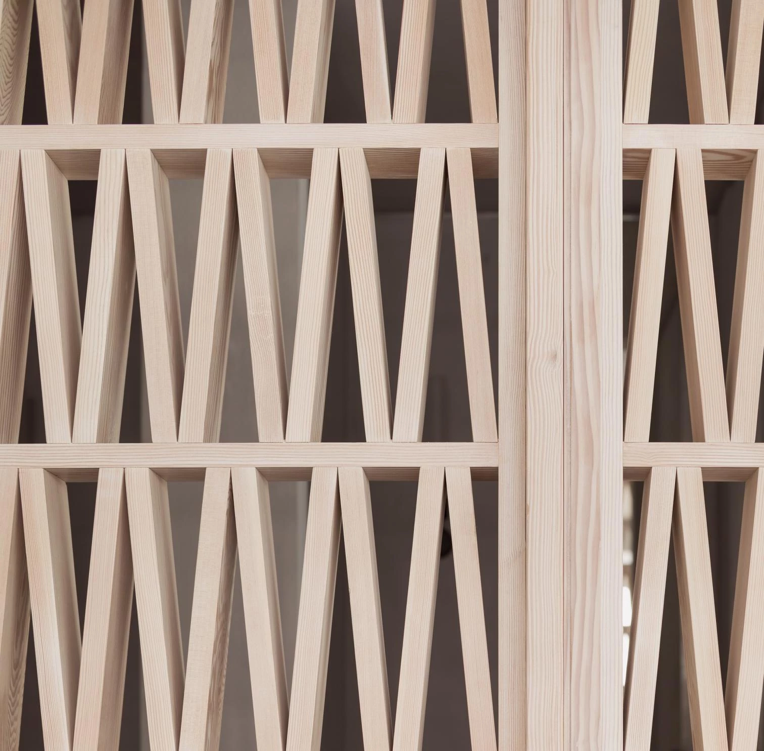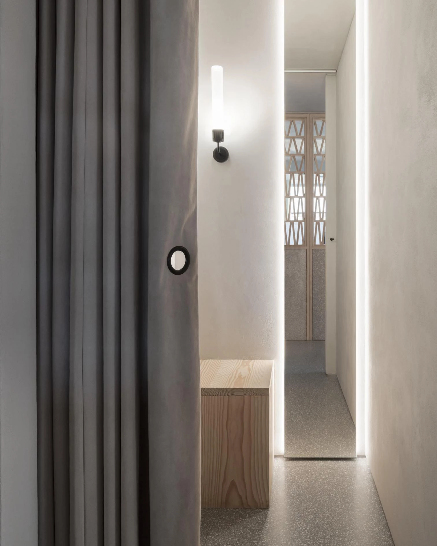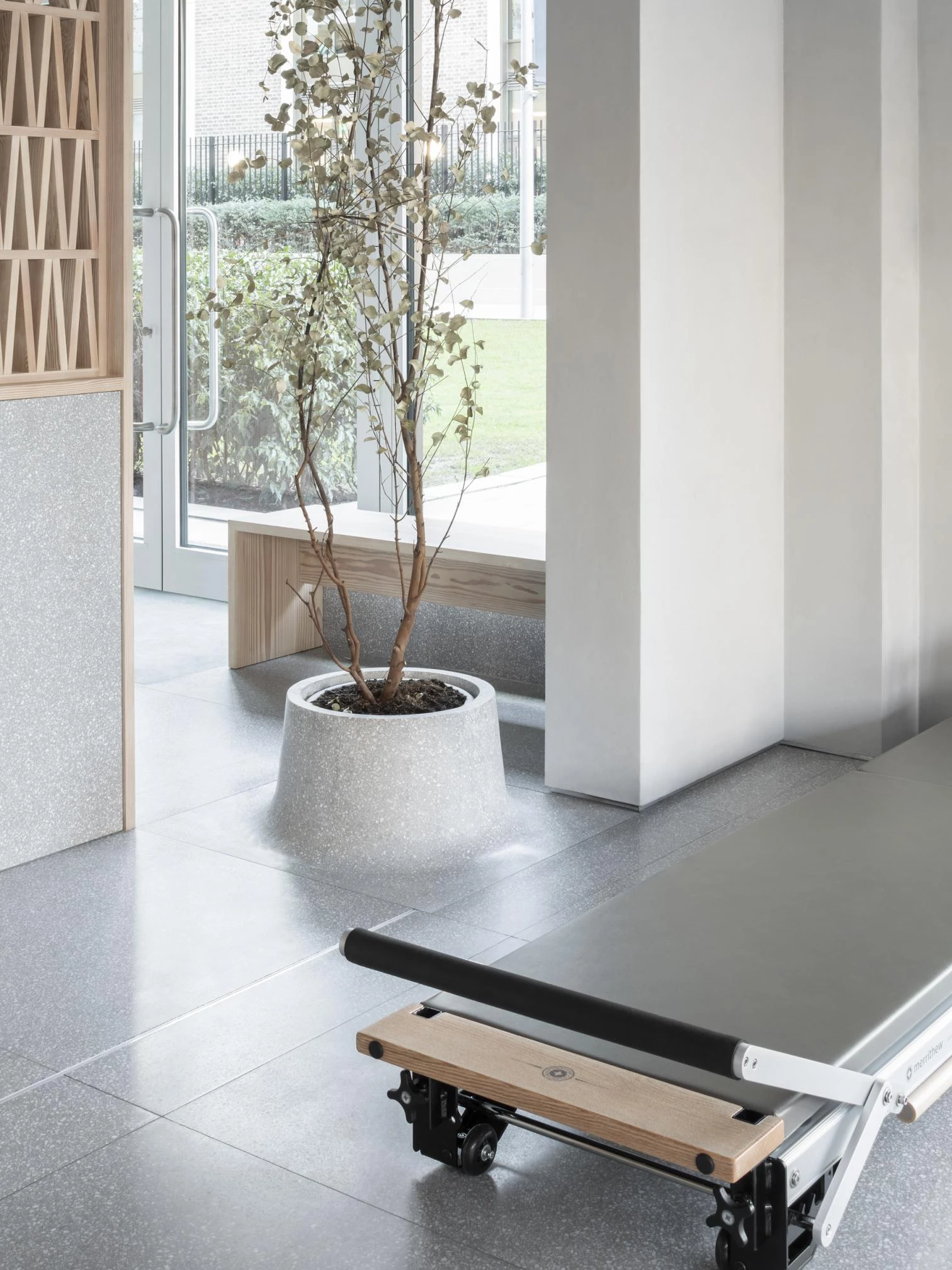 El local de tamaño reducido atiende los diferentes requisitos programáticos del estudio de pilates: espacios para las nueve máquinas reformer y almacenamiento, una recepción, dos vestuarios, un aseo y un área de descanso. La circulación abierta e ininterrumpida sólo se encuentra con una puerta (la de aseo) y la celosía central que organiza la sala, formada por 360 piezas unidas con ensambles tradicionales de galleta.