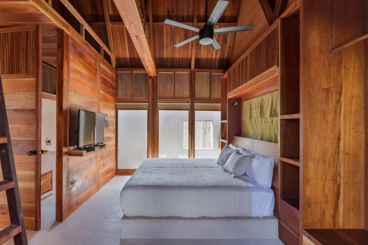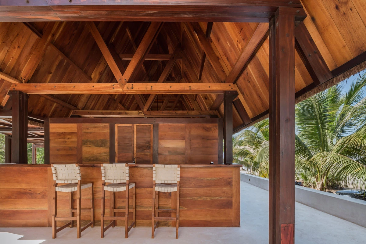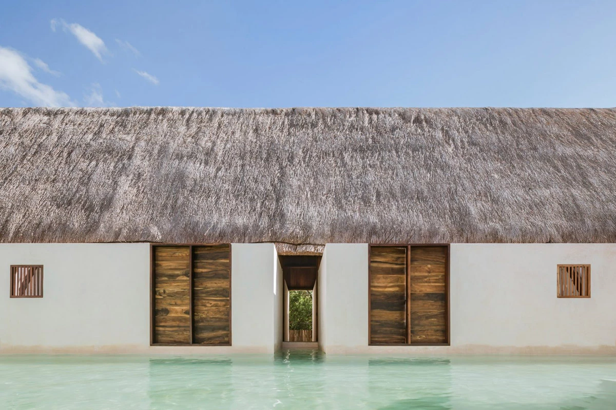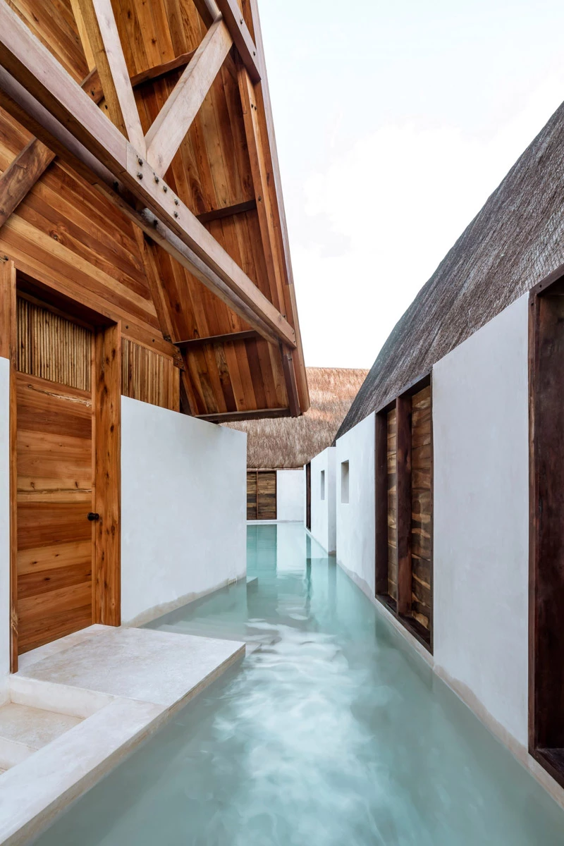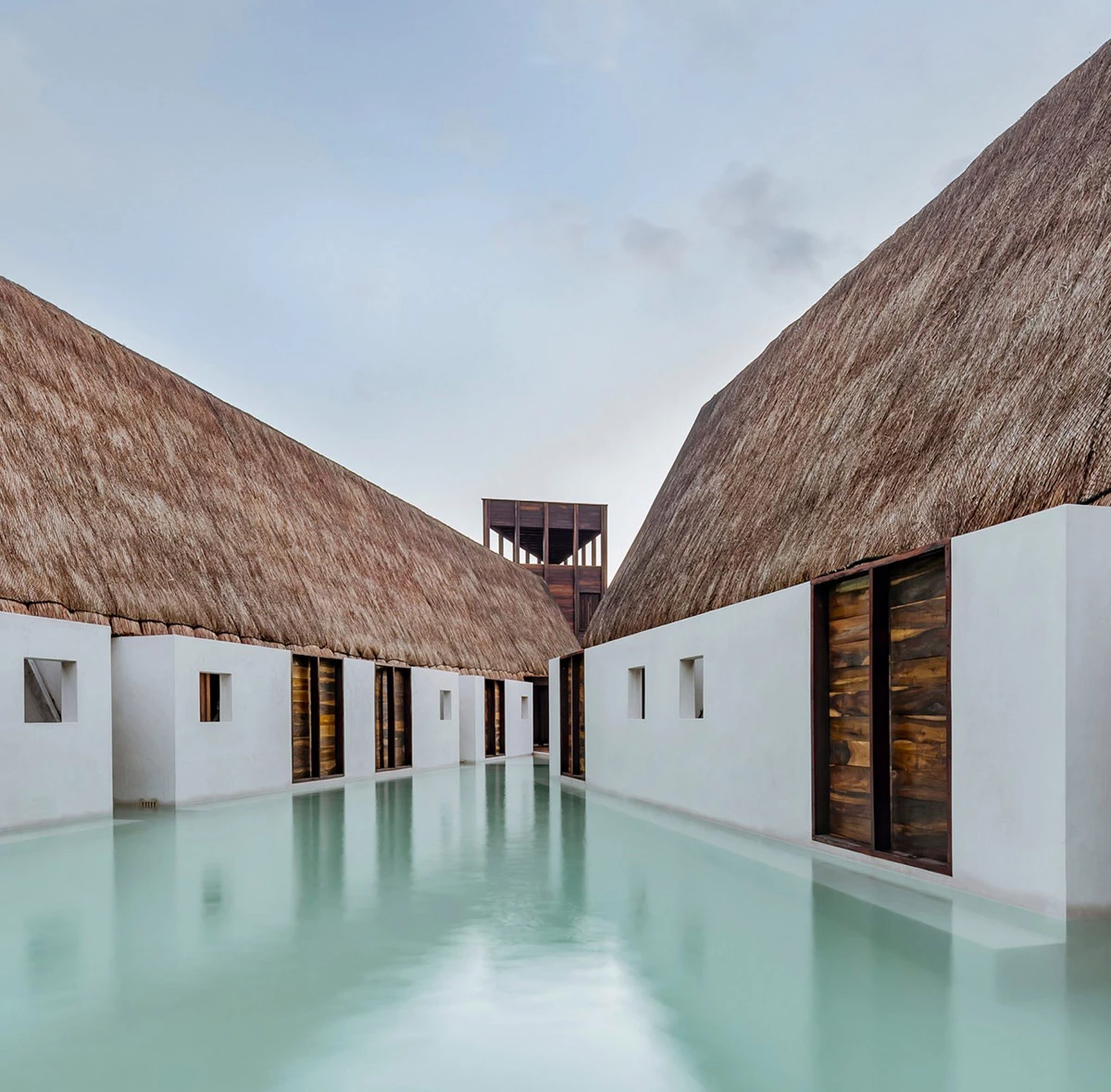 La firma de Guadalajara (México) liderada por Salvador Macías y Magui Peredo ha levantado este pequeño hotel en la isla de Holbox (que en maya significa agujero negro), situada frente a la costa noreste de la península de Yucatán. El corazón del proyecto es un claustro anegado con escalinatas inundadas que dan acceso a las habitaciones. Por ello, las circulaciones se llevan hasta el perímetro del conjunto triangular, que cuenta con una superficie construida de 600 metros cuadrados. Tres sencillos volúmenes alargados delimitan el recinto con sus cubiertas vegetales a dos aguas. Sin llegar a tocarse entre sí, las piezas de una sola altura dejan que los muros se liberen de su labor estructural con sólidas cubiertas de madera recubiertas de palma, las cuales remiten a la tradicional casa maya. En el ángulo más estrecho del proyecto, una torre de madera aloja los servicios y ofrece vistas sobre el manglar.