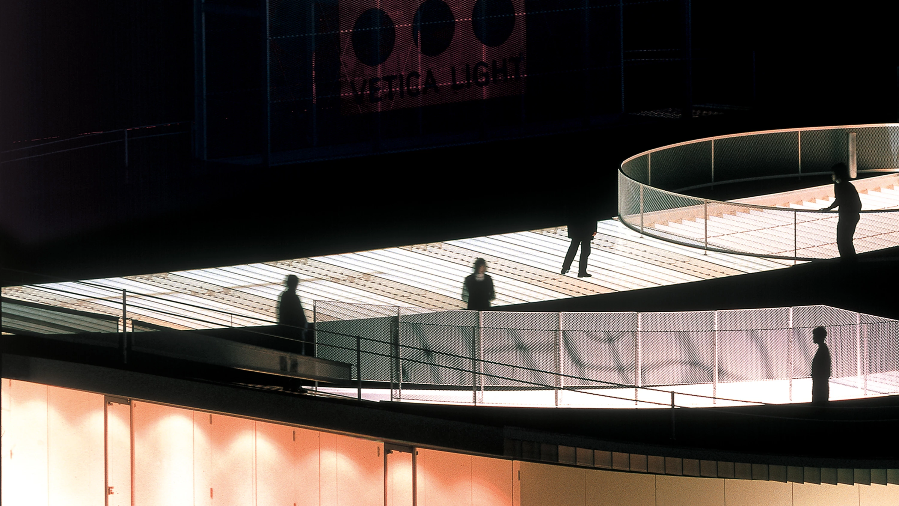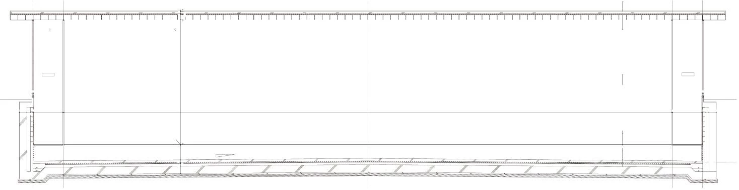 En los extremos del eje que atraviesa el patio se añaden un cuerpo trapezoidal en el norte que albergados talleres y una rampa destinada a carga y descarga de materiales en el frente sur. Finalmente, otra rampa situada fuera del perímetro que conforma la planta comunica la galería con el exterior. El pasillo perimetral actúa como colchón térmico y acústico para todas las estancias e introduce la luz natural a través de paños de vidrio que cierran su parte superior. La iluminación se complementa con tres franjas de cristal sobre la cubierta que se corresponden con las dos escaleras y el patio, donde se suceden tramos transparentes y translúcidos serigrafiados para tamizar la luz.