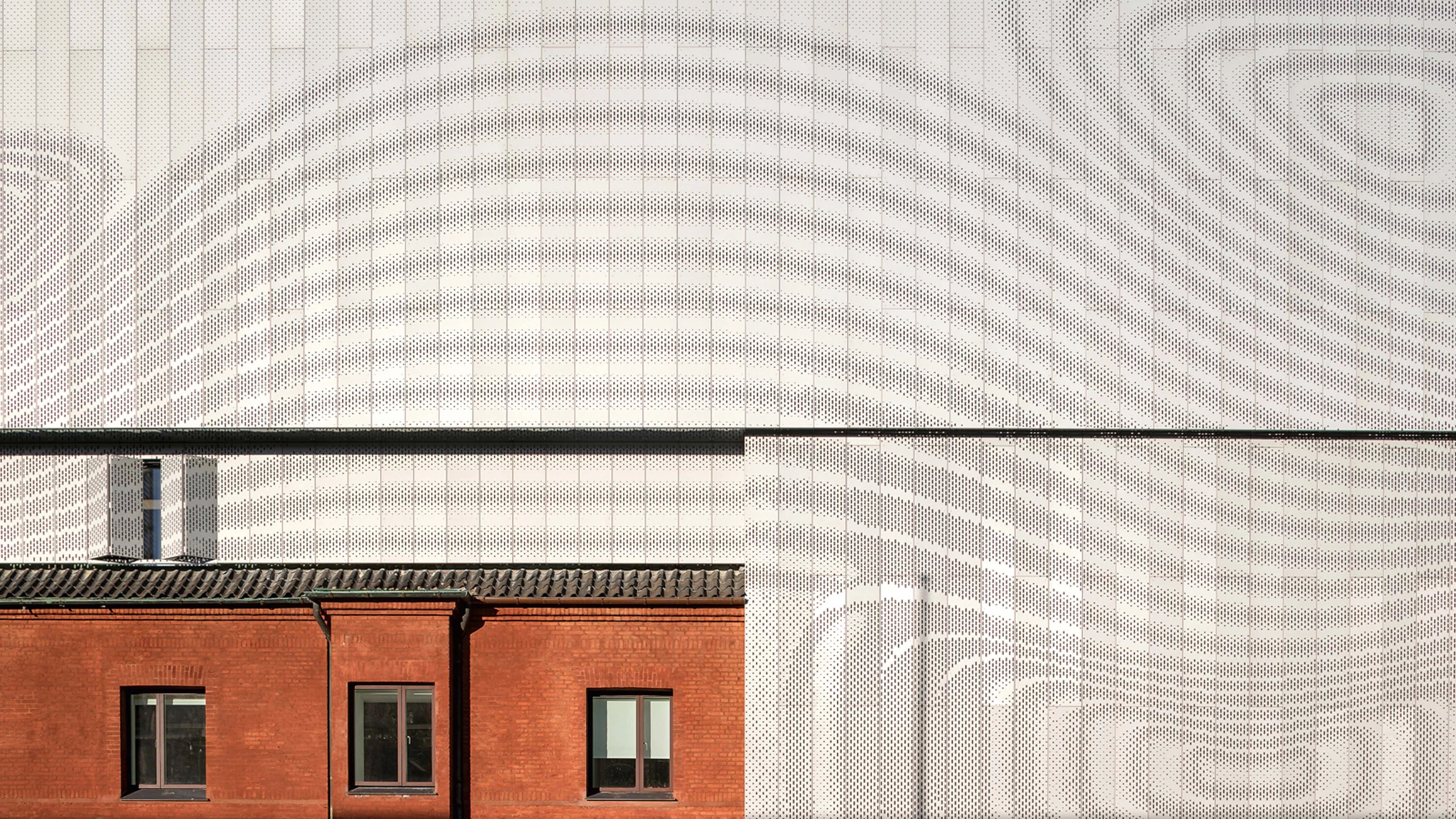 existente—, se revisten con una fachada ligera de paneles de aluminio, perforado según un patrón que muestra los cambios en el flujo del aire al encontrar resistencia... [+]