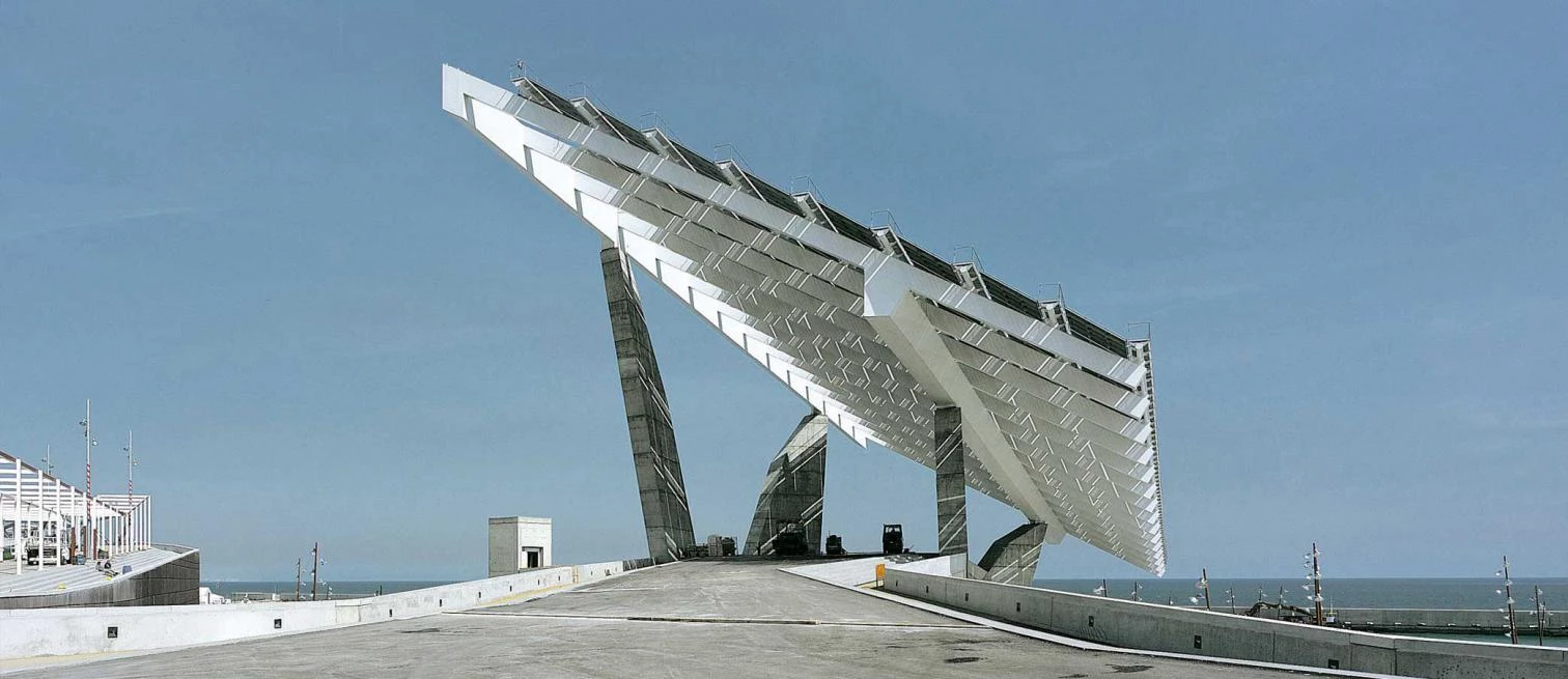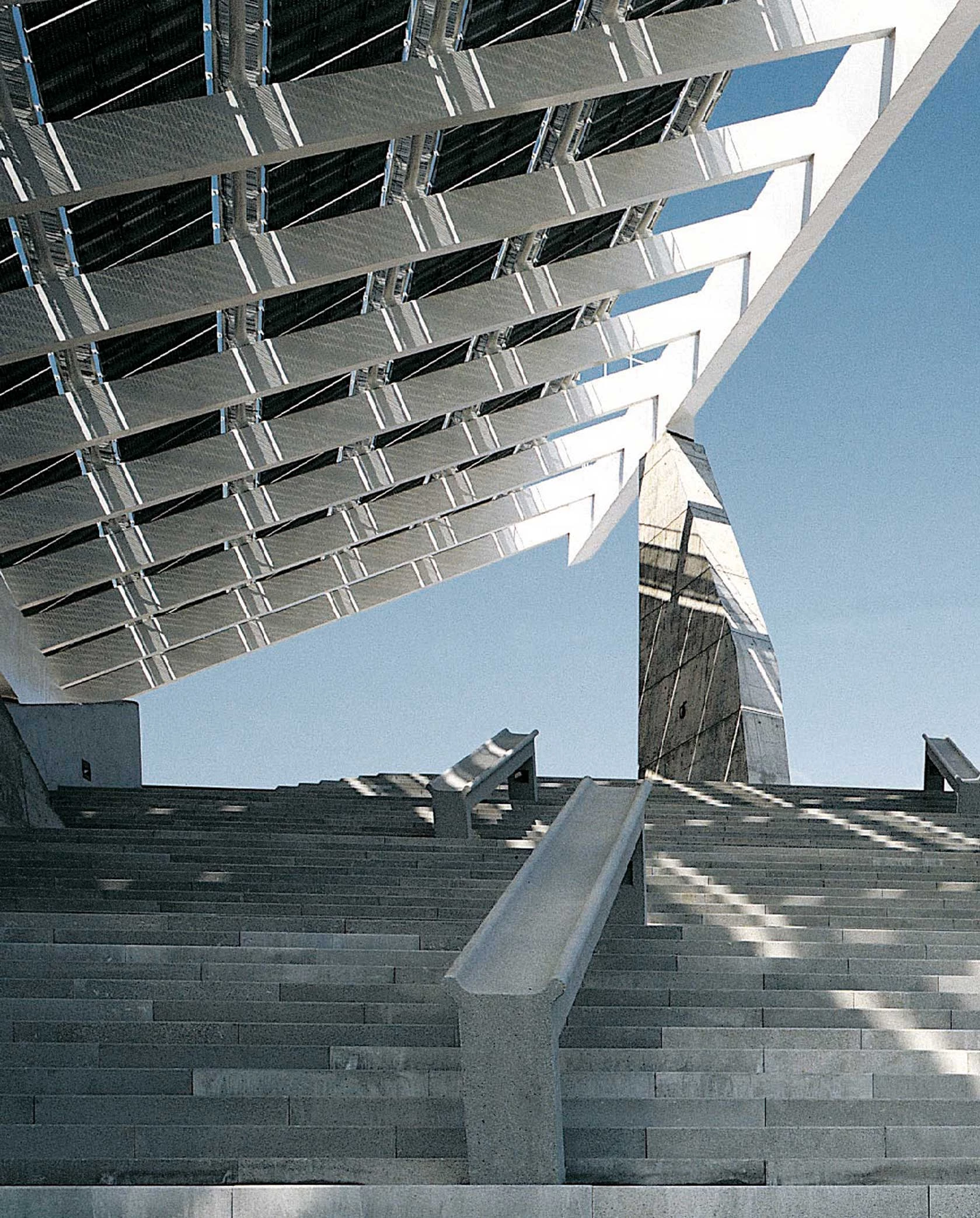 Un plano al bies inclinado a 35 grados y cuatro patas torcidas de hormigón configuran la pérgola, que ofrece una amplia sombra a los visitantes del Fórum. La superficie fotovoltaica de 4000 m2 recibe el sol y produce energía.