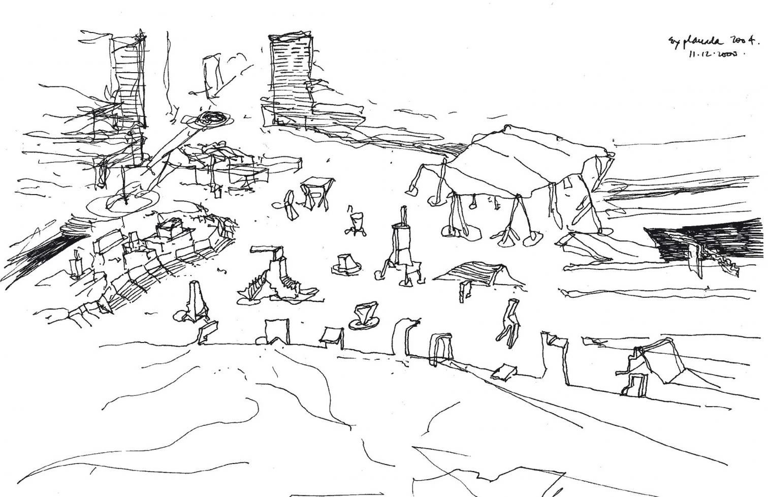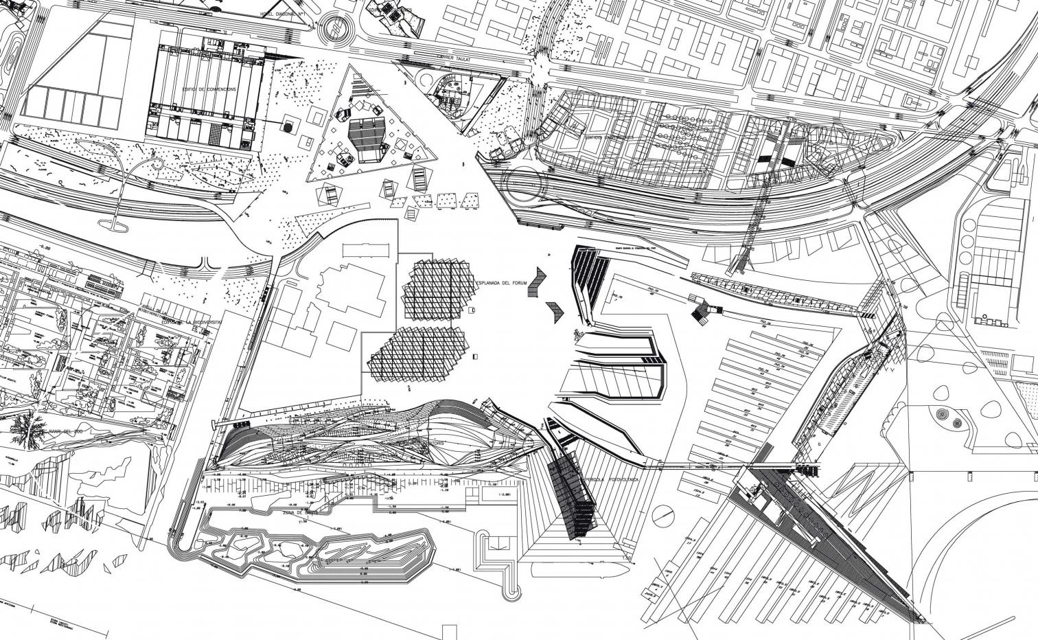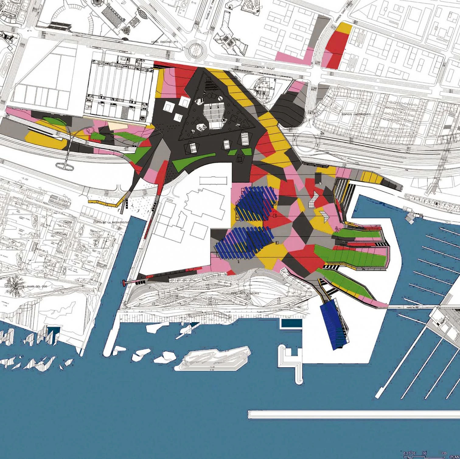 La Diagonal quedaba hasta entonces cortada de forma radical por la Ronda Litoral, una vía rápida de salida de la ciudad que pasó a discurrir bajo el punto de entrada al recinto; la explanada prolonga el ‘brazo’ diagonal que llega de la urbe y lo abre, en forma de ‘mano’ con varios ‘dedos-apéndices’, hacia una escuela de vela, una nave para dique seco, las instalaciones de una depuradora y algunos servicios del puerto deportivo, prolongándose hacia el mar a través de un parque en pendiente que la vincula con las playas; un apéndice en sentido sur y norte rodea futuros edificios universitarios y toma la dirección del barrio de la Mina y de las escaleras de bajada al puerto. Todos los dedos se han diseñado como miradores-acantilados, remates de la plataforma que emergen del agua que baña el puerto y se enfrentan, ya a cierta altura, al horizonte lejano del mar.
