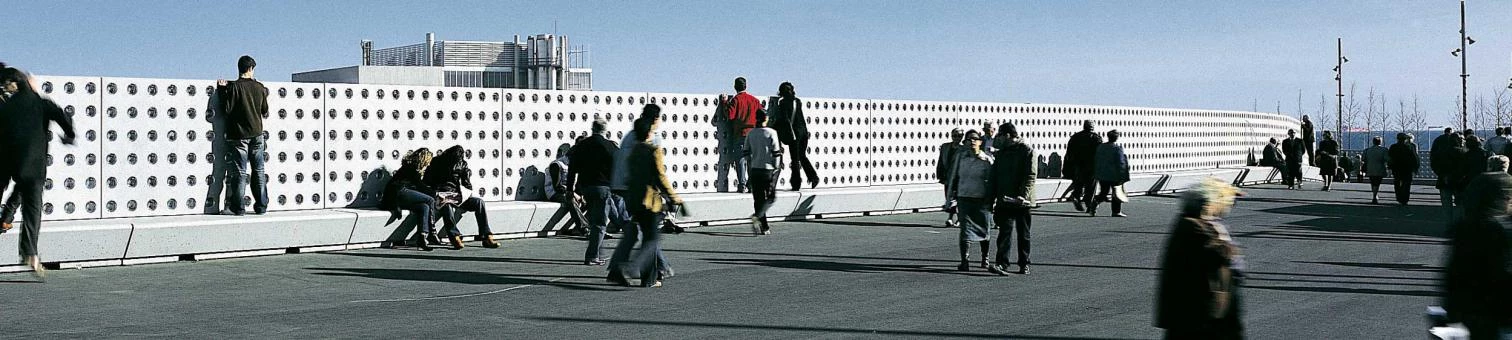 Como un guante de colores, un pavimento de asfalto de cinco tonos diferentes cubre la superficie de la explanada. Desde este nivel, que sirve de base al edificio Fórum y al nuevo centro de convenciones, emergen las chimeneas y servicios de la depuradora. Los bordes de los dedos se definen con una construcción de ‘ha-has’, escaleras continuas que bajan hasta un pasillo perimetral protegido por una barandilla al mismo nivel que el pavimento; la barandilla queda así camuflada y los dedos se contemplan limpios hasta el final, como sucede en los muelles. Tanto los elementos de borde como los ‘ha-has’ y los escalones son de hormigón visto.