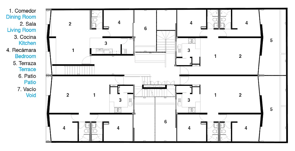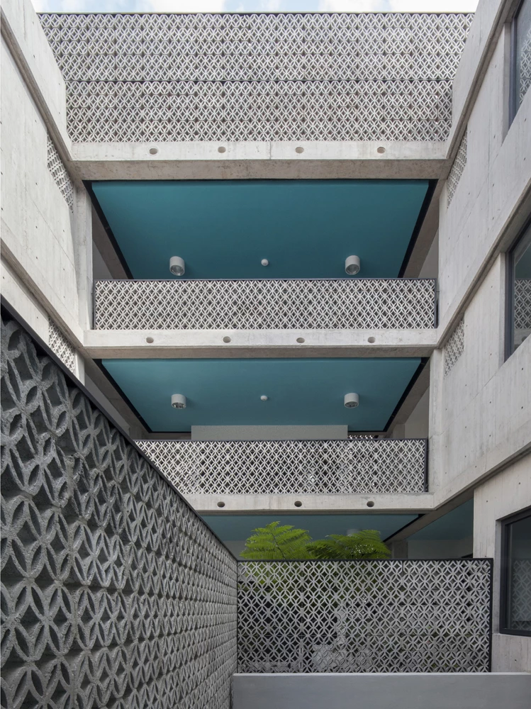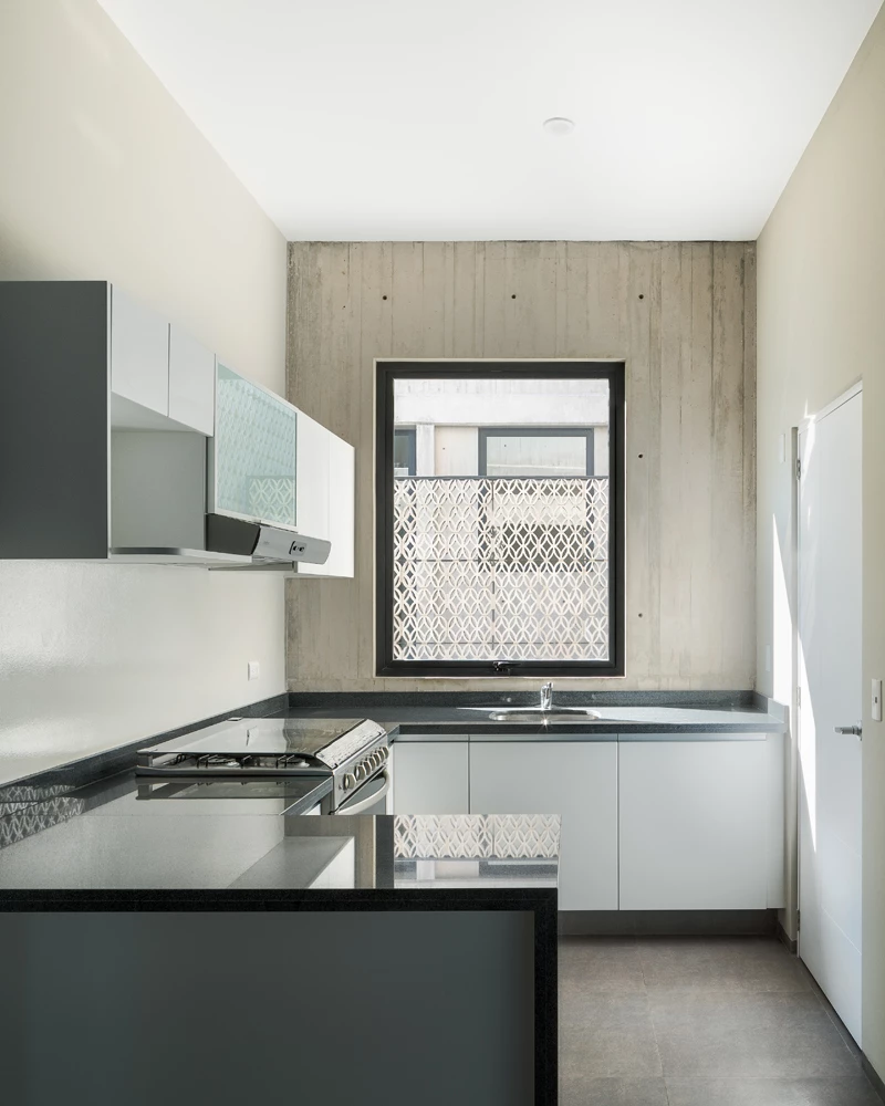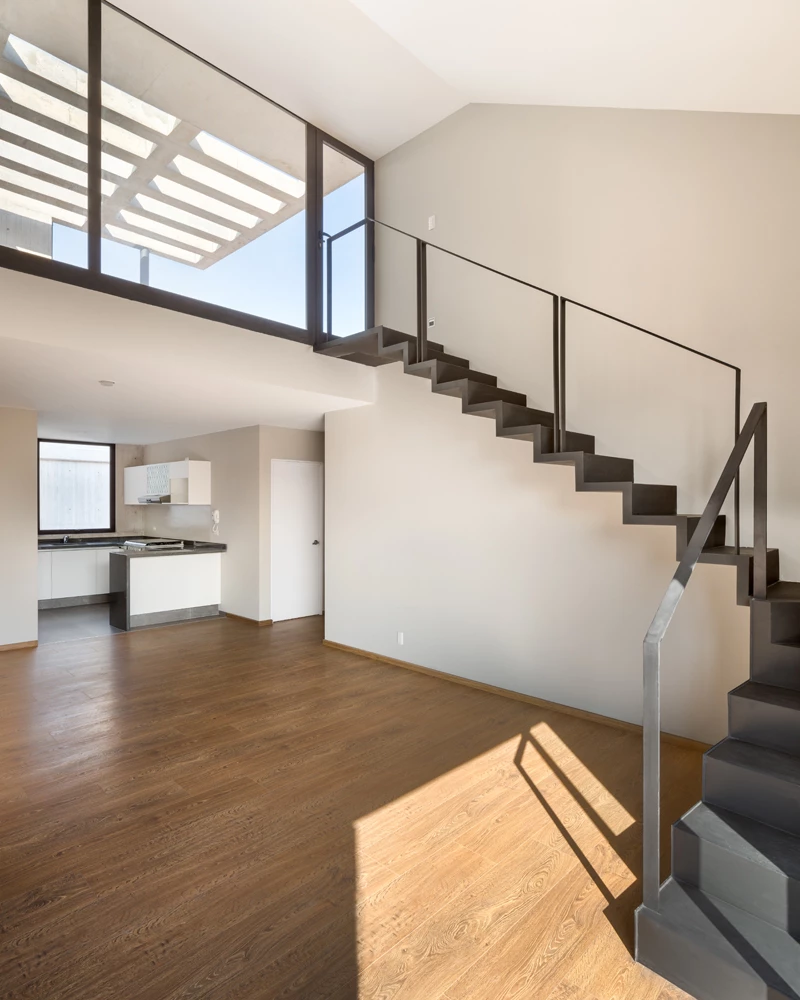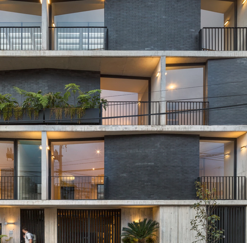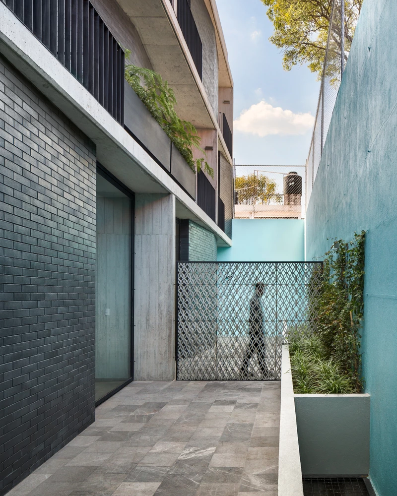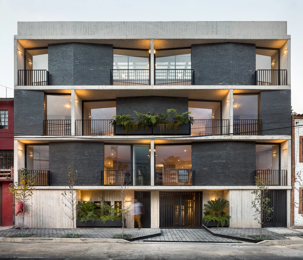 Este bloque de viviendas se levanta en una parcela rectangular de 400 metros cuadrados de un barrio céntrico situado en la zona sur de Ciudad de México. El proyecto de la mexicana Fernanda Canales parte de la premisa de garantizar la privacidad de los residentes, mientras optimizan las vistas con amplios ventanales y terrazas. Tres niveles albergan doce residencias, que oscilan entre los 70 y 90 metros cuadrados, mientras una planta semienterrada está destinada a aparcamientos, almacenaje y áreas de servicio. La azotea alberga las cuatro terrazas pertenecientes a los dúplex de la última altura. Todos los apartamentos se vuelcan hacia patios intermedios que aportan ventilación cruzada y luz natural, los cuales están conectados por una escalera con celosías de hormigón. Fernanda Canales Rafael Gamo Sandra Pereznieto