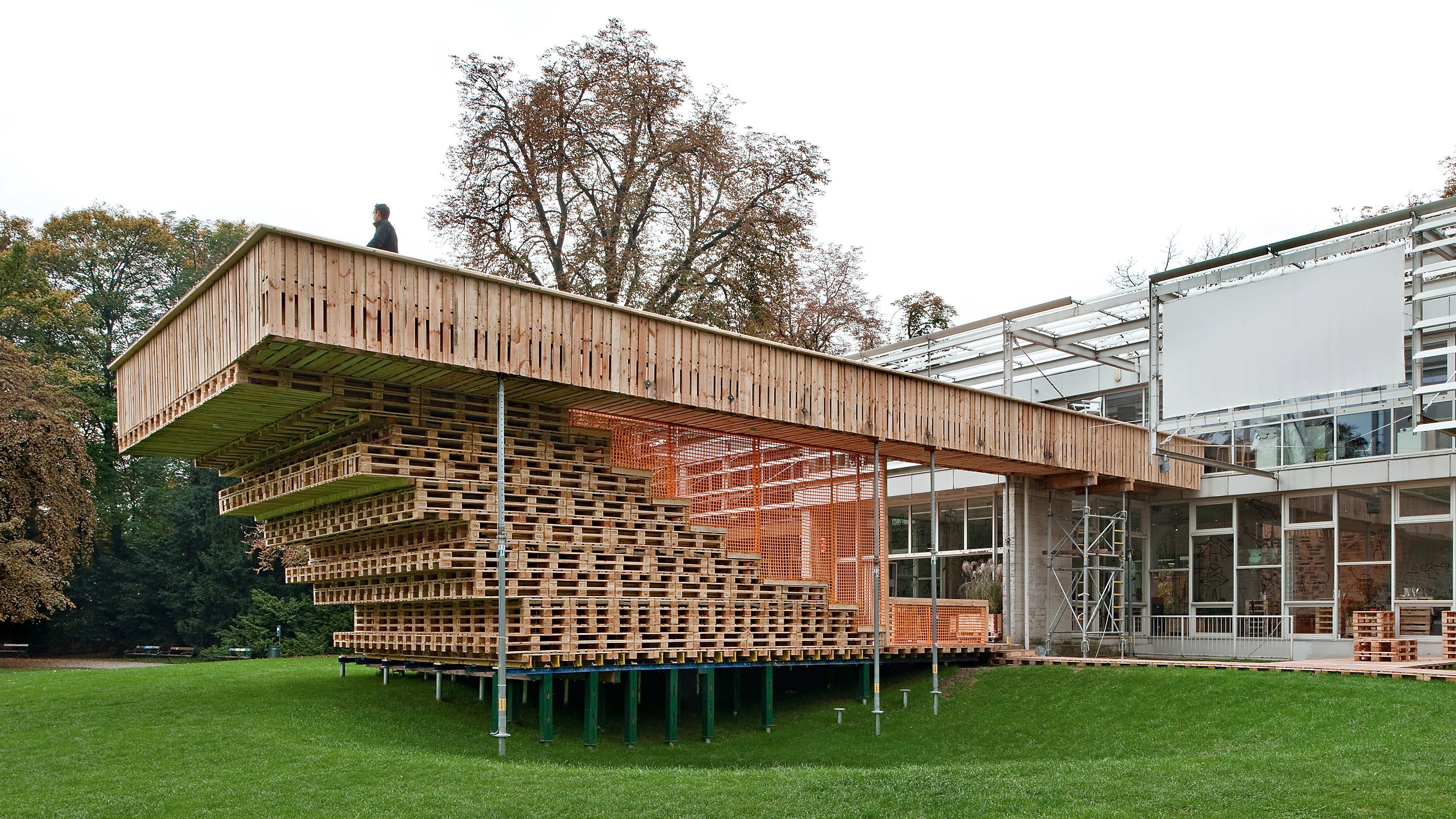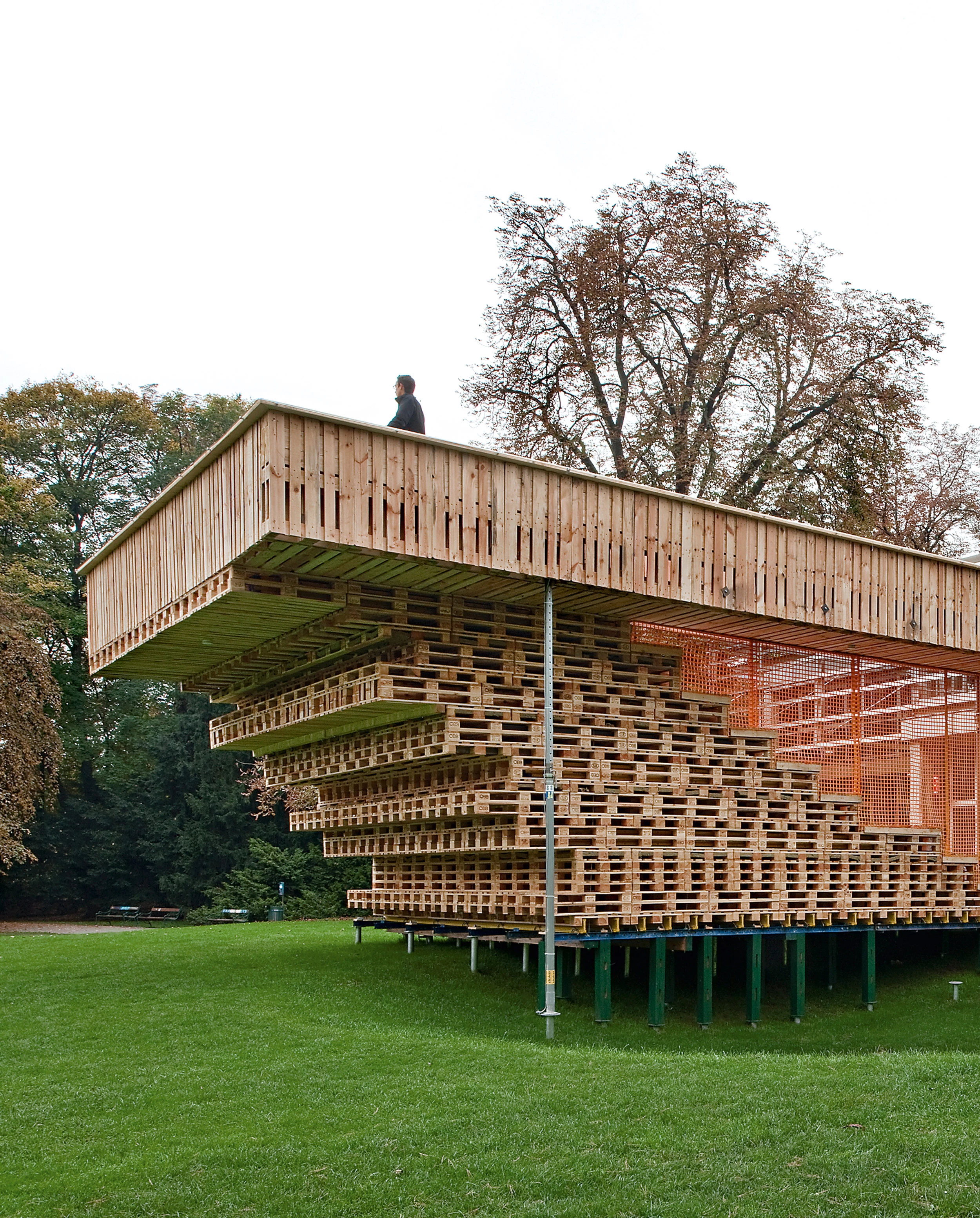 Lo más interesante de la intervención consistió, sin embargo, en los materiales seleccionados y el modo en que fueron empleados. Toda la pieza se construyó con palés normalizados, utilizados como módulos constructivos reciclables apilados a modo de ladrillos, que se alquilaron con fines tectónicos durante el tiempo en que duró el festival, para ser finalmente desmontados y devueltos a su uso convencional una vez terminado el evento, demostrándose con ello que un nuevo tipo de monumentalidad ligera, reciclable, participativa e irónica puede ser posible.