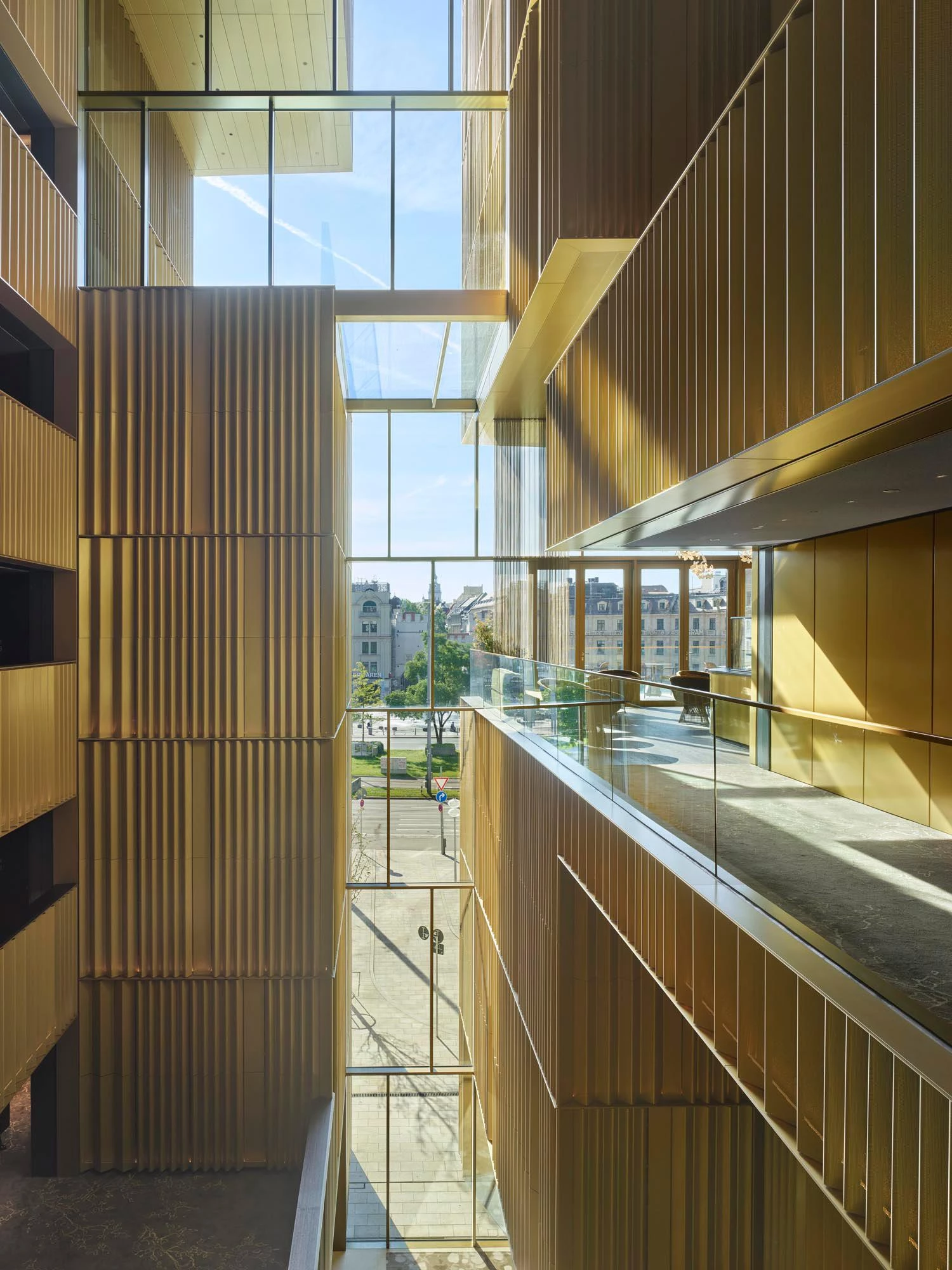 Los materiales elegidos son el resultado de la voluntad de destacar la oposición entre el volumen y el vacío: las fachadas de piedra caliza quedan en el mismo plano que los grandes vidrios de las ventanas, conformando la imagen de un sólido volumen pétreo. En contraste con el mismo, el atrio, protagonista del espacio, está revestido con un único material tanto en el interior como en el exterior: una piel metálica ondulada que unifica toda la intervención.