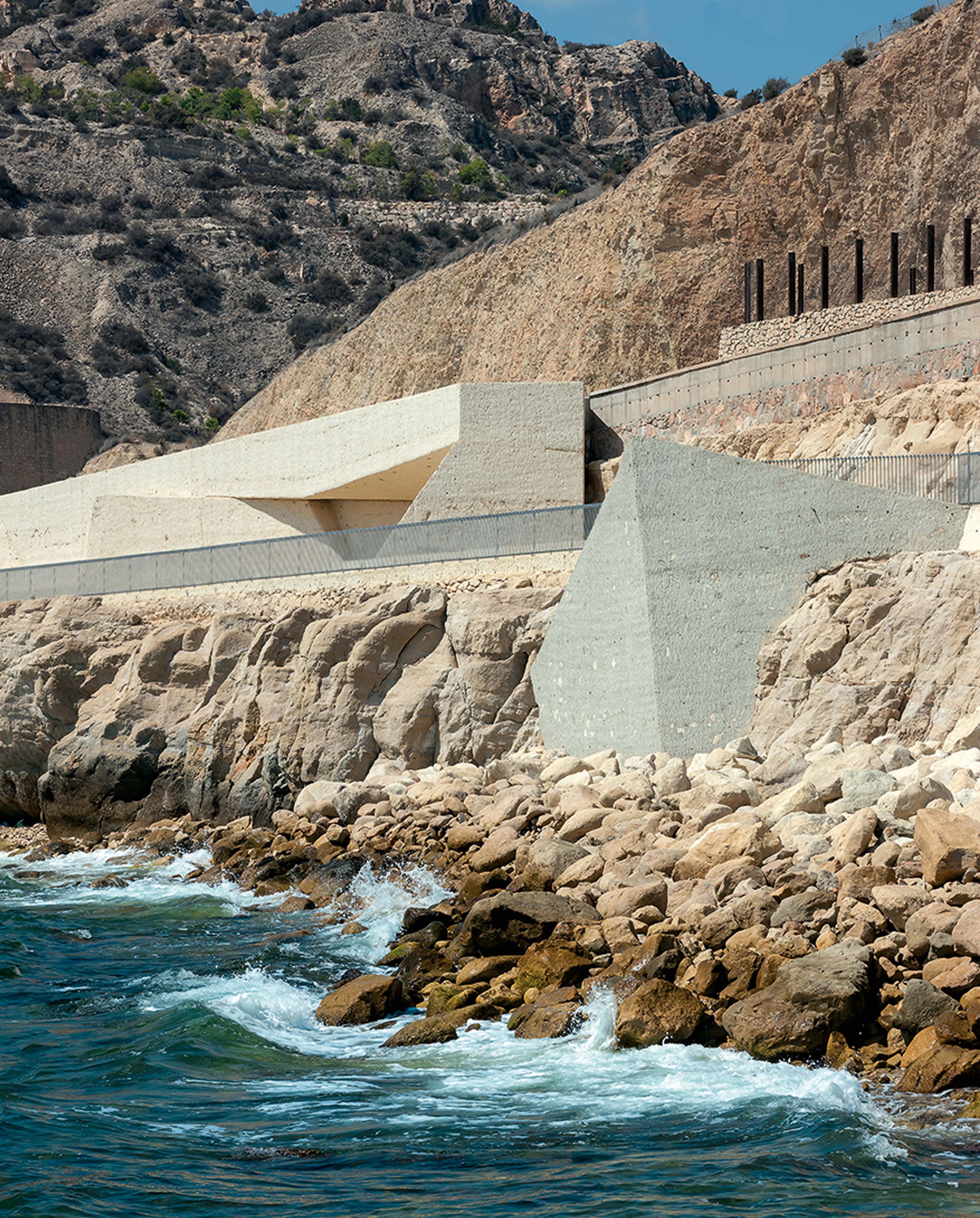 La intervención sobre la Serra Grossa, que dispone una serie de rocas mirador artificiales a lo largo de la costa, recicla los materiales inertes generados por la obra del túnel ferroviario.