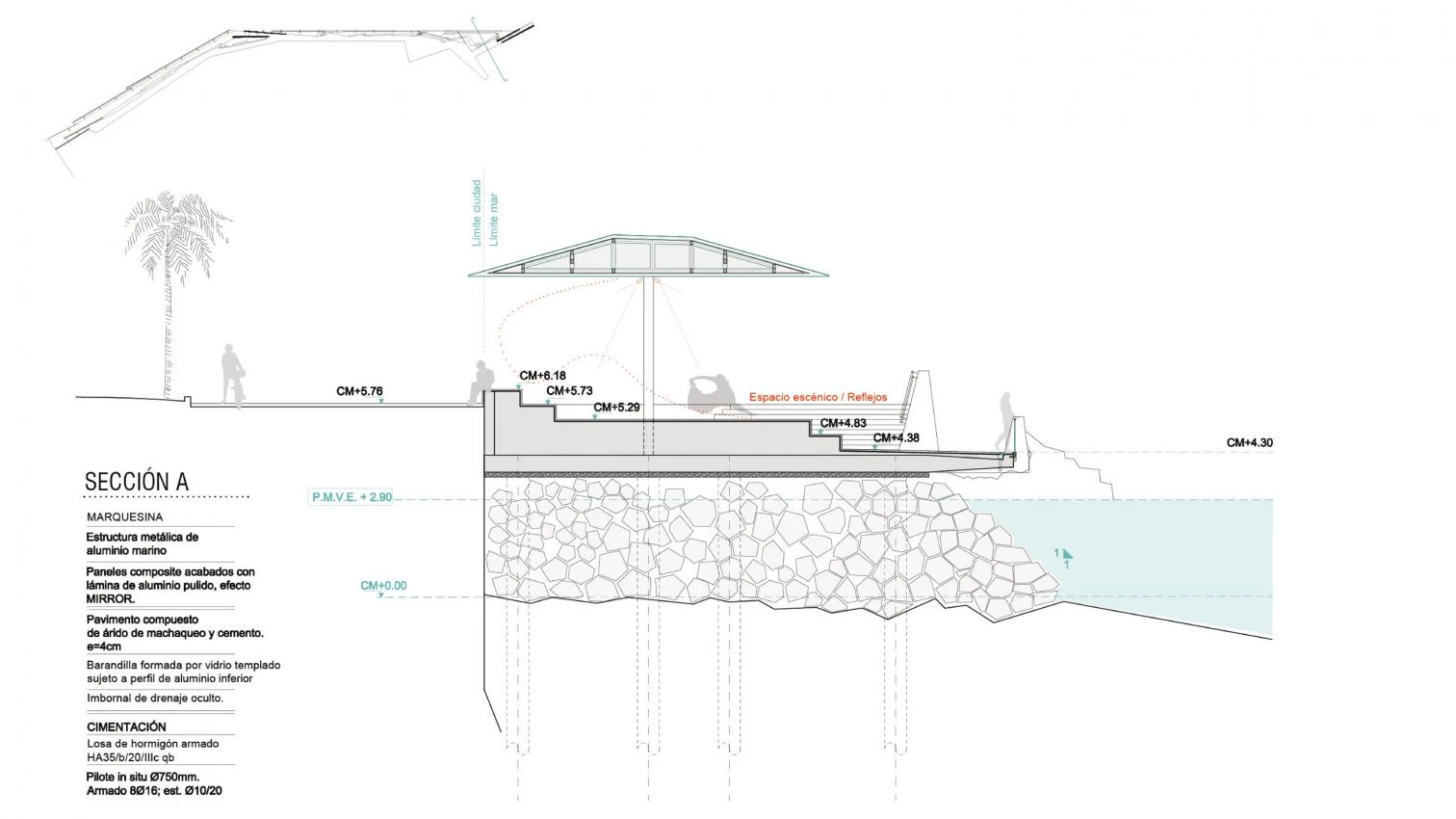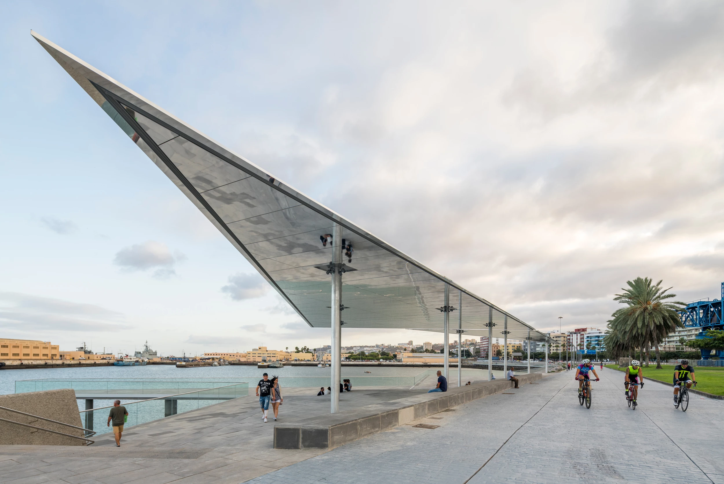 Esta intervención de 5.484 metros cuadrados abarca el frente marítimo de Las Palmas, capital de la isla de Gran Canaria, en el ámbito de la base naval y el muelle de Santa Catalina. El proyecto de la firma local de Pedro Romera García y Ángela Ruiz Martínez está inspirado en los tradicionales barcos de vela latina, extrayendo su geometría triangular para adaptarse al entorno. El entrelazamiento de las marquesinas genera un juego de reflejos en las superficies espejadas. La formalización del proyecto se resuelve con dos materiales (hormigón y vidrio), y con tres estratos a tres cotas distintas. La primera está enrasada con el paseo existente, repitiendo el material utilizado en este para generar continuidad. Los otros dos estratos están uno y dos metros por debajo por debajo del paseo. Por último, una gran terraza suspendida eleva al ciudadano sobre el mar.