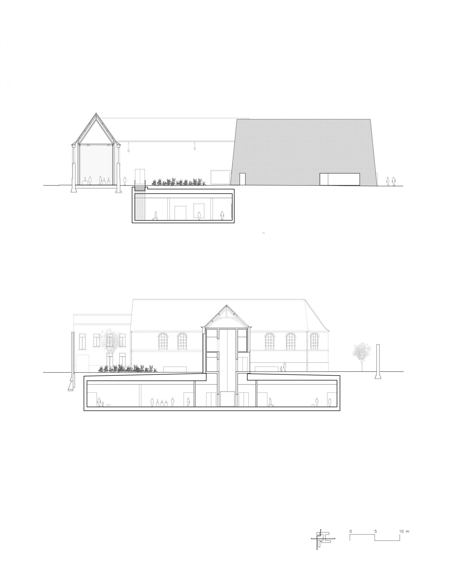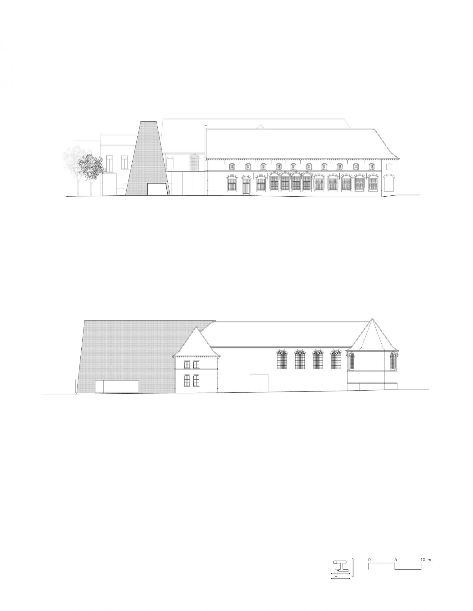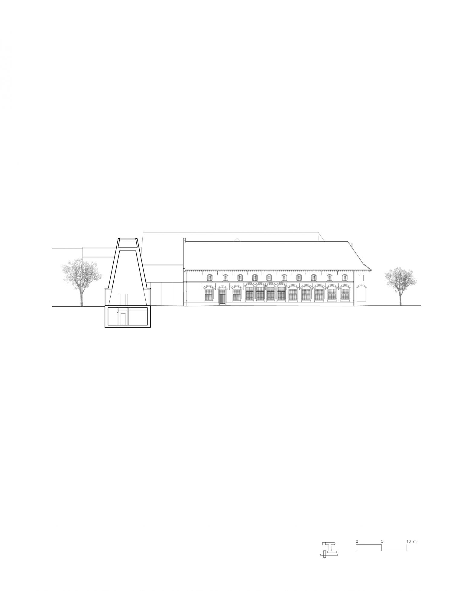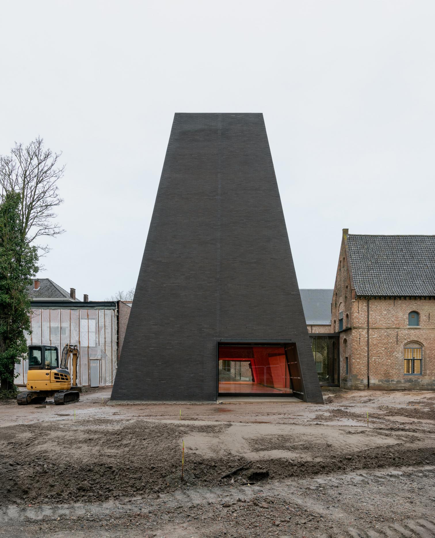 La intervención consolida la capilla y los dormitorios conventuales, incorpora un espacio expositivo subterráneo y añade un nuevo pabellón revestido en ladrillos de tonalidades oscuras, realizados a medida, que incorporan materiales reciclados. La presencia distintiva de esta pirámide truncada establece un diálogo con las construcciones históricas. Su geometría remite a la verticalidad de las cubiertas inclinadas tradicionales, mientras que su disposición ortogonal se alinea con la lógica compositiva del conjunto original.