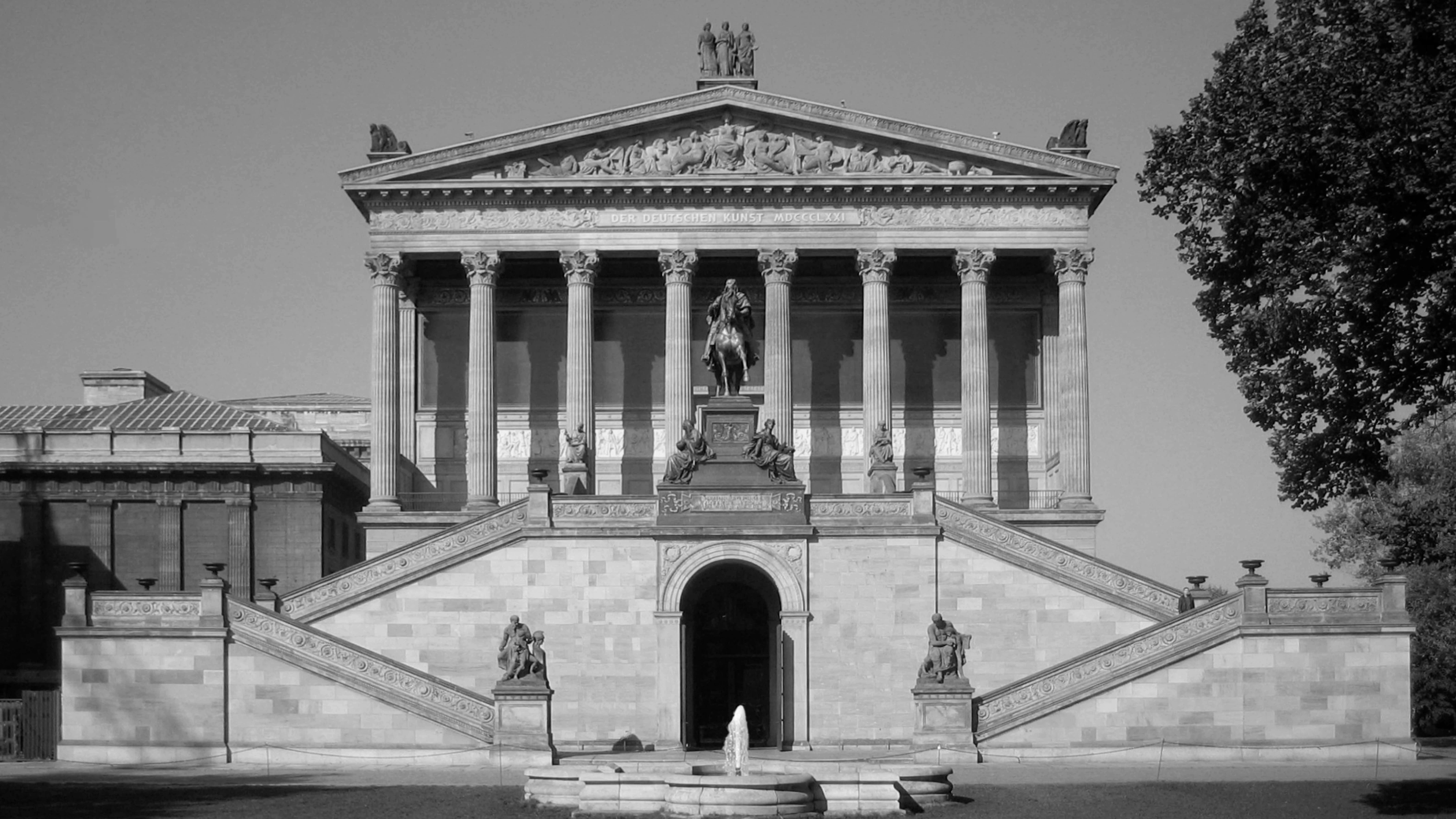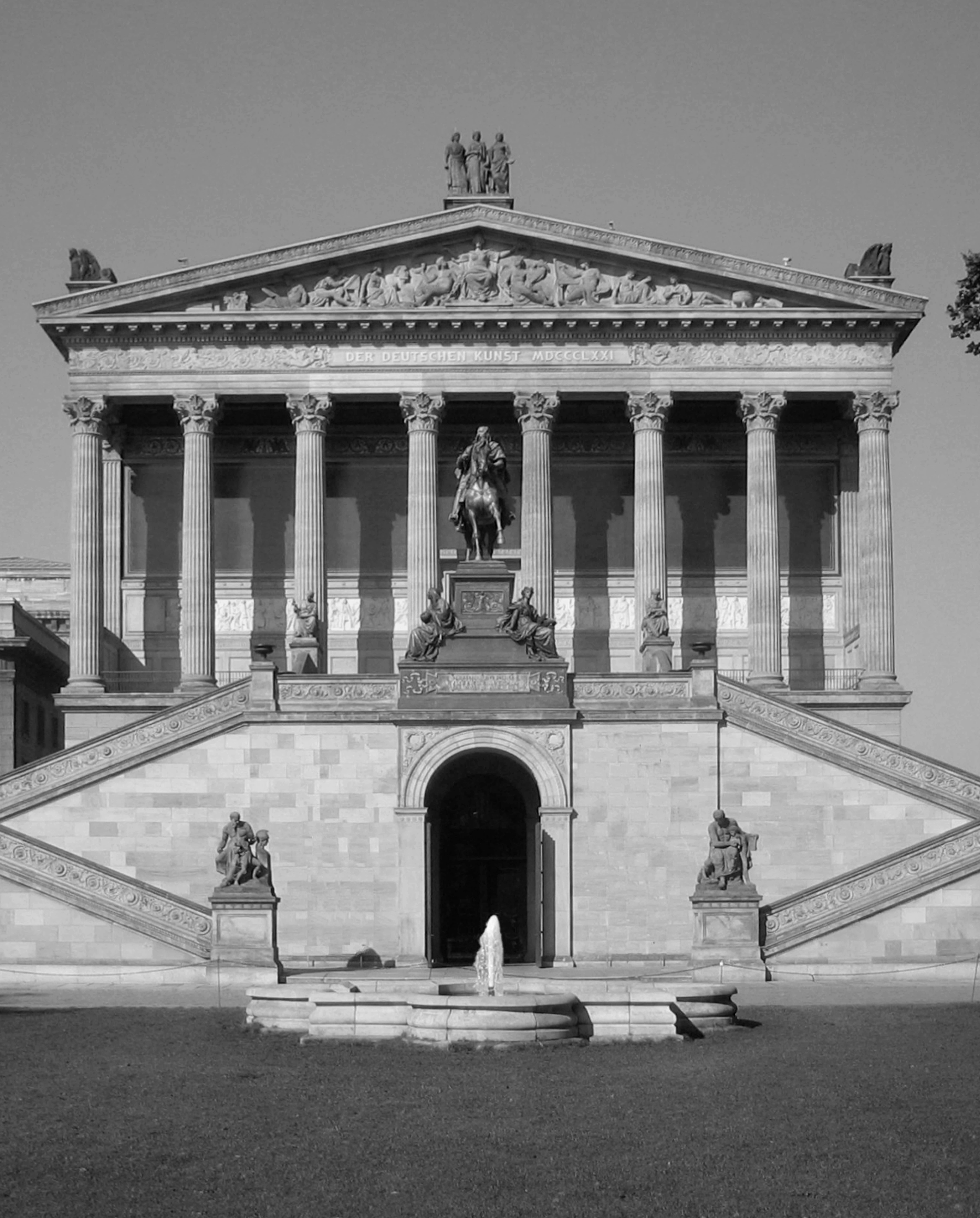 El Altes Museum «el Museo Viejo» cierra el Lustgarten, «jardín de recreo» real; construido por K. F. Schinkel 1823-30. Detrás de él, el Museo Nuevo (F. A. Stüler, 1843-47) todavía en ruinas, y la Galería Nacional al borde del río Spree (Stüler y Strack, 1843-499).