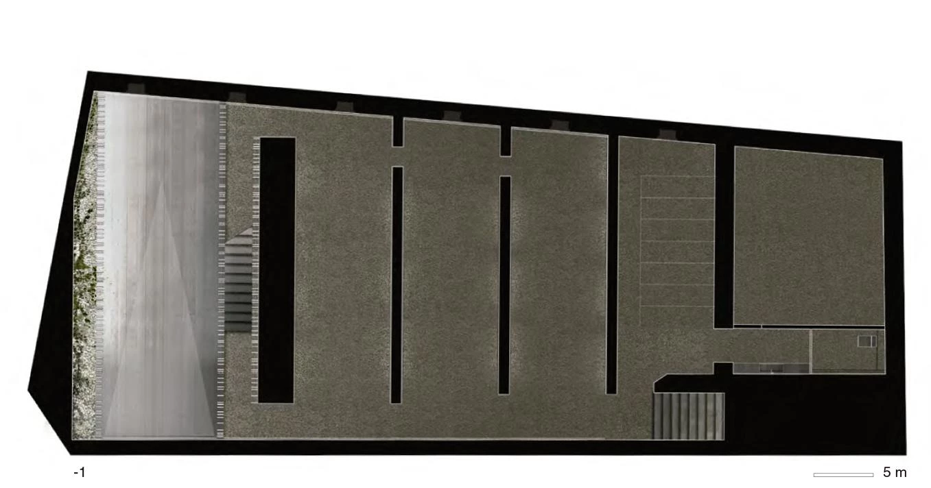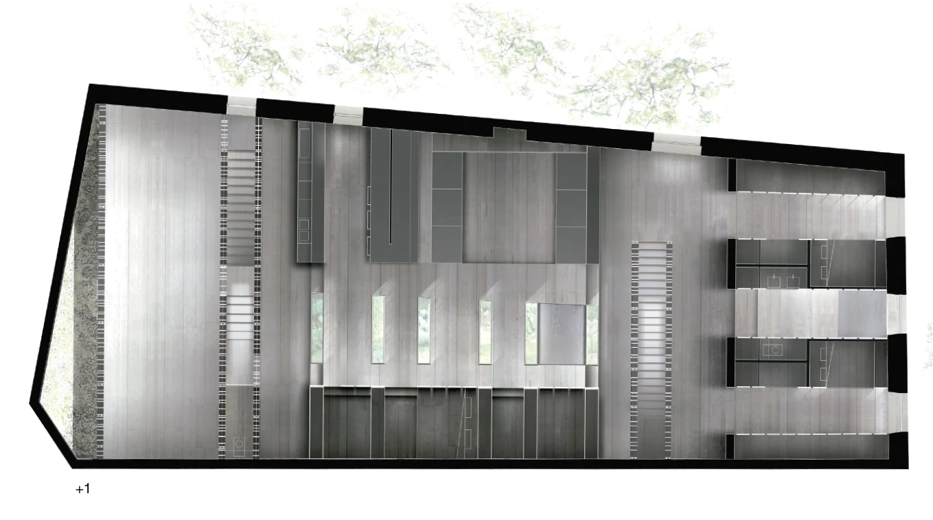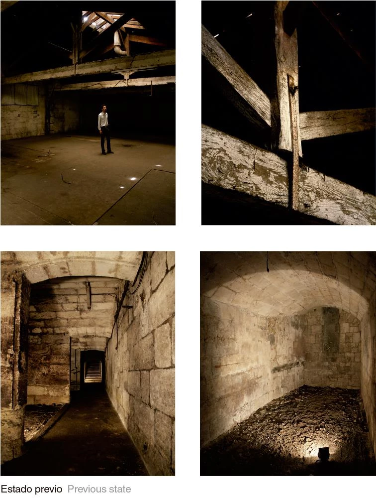 Situado en la ciudad vieja de Burdeos, el proyecto plantea la renovación de una antigua construcción empleada originalmente como almacén y que ofrece bellos espacios abovedados que funcionaban como bodegas para el acopio de pescado y víveres. La actuación pretende, además, revivir la actividad de la zona aprovechando su céntrica localización y la existencia de un acogedor jardín que linda con la propiedad. Por ello, se plantea su reconversión en un edificio de uso mixto en el que conviven una pequeña galería de exposiciones, un taller de arquitectura y la vivienda de uno de los integrantes del estudio. La separación de lo público y lo privado define la actuación, repartiendo los usos en vertical y fragmentando el espacio transversalmente. Las bodegas del sótano se destinan a salas de exposición, mientras que el nivel de calle alberga el atelier de arquitectura y la planta superior, con una característica cubierta abuhardillada de madera, los espacios de vivienda. La cubierta, fragmentada por lucernarios y patios de luz, crea un orden de bandas transversales que organizan los usos y las comunicaciones. En la última de ellas, que contiene programa compartido —la sala central de exposiciones y una gran biblioteca—, la altura de los forjados varía para incrementar su continuidad con respecto al resto de las estancias.