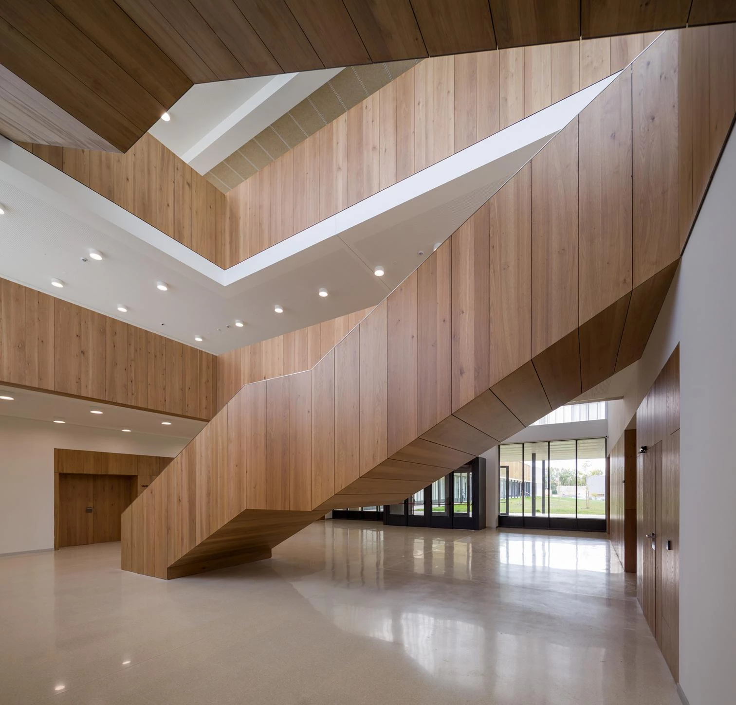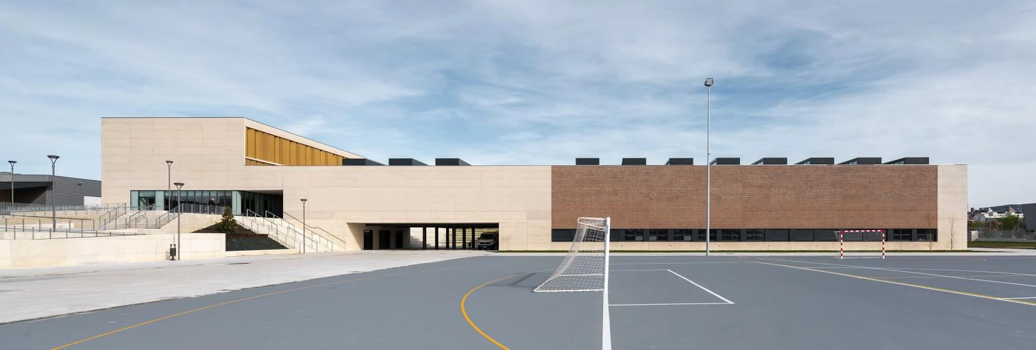 En la localidad de Sarriguren, situada a 4 km de Pamplona, se levanta este conjunto educativo con una superficie construida de 25.000 metros cuadrados. Un volumen rotundo en la cara norte de la parcela frena el habitual viento frío proveniente de los montes próximos a la cuenca y, al mismo tiempo, da la espalda al denso tráfico rodado de la circunvalación de Pamplona. A partir de este volumen se generan el resto de las edificaciones del proyecto, cuatro pastillas que se desarrollan de norte a sur y que varían su tamaño y ubicación en función de su uso, respondiendo así al entorno urbanístico con un encuentro amable y fragmentado en el límite sur para salvar las diferencias de escala.