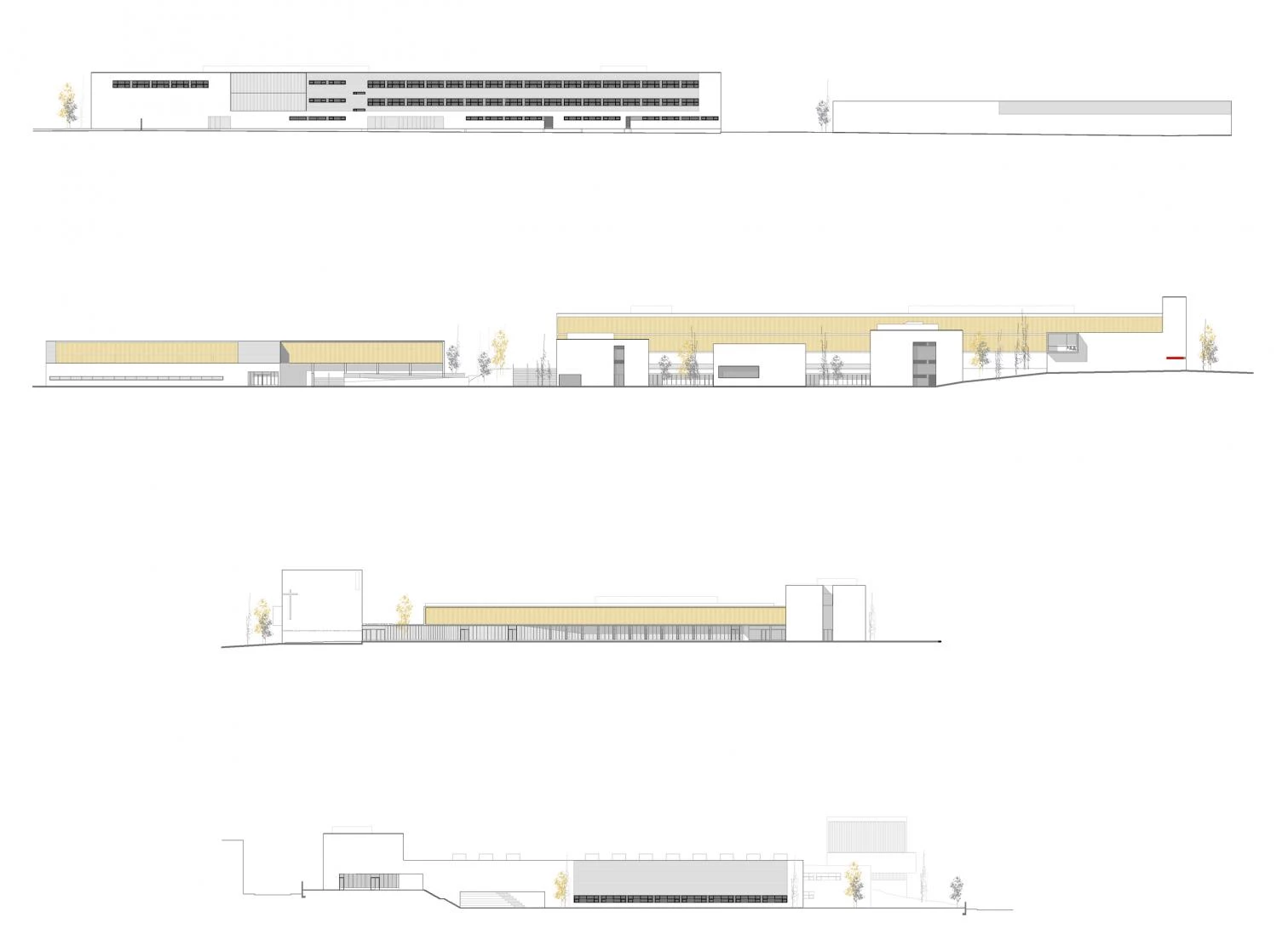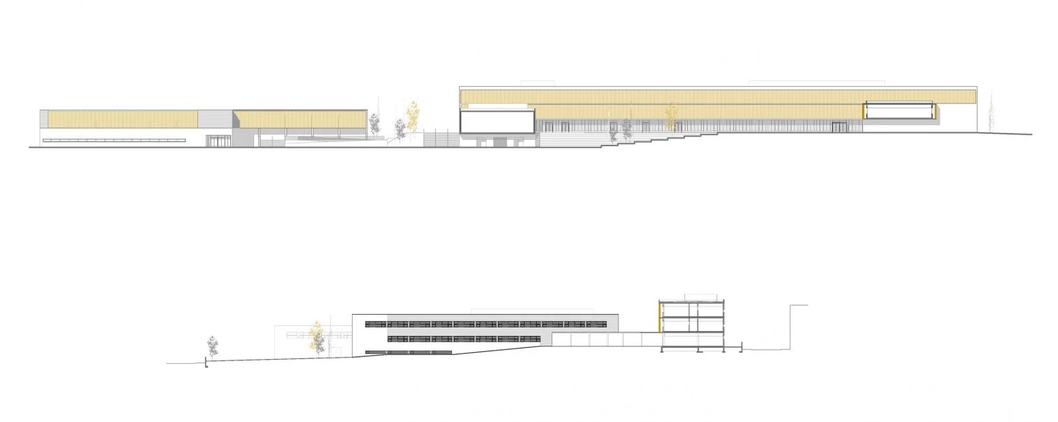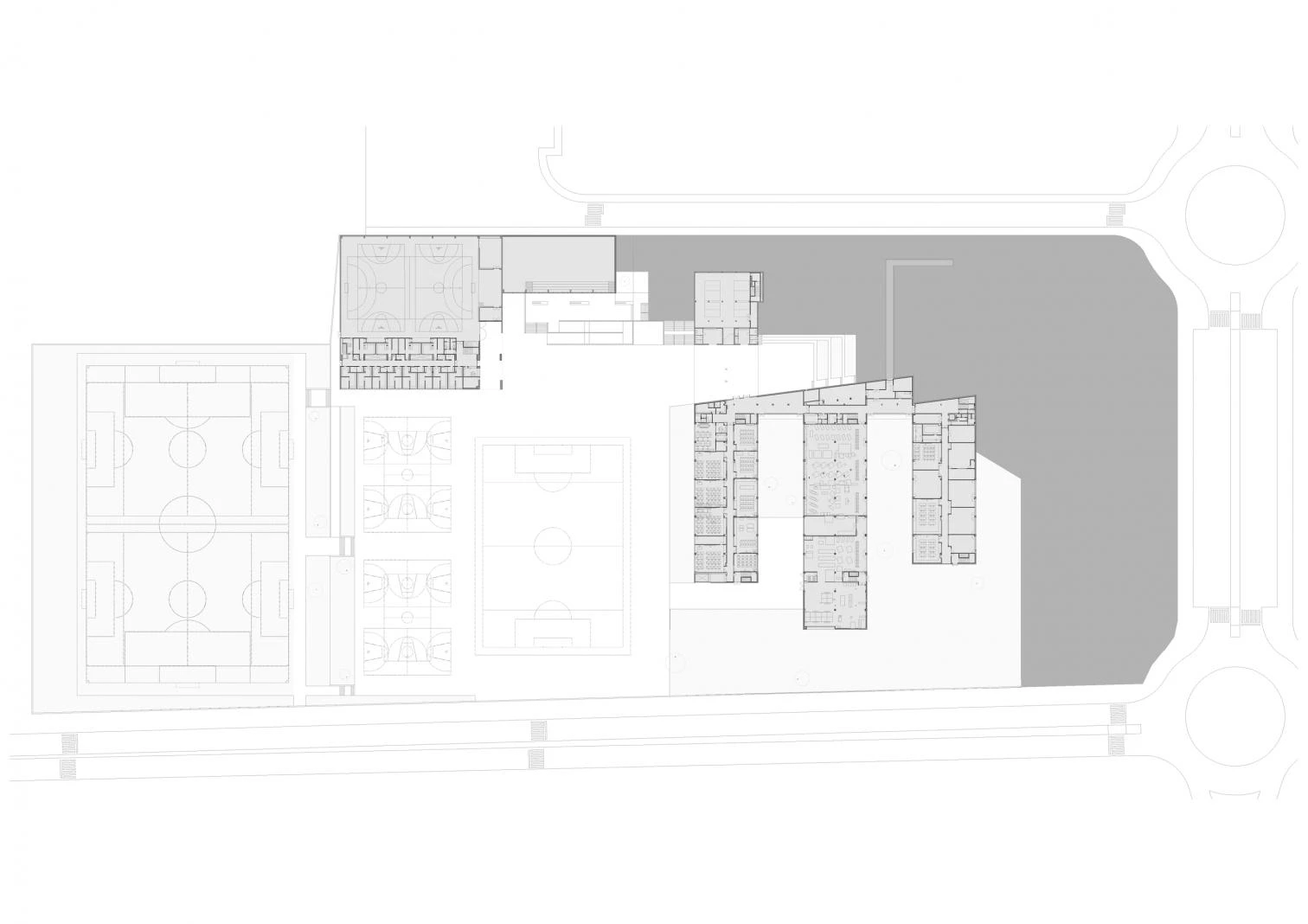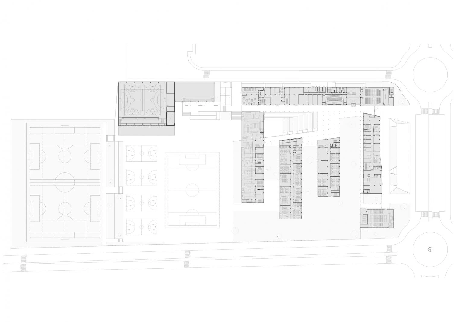 Un espacio porticado conecta cada edificio y protege los recorridos entre ellos hasta desembocar en una gran plaza de encuentro que une la zona educativa y la deportiva. A nivel funcional, el conjunto plantea una primera división entre los volúmenes destinados al ámbito educativo y administrativo, en el este, y los destinados al ámbito deportivo, en el oeste. Dentro de la zona educativa se genera una segunda subdivisión entre la parte docente y la más pública que cierra el conjunto en su lado este y se convierte de esta manera en la fachada de acceso. Con la iglesia presidiendo el volumen en la esquina sureste, el resto de esta edificación horizontal y de baja altura está destinada a usos administrativos y residenciales. El volumen norte, el más alto, alberga las aulas de secundaria y bachiller en sus dos niveles superiores, y el salón de actos, la cafetería y la biblioteca en su planta baja. Los tres edificios restantes alojan los talleres de los diferentes grados de formación profesional.