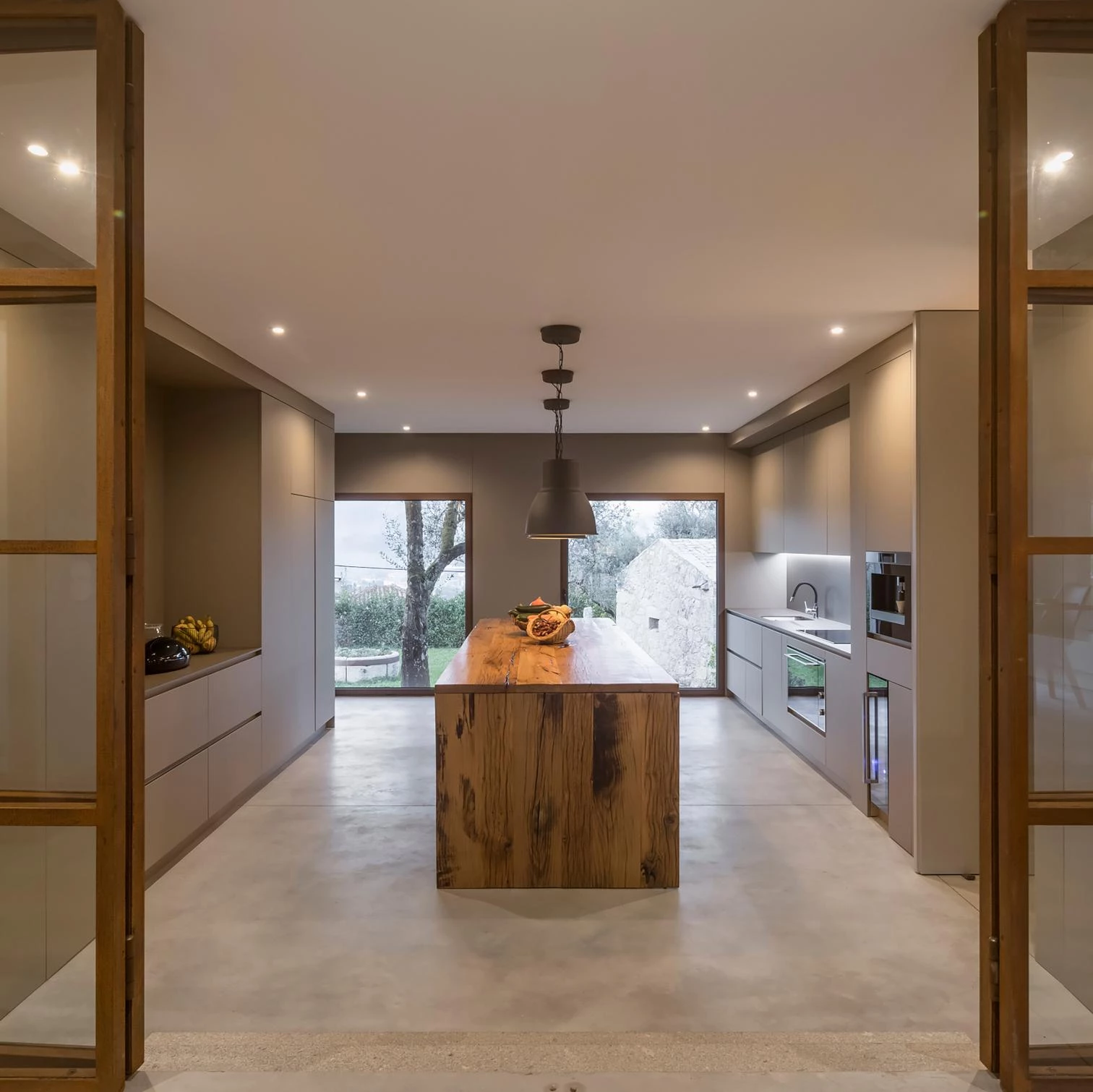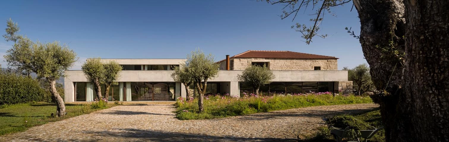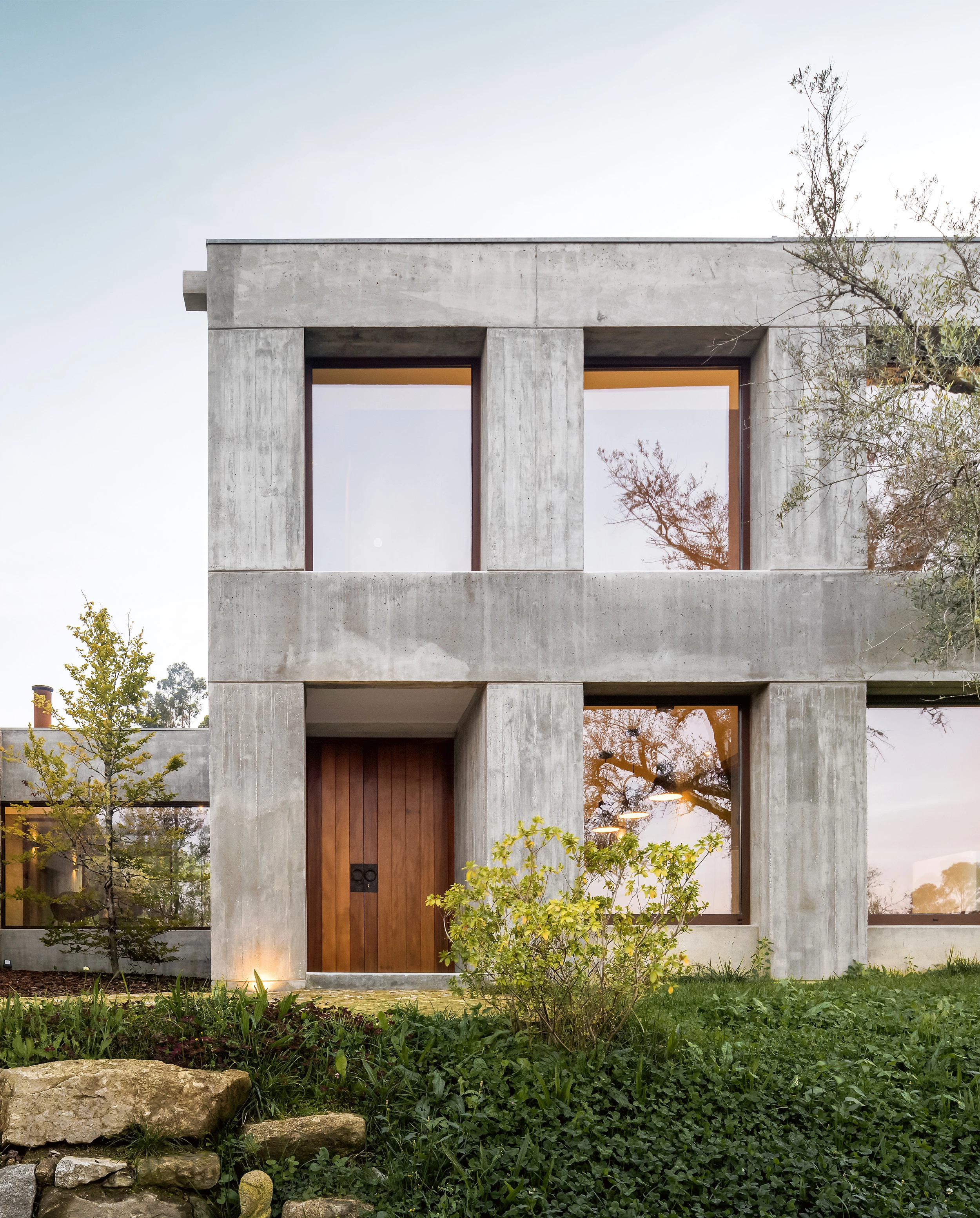 Ocupando el espacio de la antigua era, separado y ligeramente retranqueado respecto a la casa original pero con su misma volumetría rotunda, el segundo cuerpo reinterpreta con su fachada en hormigón visto la composición de la arquitectura vernácula de la zona. Un tercer volumen de perfil bajo, donde se instala la zona más pública, funciona como discreto nexo entre lo antiguo y lo nuevo.