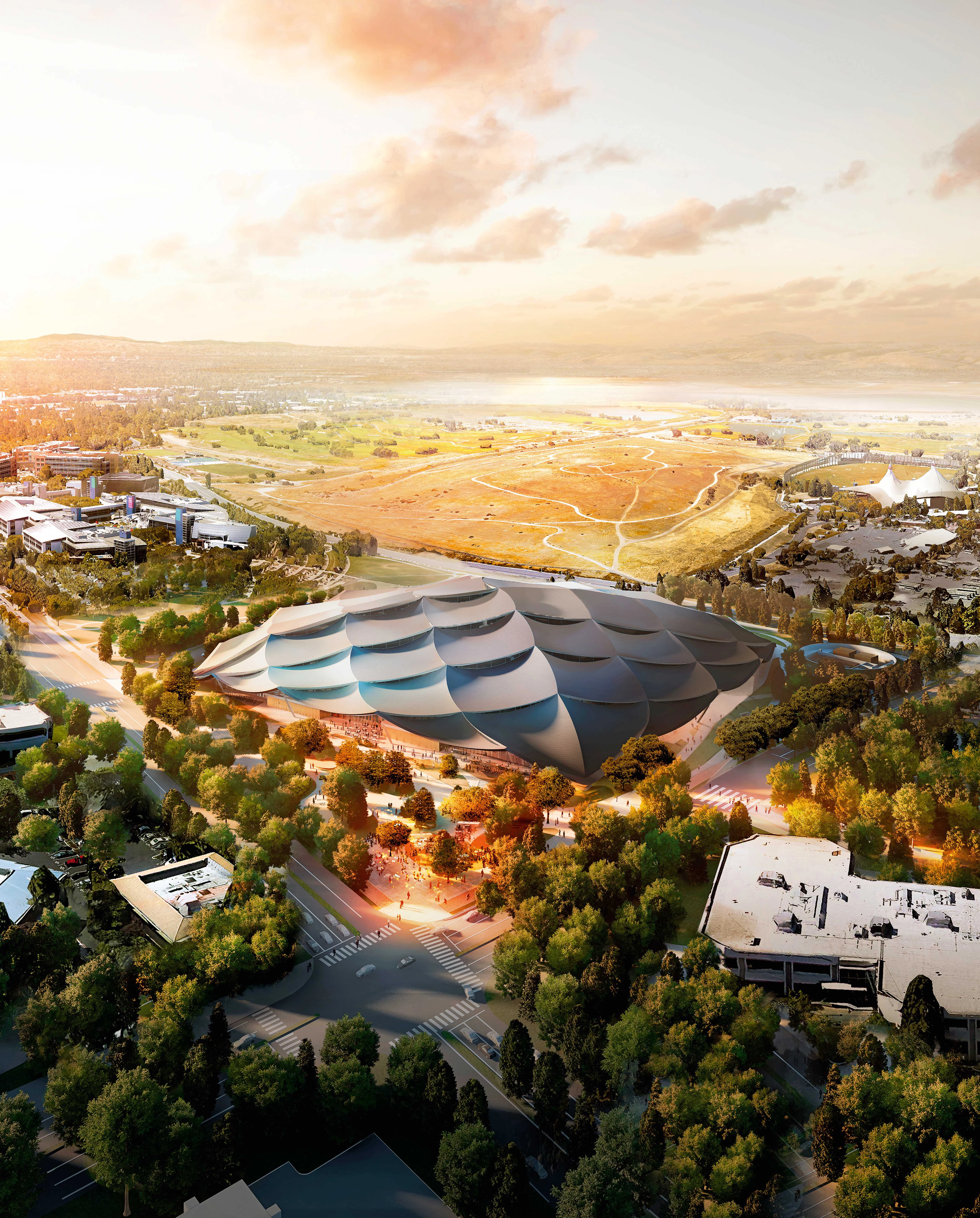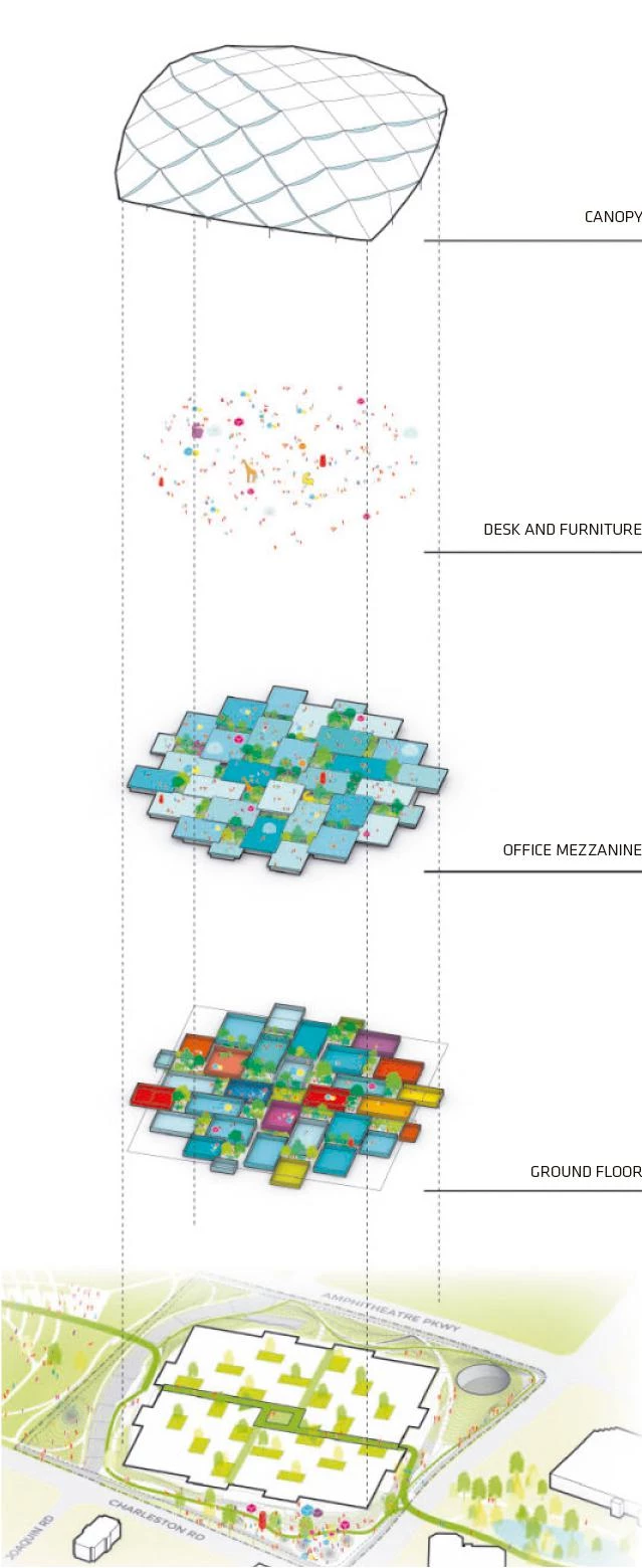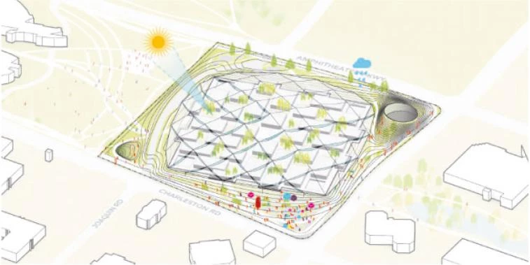 El proyecto para el nuevo campus de Google en Mountain View responde a la veloz expansión y a la constante diversificación de la actividad empresarial de la compañía tecnológica, que han terminado por derivar en una situación organizativa insostenible para sus empleados. La propuesta, que huye de las pretensiones megalíticas a menudo asociadas a la construcción de una gran sede centralizada, presenta, por el contrario, un volumen de escala ajustada, cuya mayor ambición es la de convertirse en un tipo edificatorio flexible en su configuración y en sus dimensiones, adaptable a las necesidades futuras de los trabajadores y de la empresa, y reproducible en otros entornos alejados de Silicon Valley.