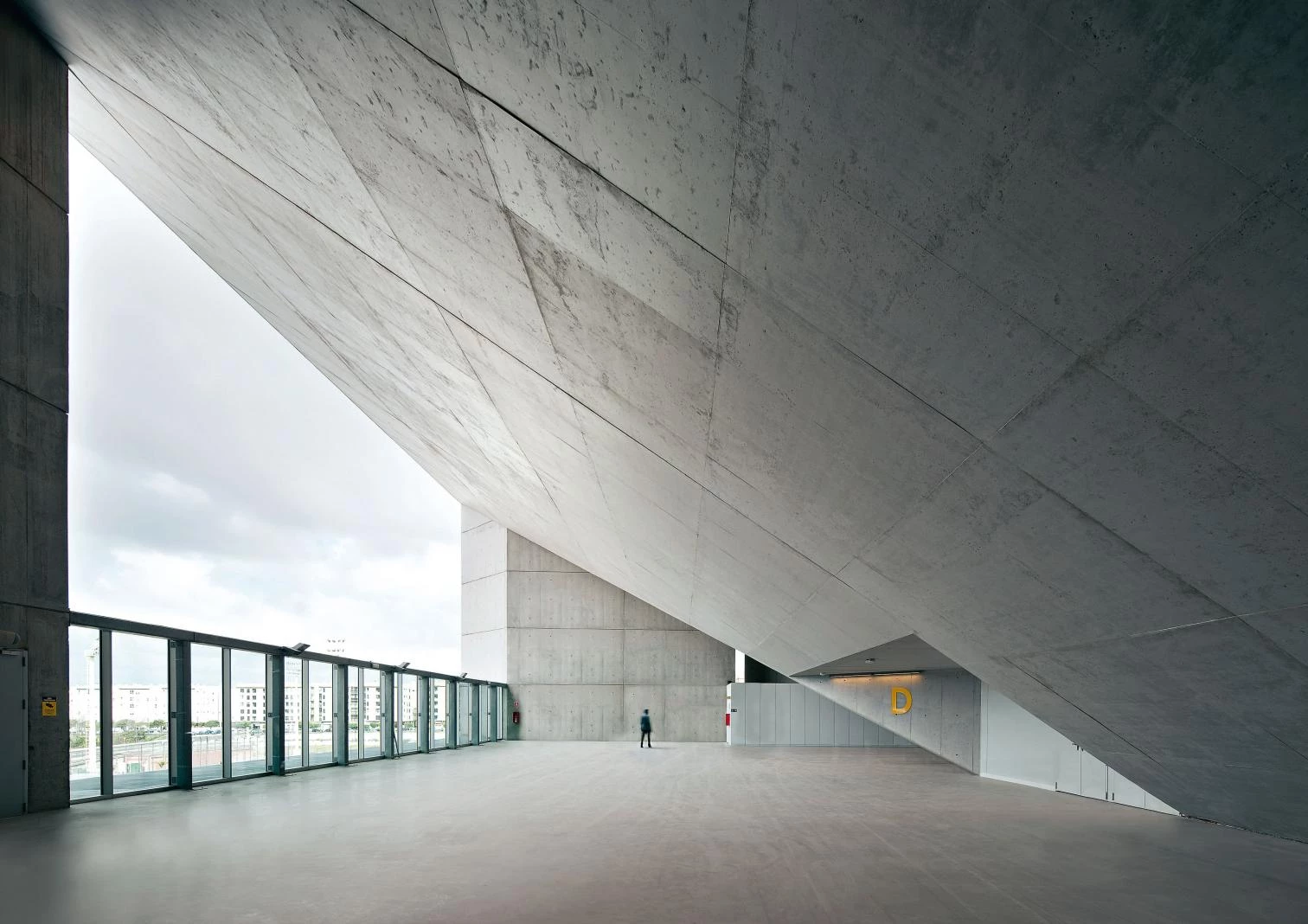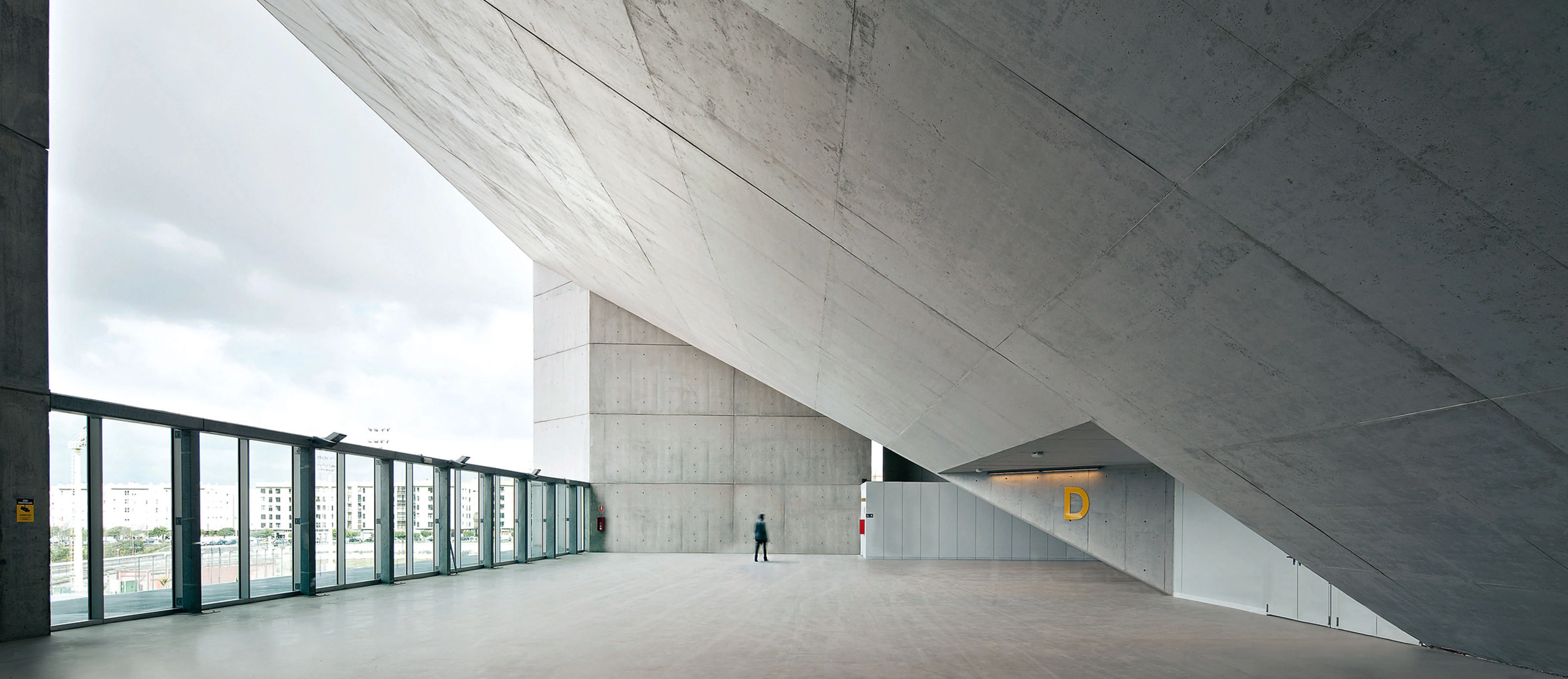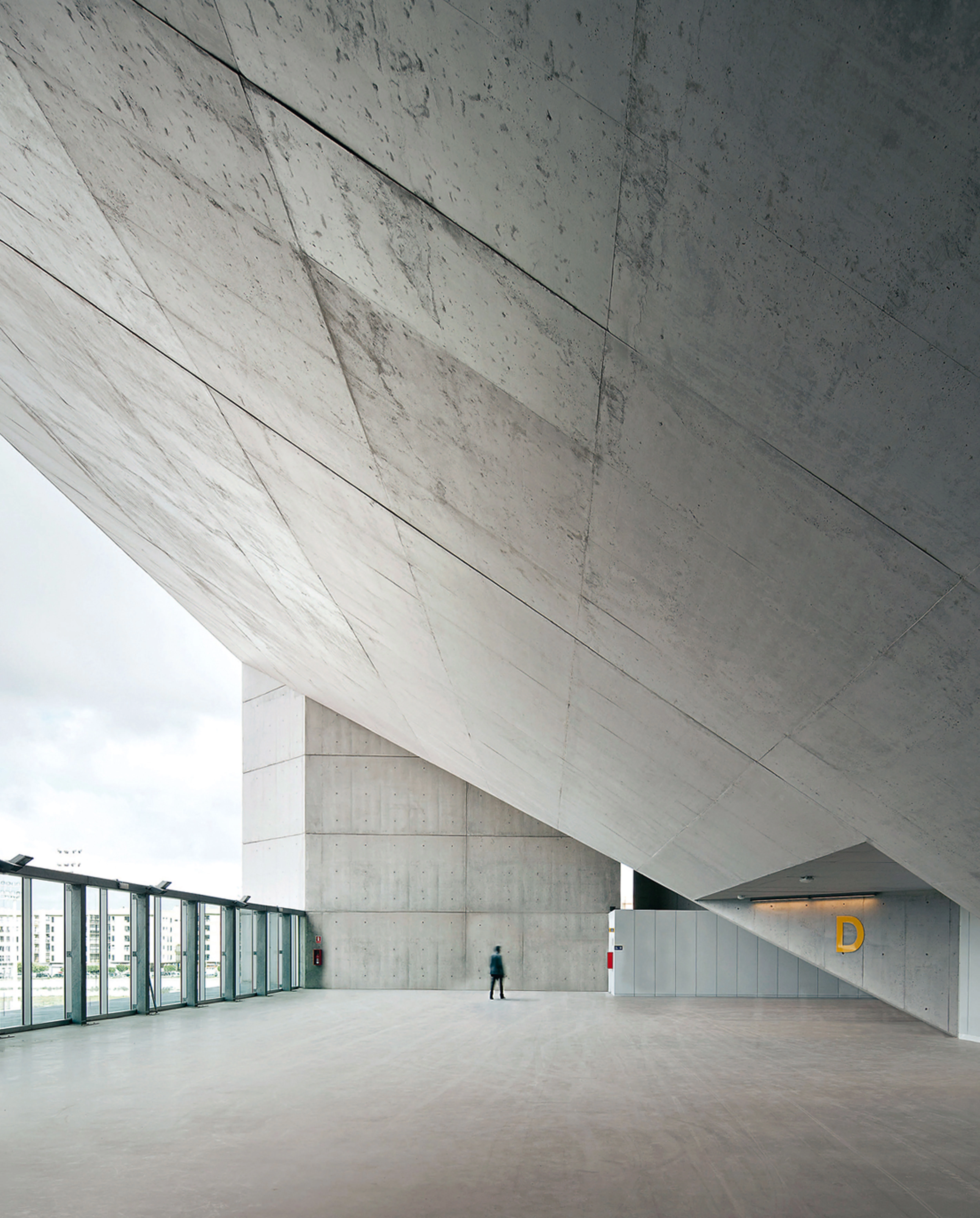 En el recorrido por el espacio deambulatorio, en el que se alcanzan los grandes huecos norte-océano y sur-ciudad, aparecen de forma alterna y controlada huecos verticales de proporción 1/3 que nacen de la sustracción de un módulo de encofrado exterior del enorme bloque de hormigón, y que se refieren al heterogéneo contexto lejano y cercano, lo que explica su libre disposición, y actúan como cuadros verticales de luz que bañan el espacio. El clima canario permite dejarlos abiertos para que el aire circule libremente en todo su interior. En la esquina noroeste el potente muro vertical de hormigón se inclina bailando con la artesa-graderío para introducir luz cenital natural y obtener una atmósfera espacial tensionada mediante diagonales de hormigón y de luz que dotan a este rincón de una singularidad excepcional.