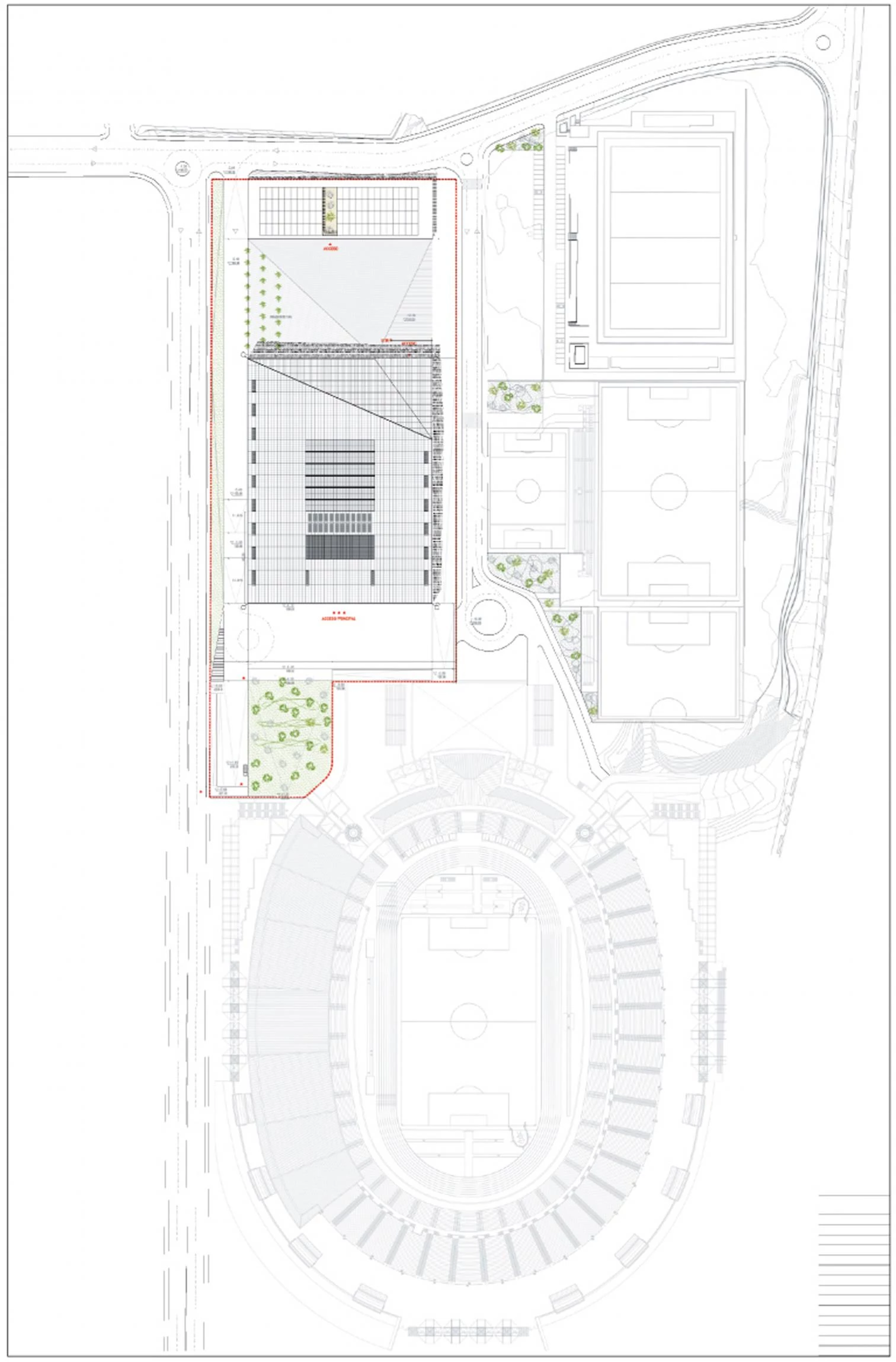 En la plaza sur se genera el acceso principal a través de un gran hueco de 90 metros de luz y 12 de altura, que actúa como un enorme vomitorio absorbiendo al espectador hacia el denominado espacio-artesa: un espacio tallado en hormigón, repleto de circulaciones dirigidas y controladas de espectadores al espacio central de la cancha principal y que alberga los usos complementarios, funcionando como deambulatorio.