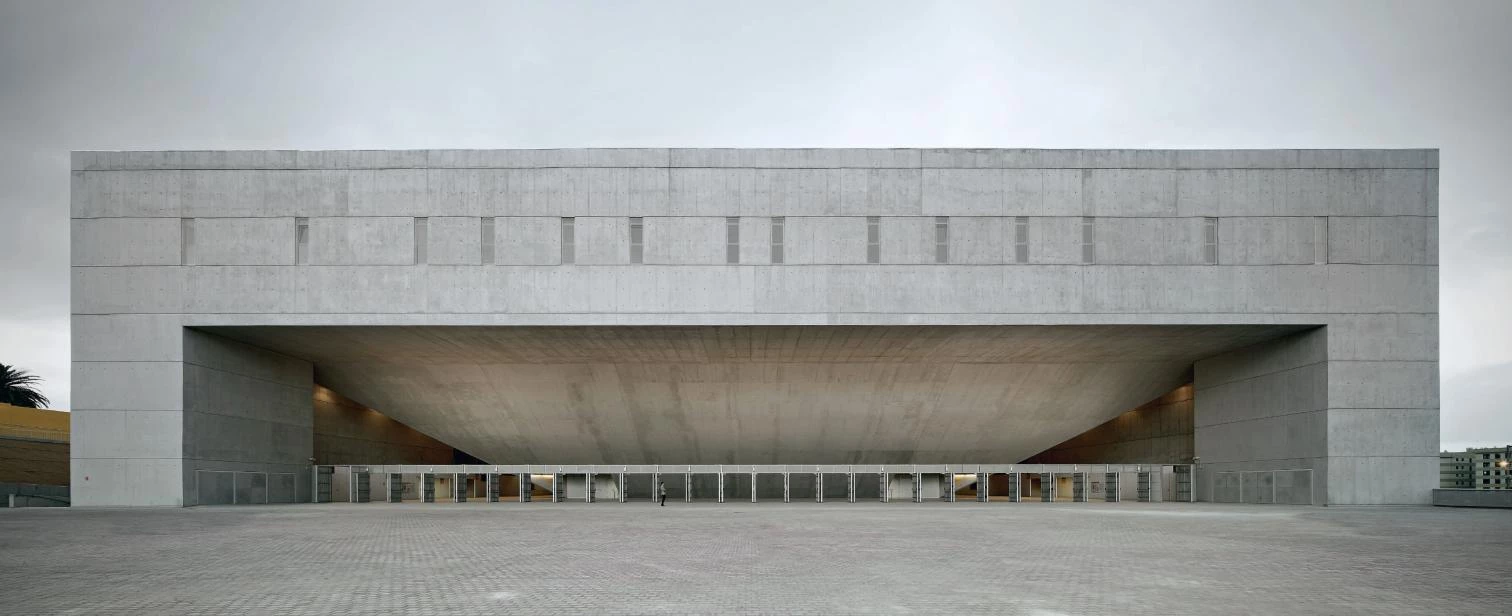 Las particularidades del solar, en la confluencia de carreteras y con pendiente en varios sentidos, llevan a plantear una propuesta capaz de crear un hito urbanístico potente para la imagen de la zona. El edificio aparece como un objeto rotundo y geométrico de hormigón (de 123,50 metros de longitud por 93 de anchura y 21 de altura) manipulado volumétricamente y focalizado en un gran hueco norte que mira por encima del polígono industrial próximo. En esta geometría hermética aparecen tres grandes huecos más que lo dotan de singularidad: el hueco sur, que funciona como acceso principal; el oeste, que mira a las montañas de la isla; y el cenital que derrama luz natural en la cancha central.