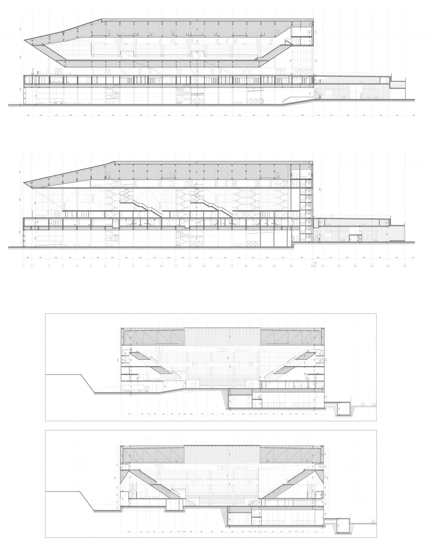 El graderío se construye con cuadernas metálicas de 30 y 40 metros que favorecen los movimientos estructurales de dilatación, empuje y gravedad, haciendo unitario el potente casco de hormigón armado; su estructura en forma de artesa genera, en su intersticio con la caja que lo contiene, un espacio continuo y fluido que es el protagonista del proyecto.