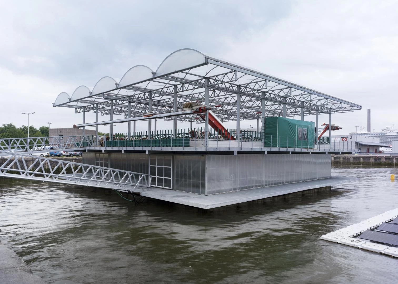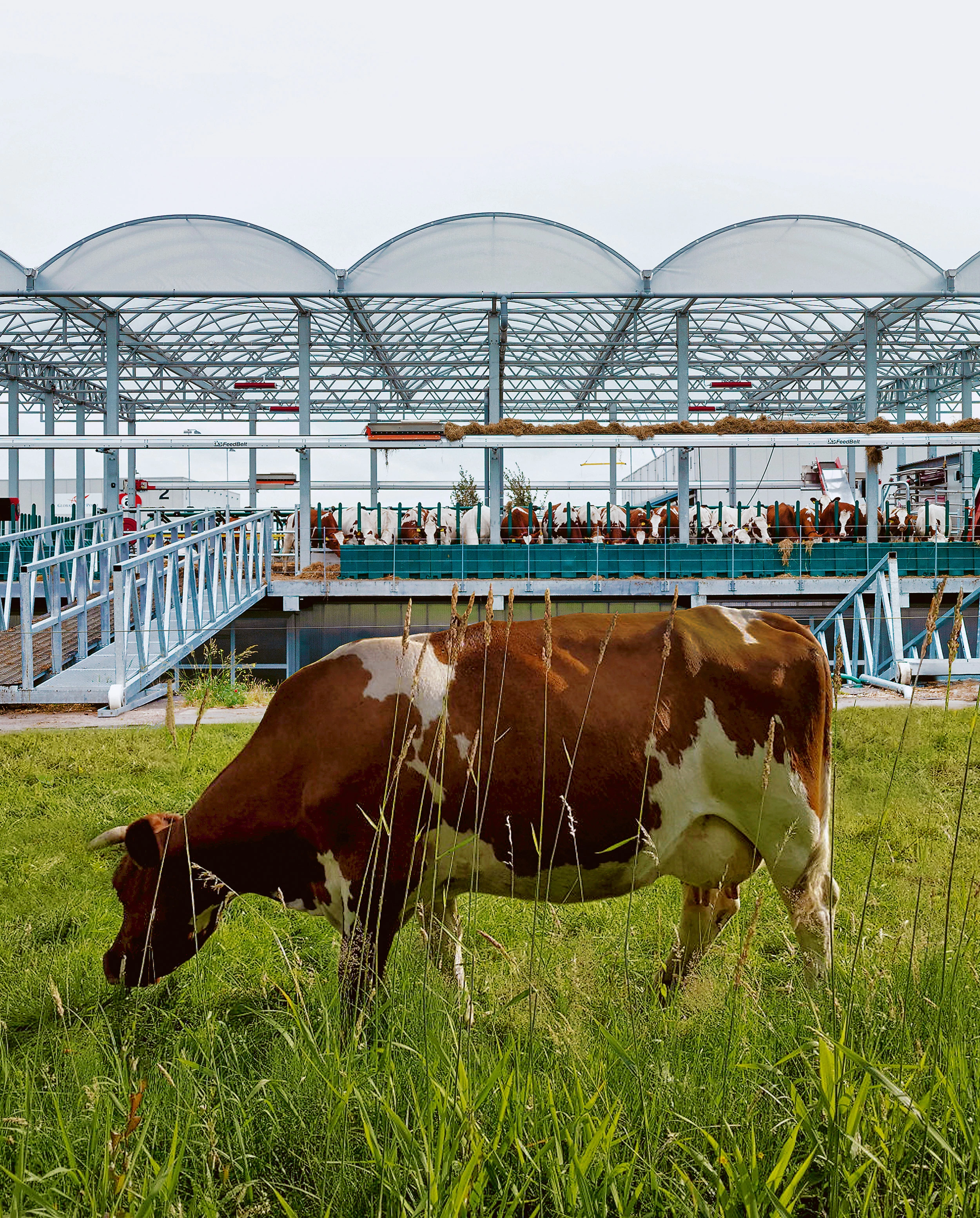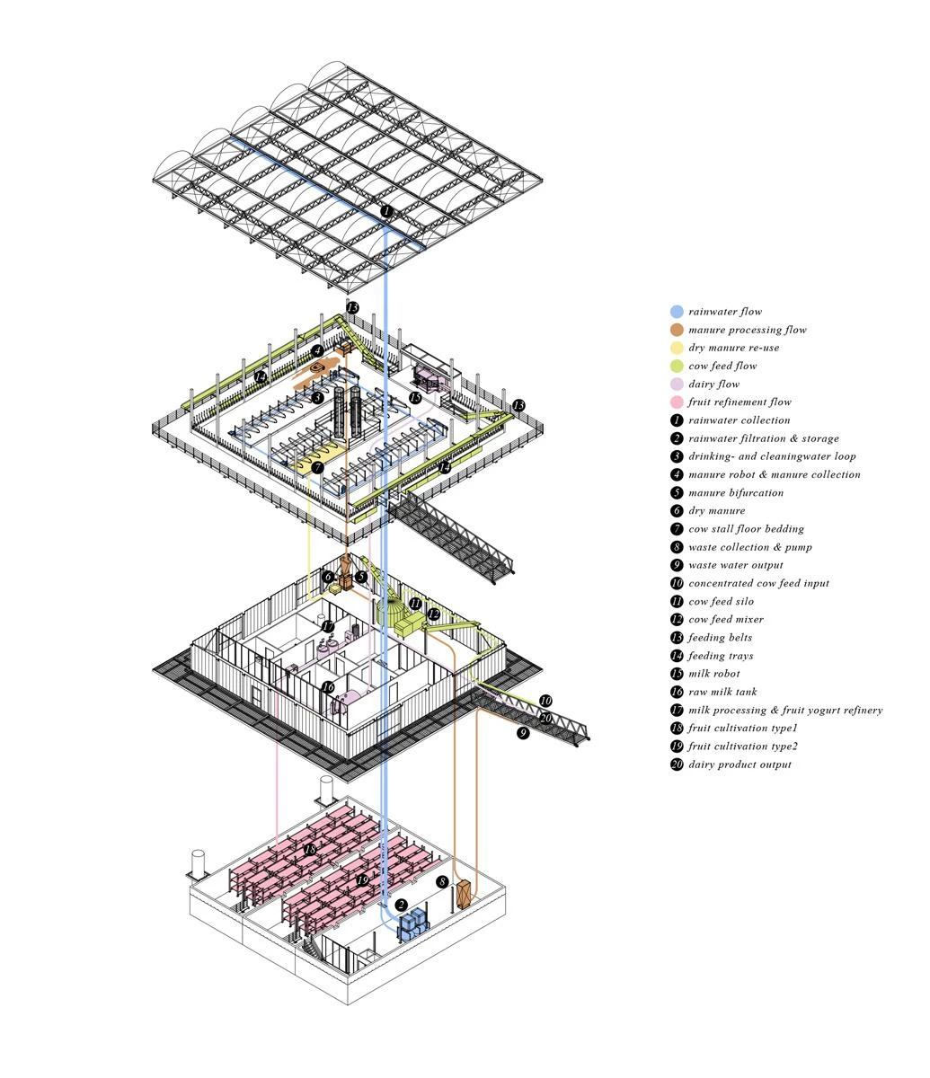 El Merwehaven, una zona portuaria situada en la orilla derecha del río Mosa en Rotterdam, se encuentra esta construcción agrícola donde se producen y procesan productos lácteos. El diseño de la firma local de Goldsmith Company está basado en principios náuticos, considerando el aumento progresivo del nivel del mar y las inundaciones frecuentes que sufren los Países Bajos. Por ello, la organización, los principios estructurales y el uso de materiales buscan mejorar la flotabilidad y la estabilidad de la estructura. La composición con un triple apilamiento coloca los elementos pesados en la parte sumergida del edificio. Con capacidad para cuarenta vacas, la granja combina las instalaciones técnicas, de almacenamiento, procesamiento y producción, con robots para ordeñar y limpiar el estiércol, paneles solares y un sistema de recolección y purificación de aguas pluviales. Bajo una gran cubierta en voladizo, el conjunto de 2.000 metros cuadrados ofrece además un recorrido para los visitantes sin perturbar la actividad de la granja.