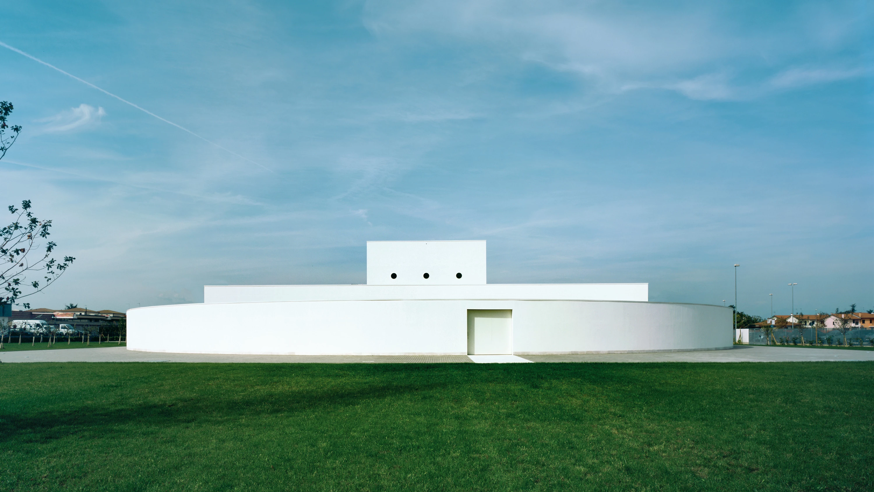 Una caja cuadrada formada por nueve cuadrados. El central emerge para tomar la luz de lo alto del vestíbulo. En los circundantes se organizan las aulas. Se inscribe en una caja circular mayor conformada por muros circulares dobles. Una caja abierta al cielo que forma cuatro patios que sugieren los cuatro elementos: aire, tierra, fuego, agua.
