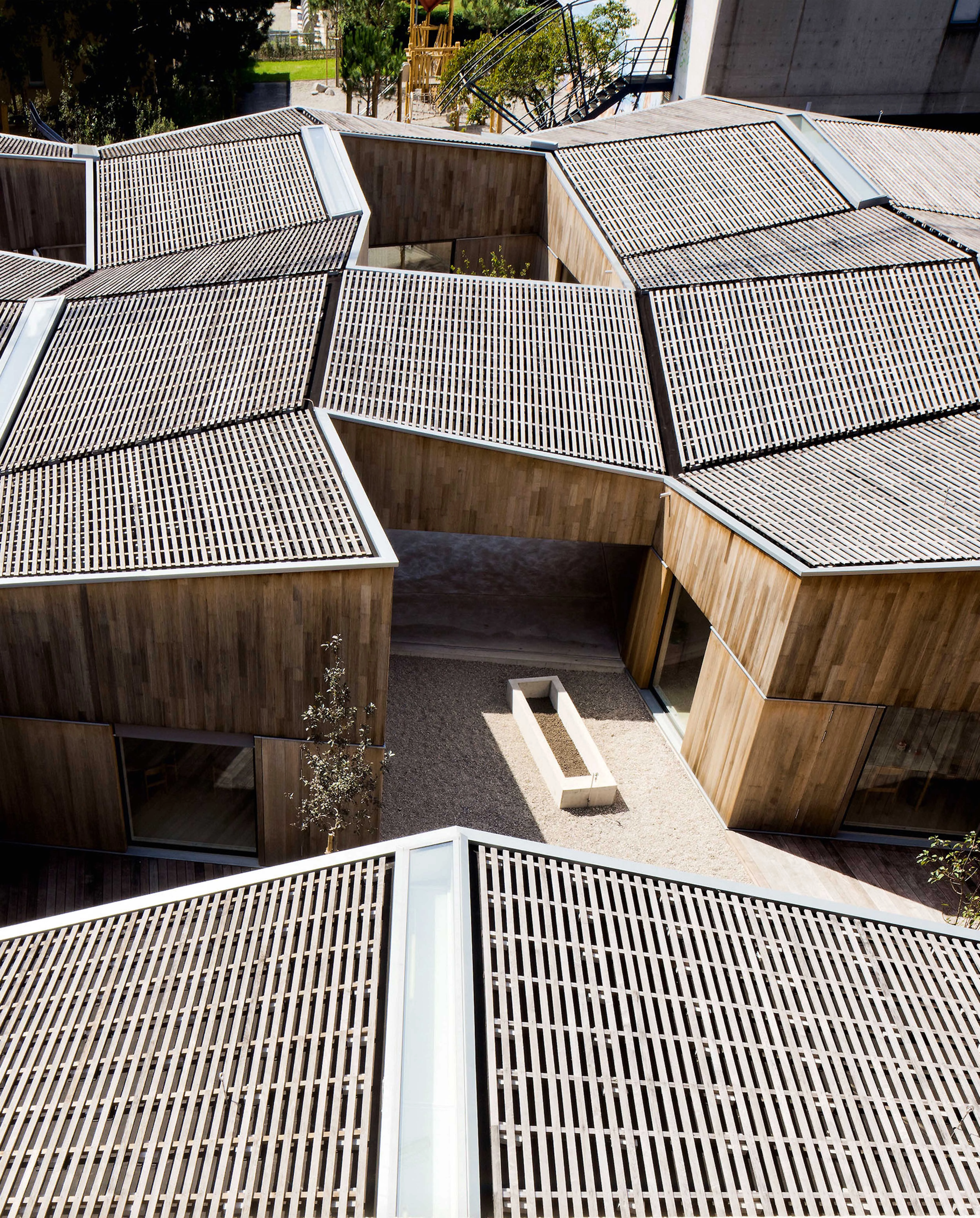 El gimnasio, guardería y escuela primaria se organizan en torno a una serie de vacíos —los campos deportivos, áreas de juego y plaza de entrada— conformados por la repetición de distintos módulos trapezoidales irregulares de madera... [+]