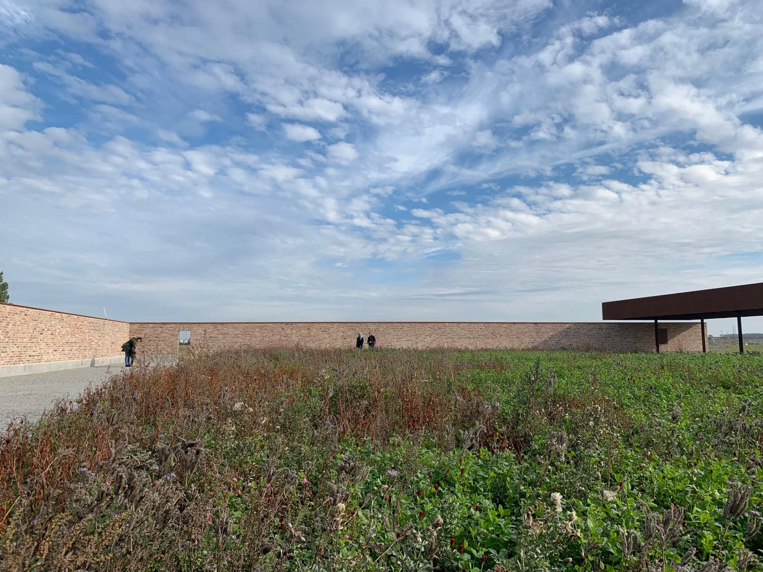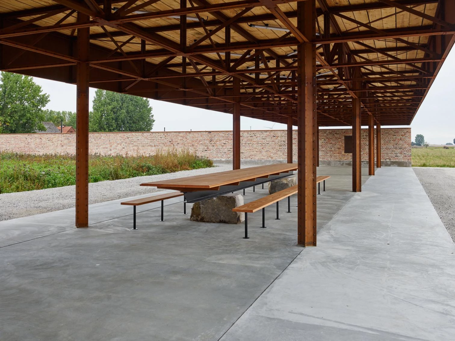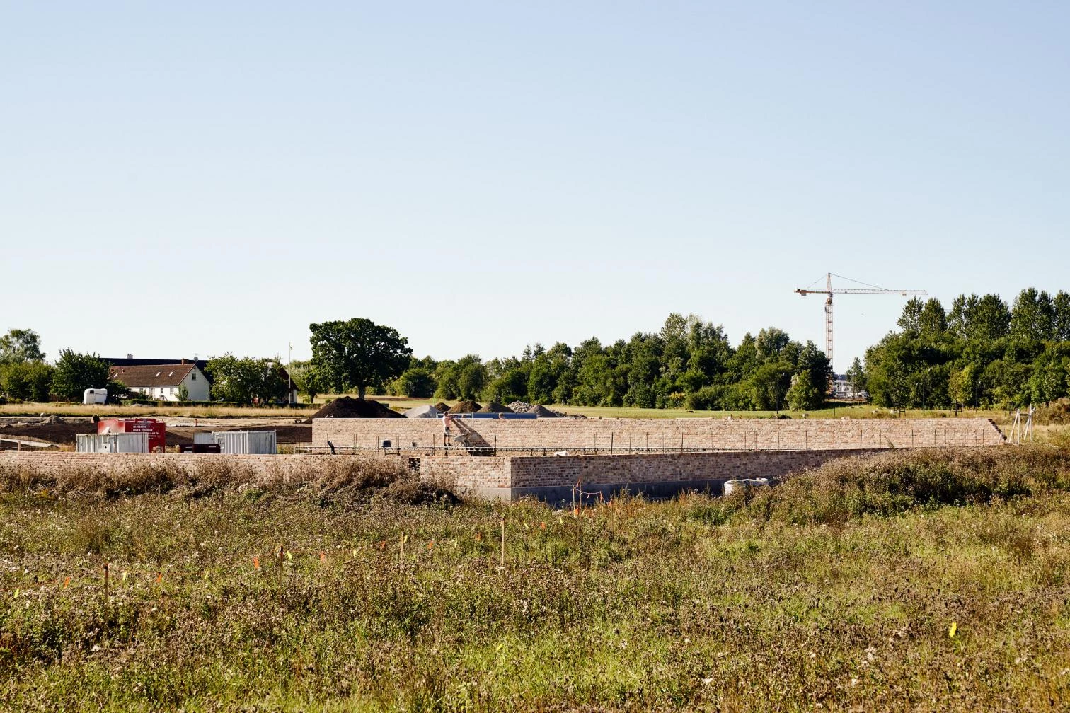 El primer hito del nuevo desarrollo ha sido un espacio público que a corto plazo funcionará como foro de debate y dotación para celebrar actividades, pero que contemplado con luces largas constituirá una zona verde en el corazón del futuro barrio. Una tapia construida con ladrillos reciclados define un cuasi hortus conclusus, dejando uno de sus lados abierto a los campos en barbecho. En este flanco, una zona de descanso queda al resguardo de una marquesina en cuyas cerchas de acero, roblonadas como antaño, se han querido releer los procesos manuales que levantaron la catedral a la que este lugar está, al menos titularmente, vinculado.