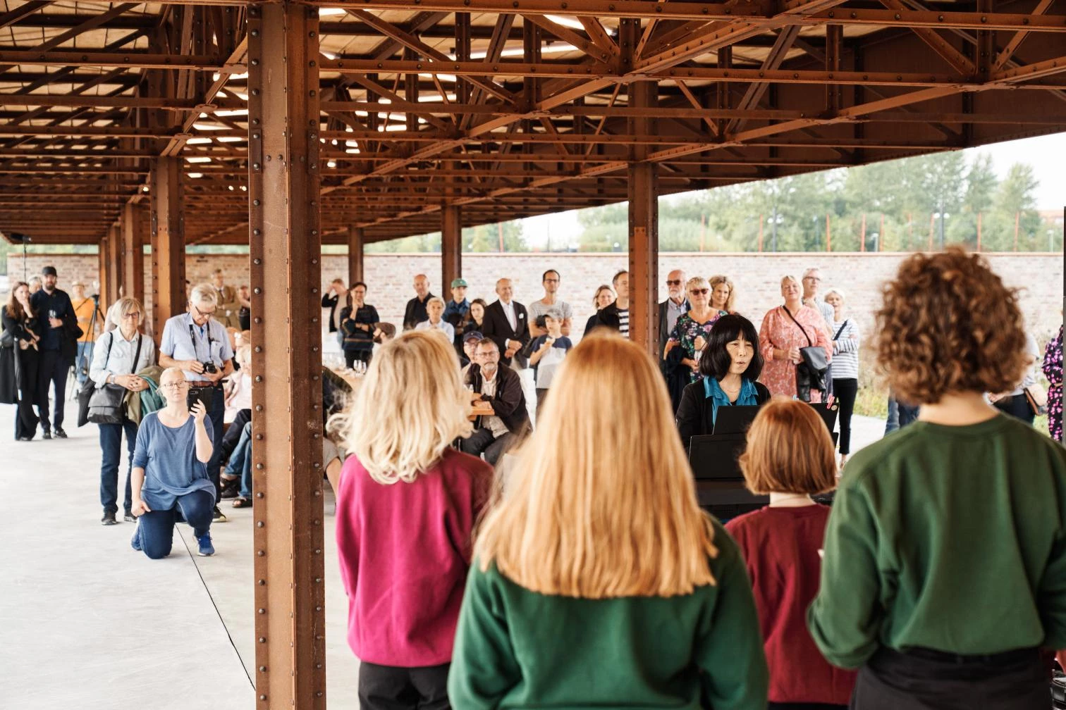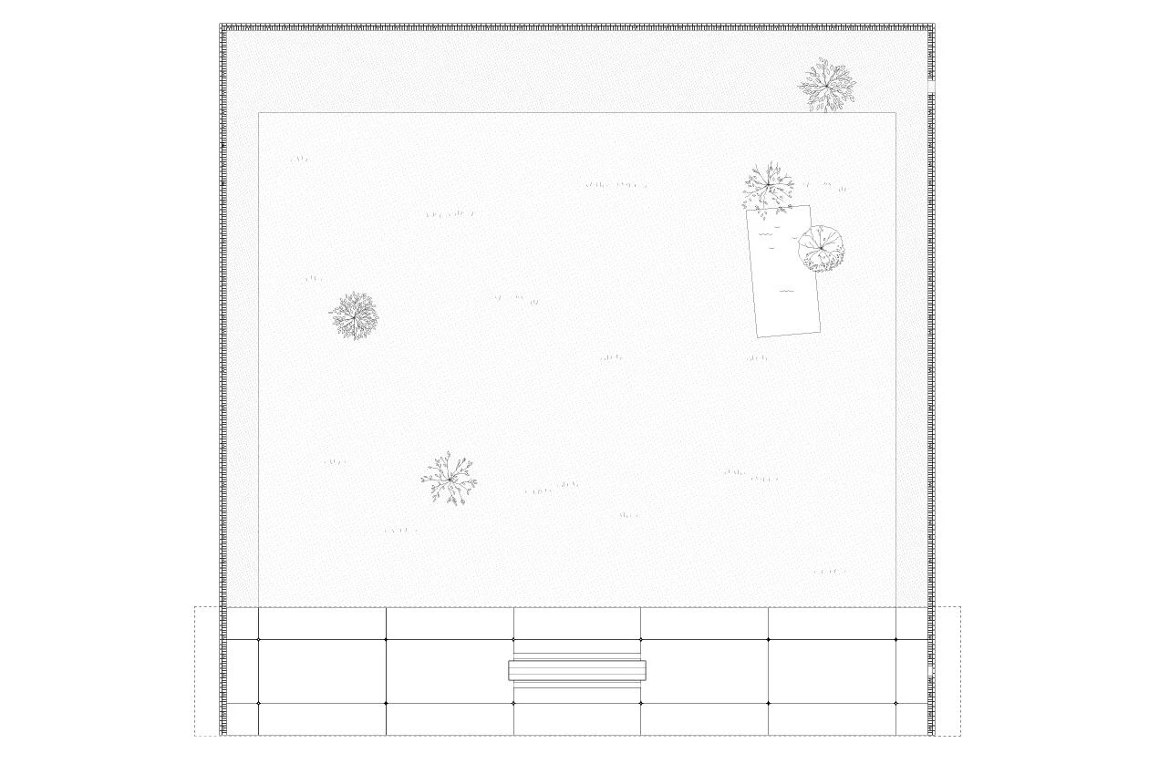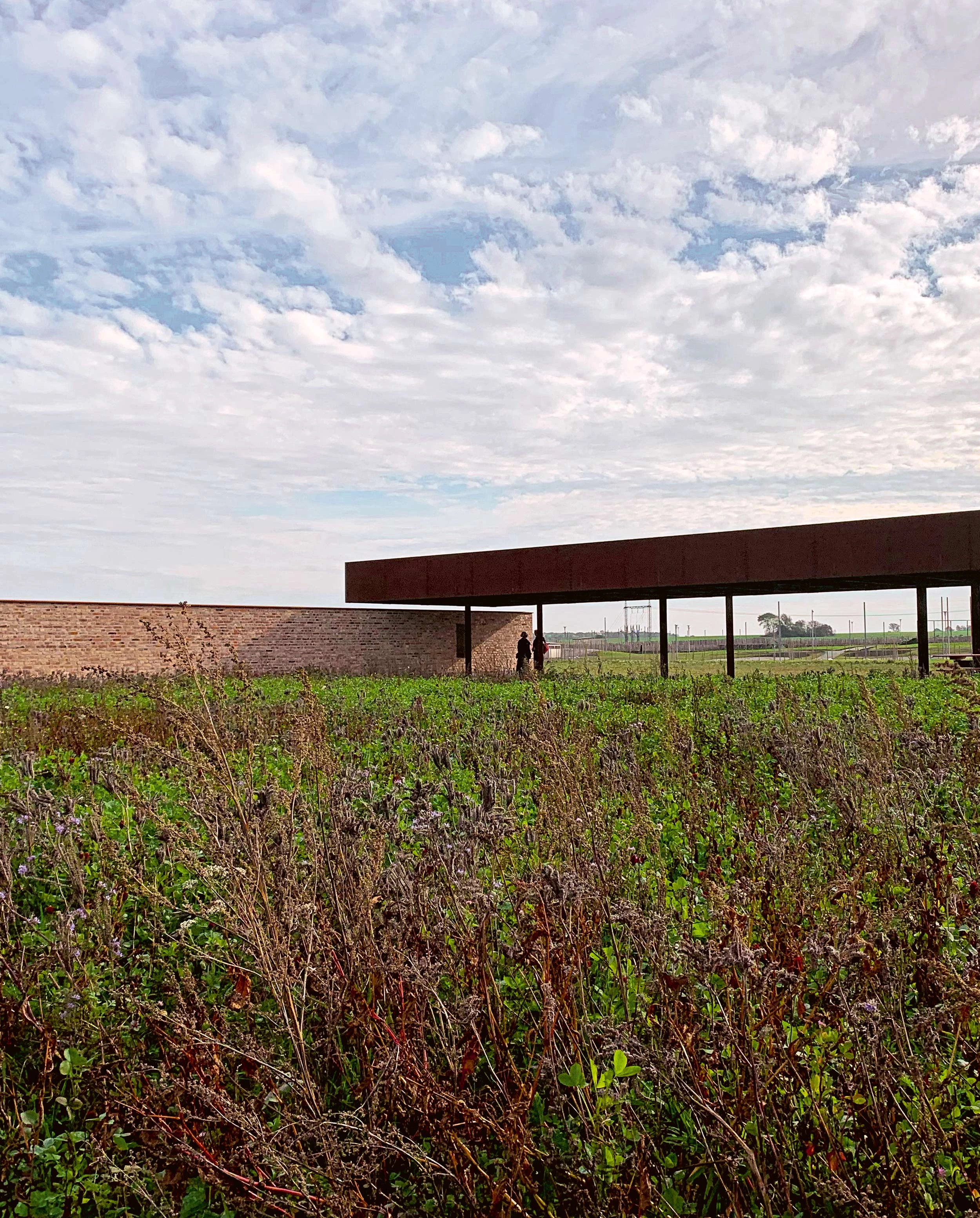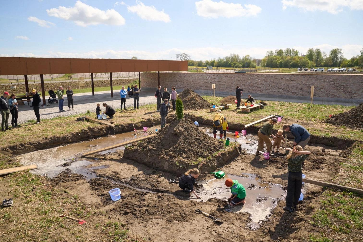El primer hito del nuevo desarrollo ha sido un espacio público que a corto plazo funcionará como foro de debate y dotación para celebrar actividades, pero que contemplado con luces largas constituirá una zona verde en el corazón del futuro barrio. Una tapia construida con ladrillos reciclados define un cuasi hortus conclusus, dejando uno de sus lados abierto a los campos en barbecho. En este flanco, una zona de descanso queda al resguardo de una marquesina en cuyas cerchas de acero, roblonadas como antaño, se han querido releer los procesos manuales que levantaron la catedral a la que este lugar está, al menos titularmente, vinculado.