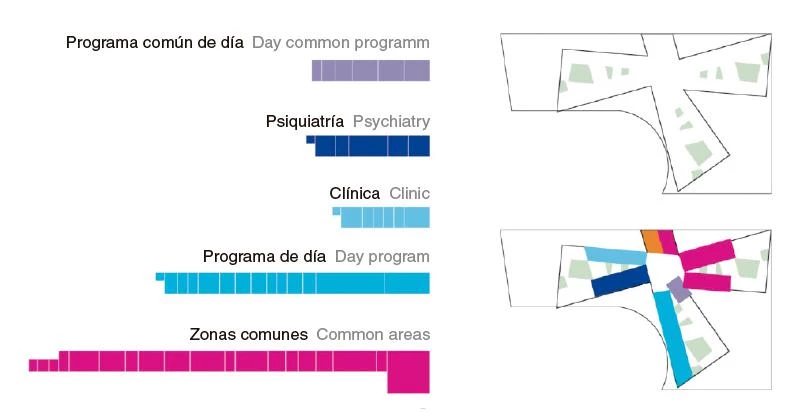 Como es sabido, un ambiente seguro y amable es crucial en el buen desarrollo de un tratamiento psiquiátrico y del bienestar personal del paciente. Los tratamientos actuales demandan un nuevo tipo de arquitectura donde se combine un programa racional y eficaz con ambientes más íntimos y hogareños que ayuden al paciente a sentirse seguro y cómodo. Desde el principio el diseño del hospital huyó del esquema tipo de hospital tradicional: pasillo interior sin ventanas que sirve a ambos lados a una batería de habitaciones con acabados artificiales de colores fríos y grises. En contraposición, se optó por utilizar materiales naturales: madera, vidrio y hormigón pintado en colores cálidos con el objetivo de crear espacios que se alejaran de la imagen triste y apagada característica de un hospital.