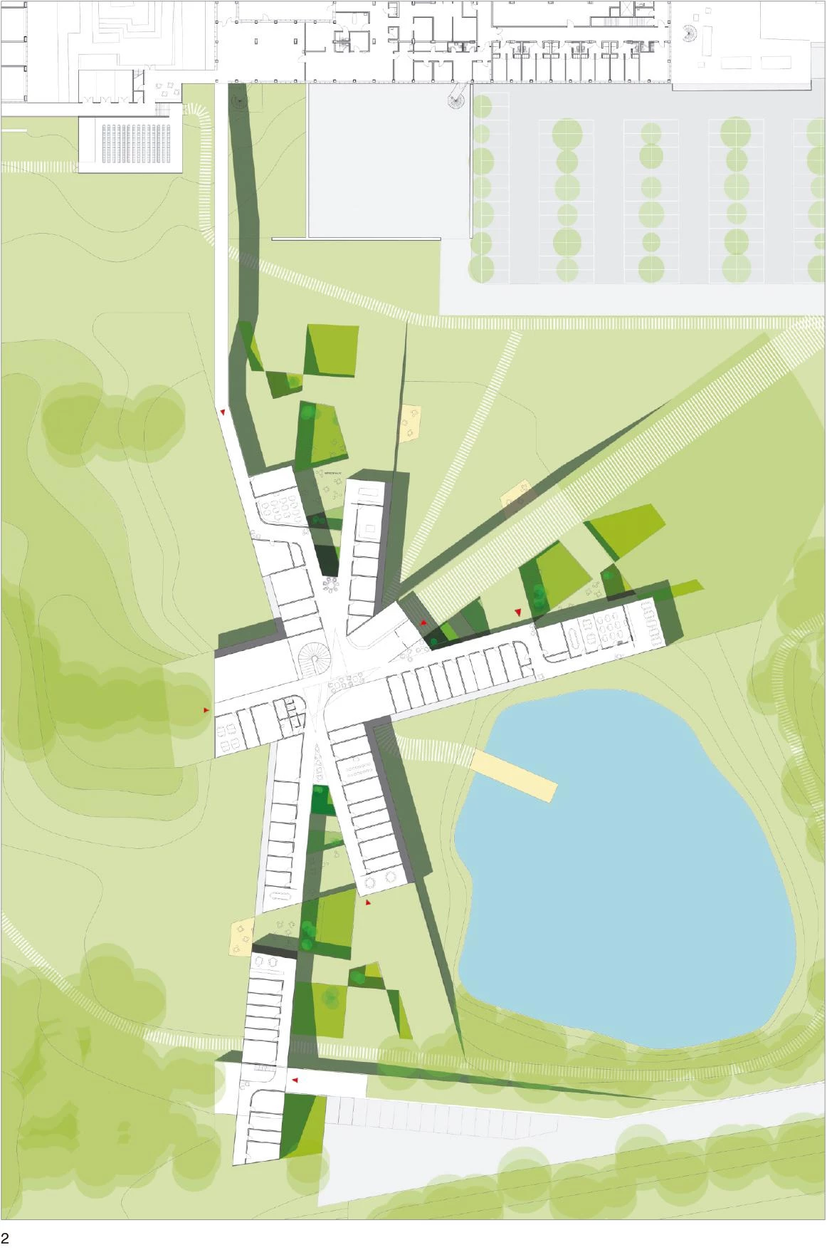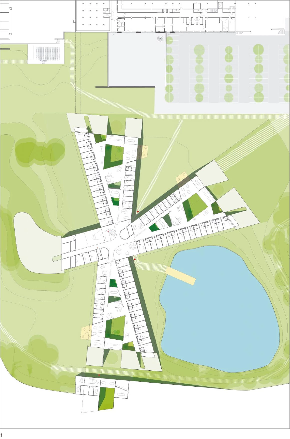 El complejo programa requería la conciliación entre el uso residencial y el hospitalario, las áreas públicas y las privadas, así como la definición de espacios para muy distintos tipos de usuario. Para resolverlo se propone un edificio híbrido con forma de estrella que agrupa las zonas comunes en un núcleo central y distribuye las habitaciones de los pacientes, los despachos y las oficinas del personal médico en distintas alas de forma radial, separadas por sectores triangulares ajardinados. Esta organización permite orientar dos alas de habitaciones con vistas al lago y una tercera hacia las colinas circundantes, todas con acceso directo al exterior. Separado en dos niveles, el edificio se integra en el paisaje montañoso donde los patios aparecen como cortes en el terreno. Una de las galerías del área de tratamientos se extiende con una estructura-puente que sirve de conexión con el hospital existente.[+][+]