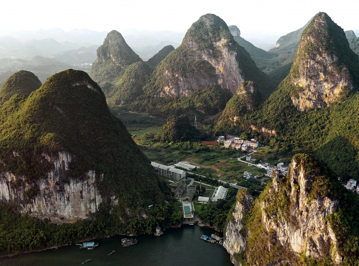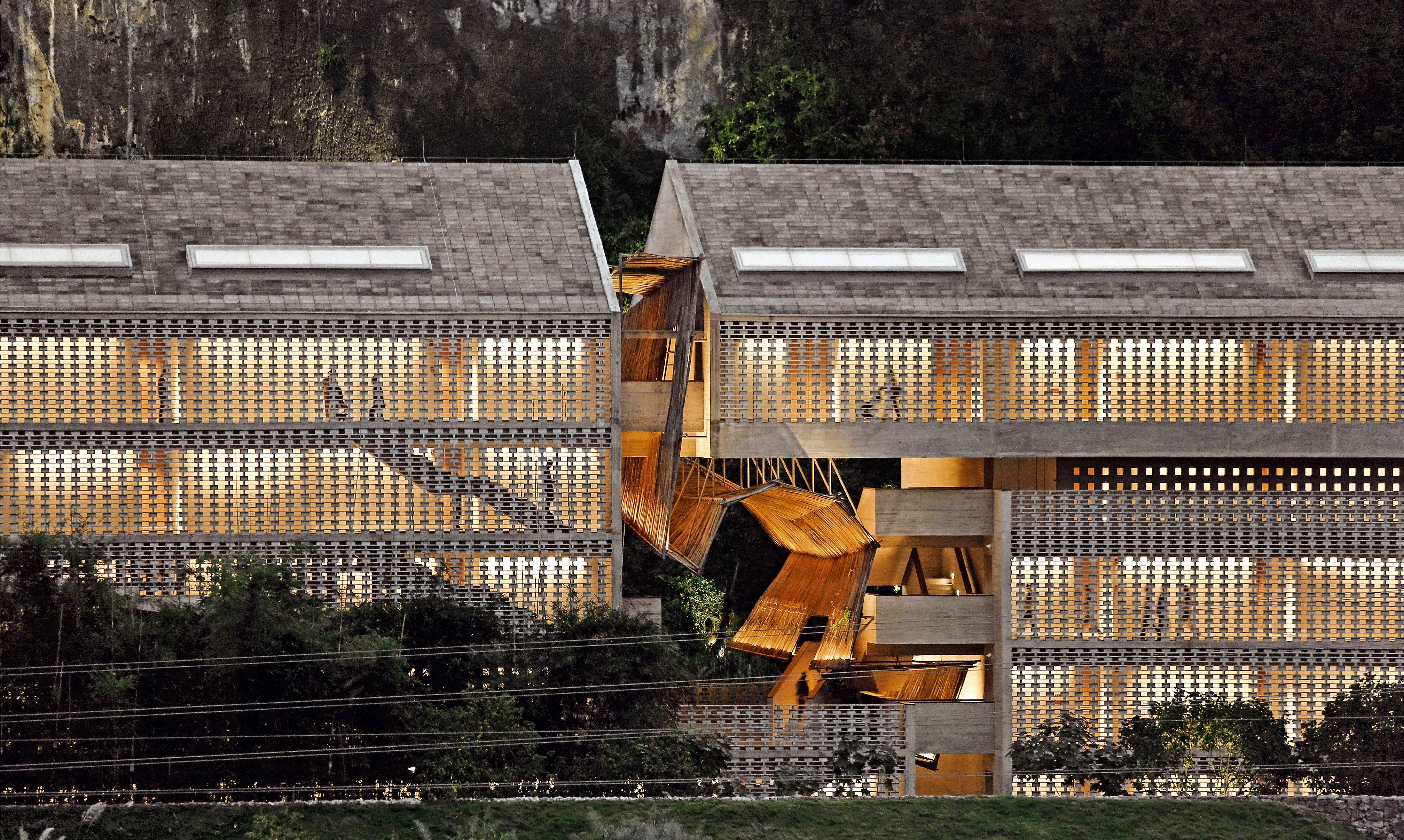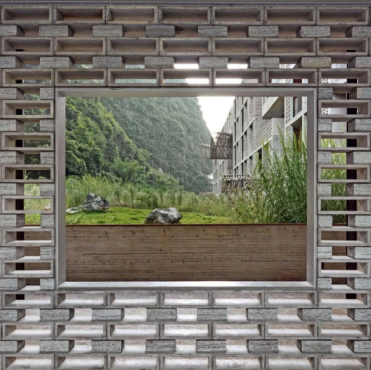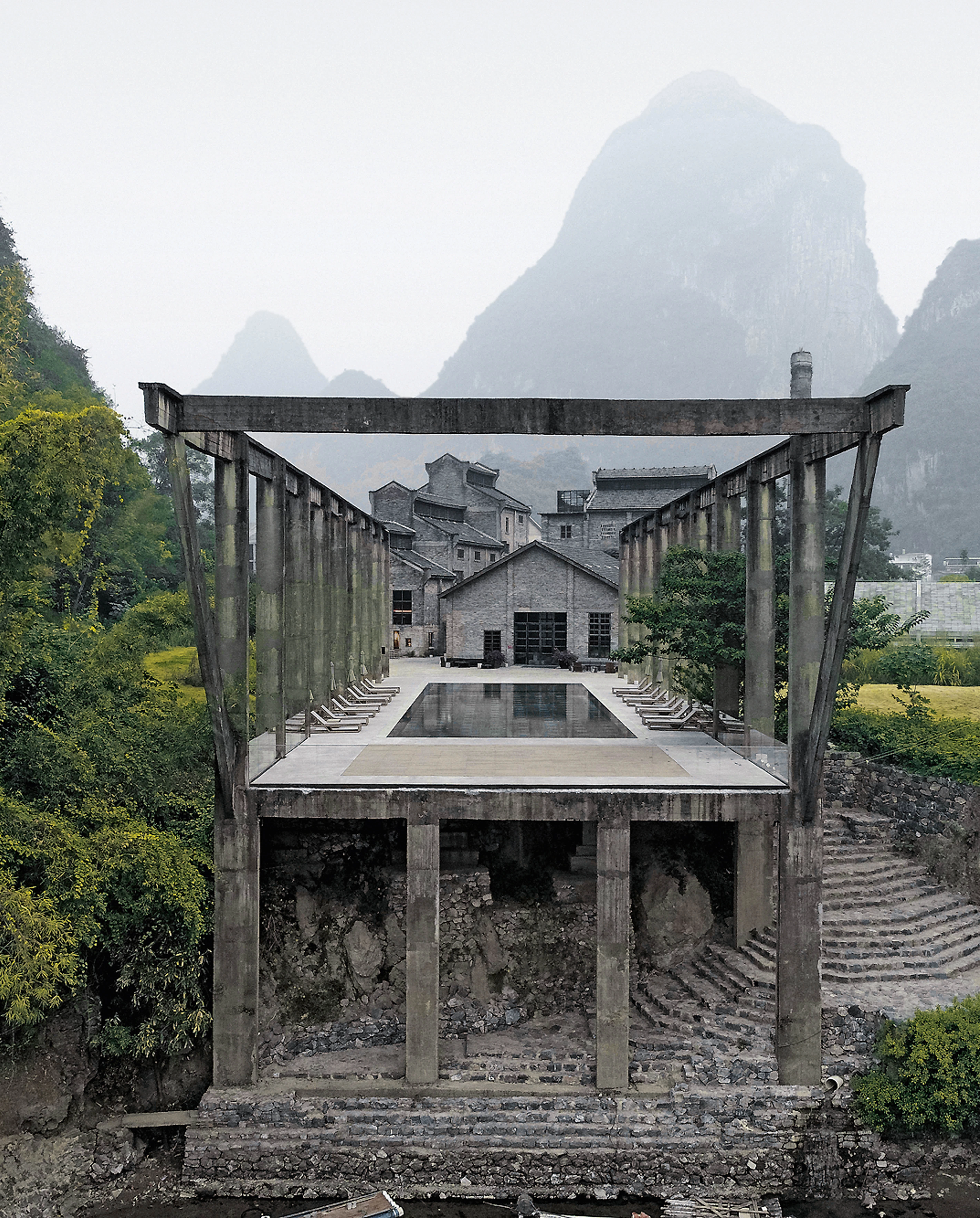 El hotel está enclavado en el pintoresco valle del río Li, en Guangxi, al sur de China, una región que se caracteriza por sus paisajes de montañas kársticas ondulantes. En este entorno singular, el proyecto ha intervenido sobre un molino azucarero construido en la década de 1960 y muy bien conservado, y el respeto a este patrimonio se ha convertido en una de las premisas de la intervención. El molino y el resto de antiguas piezas industriales ocupan la parte central del hotel, mientras que los nuevos edificios, dedicados a habitaciones y villas, se sitúan en los flancos. Una plaza rehundida y una lámina de agua acentúan el simbolismo del conjunto, además de evocar el significado de la vieja instalación. La sensación de continuidad se ha reforzado respetando los materiales y tonos del edificio preexistente, pero sin renunciar a introducir una paleta más contemporánea. En este sentido, los bloques de cemento y el hormigón encofrado con madera in situ contribuyen a la ligereza y la transparencia de los nuevos volúmenes. Dos circulaciones principales atraviesan el edificio del hotel: una funciona como un corredor interno; la otra hace las veces de vía pública. Finalmente, el contraste entre la horizontalidad de la arquitectura y la verticalidad poderosa de las montañas kársticas sugieren la interacción entre lo artificial y lo natural.