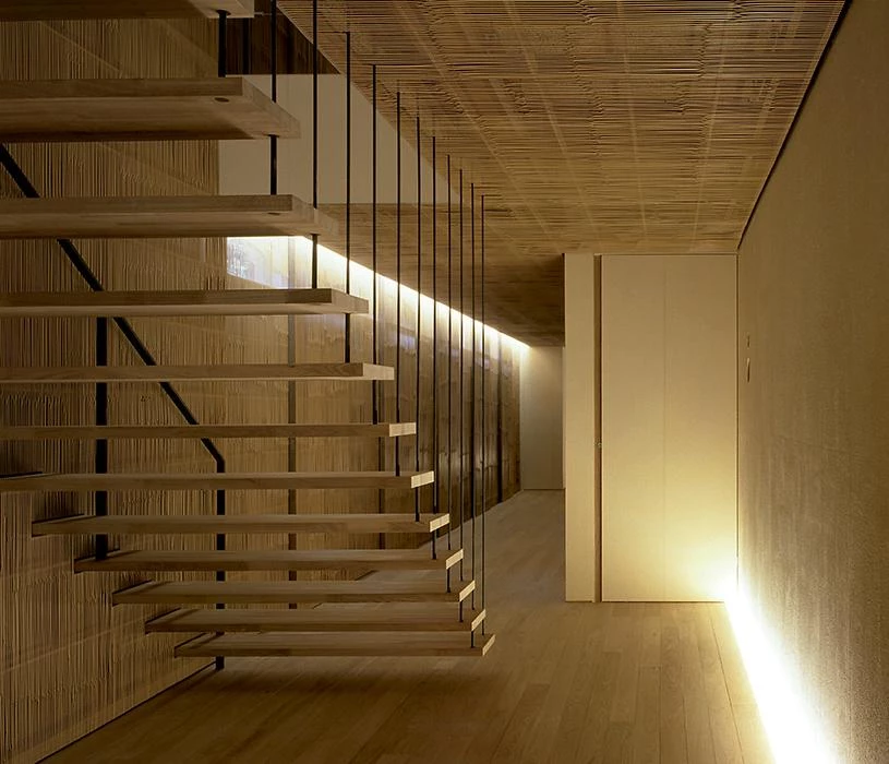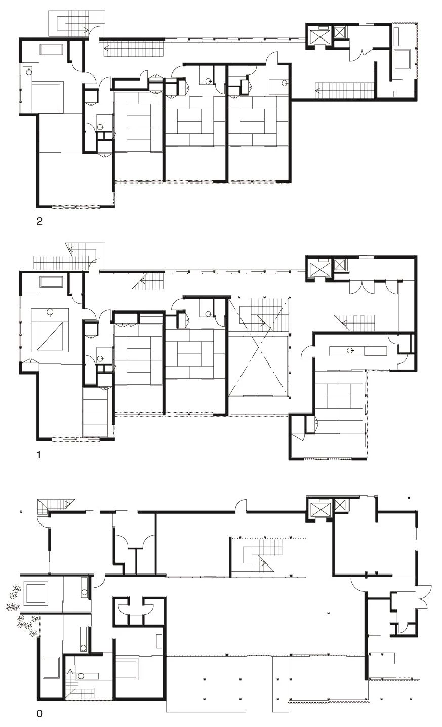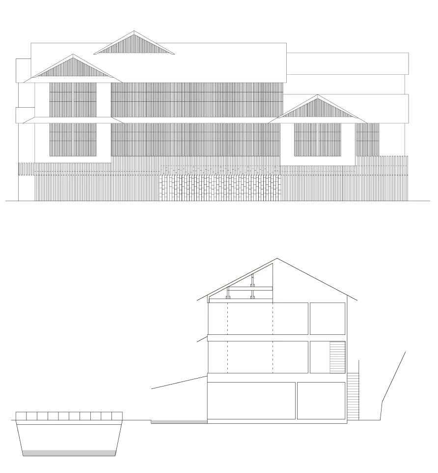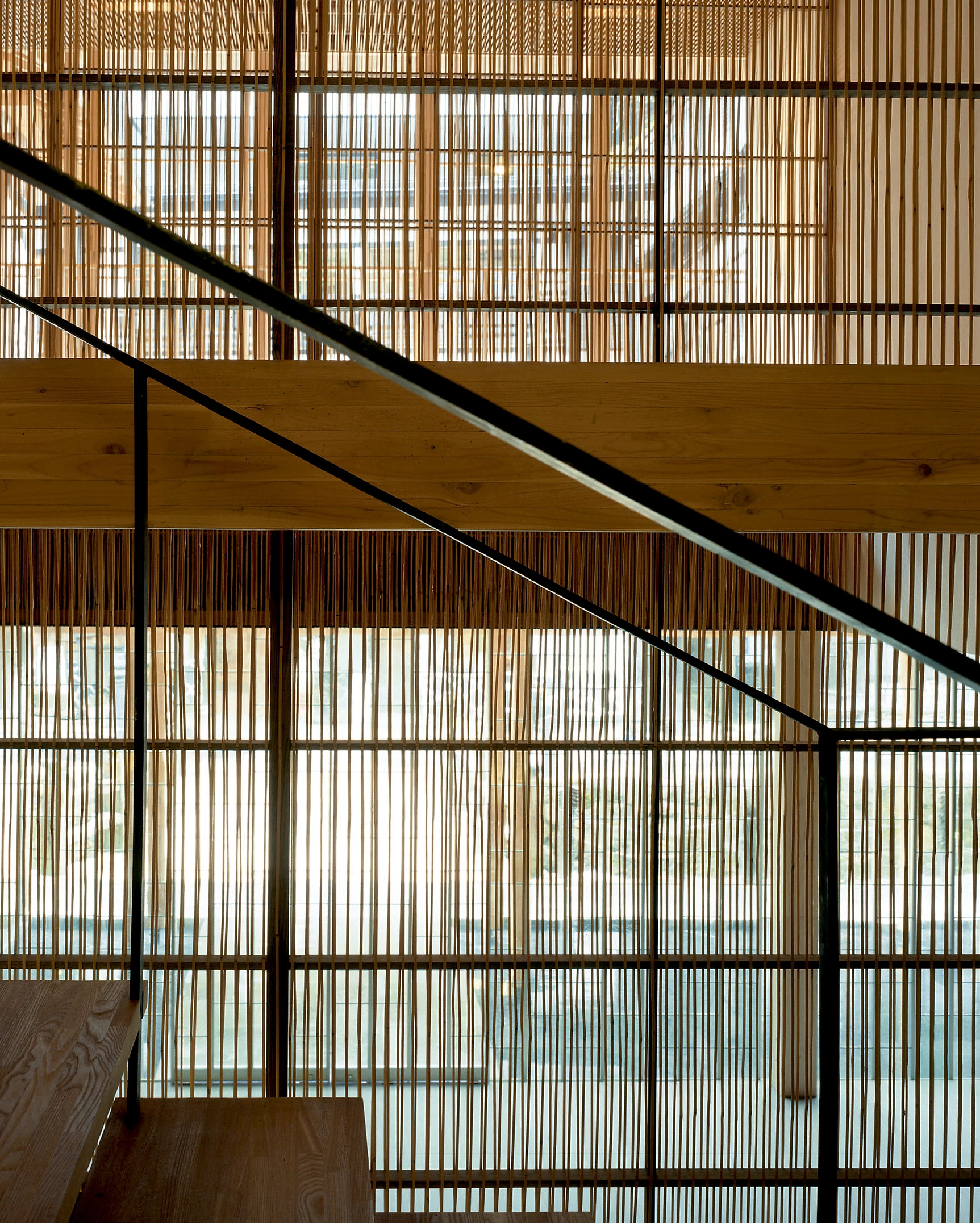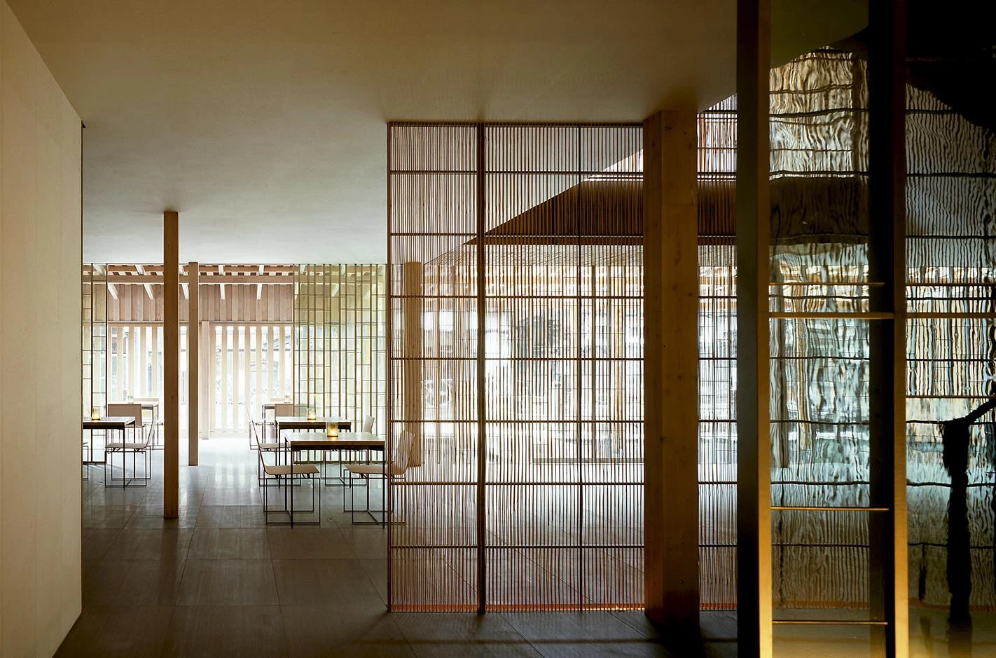 Sin renunciar a las formas tradicionales se proyecta una arquitectura plenamente contemporánea. De este modo, el proyecto mantiene la silueta y el volumen original e introduce huecos de mayor dimensión con carpinterías de madera y una nueva entrada. La fachada se rehabilita con la madera del hotel de cien años de antigüedad, y el espacio interior se organiza en torno a un gran vestíbulo de dos alturas delimitado por una delicada pantalla construida con tiras de cuatro milímetros de bambú (sumushiko). Estas pantallas de bambú, de textura y color cálido, proporcionan una ligera vibración e introducen una luz suave matizada en el interior creando el ambiente óptimo para un lugar de descanso.