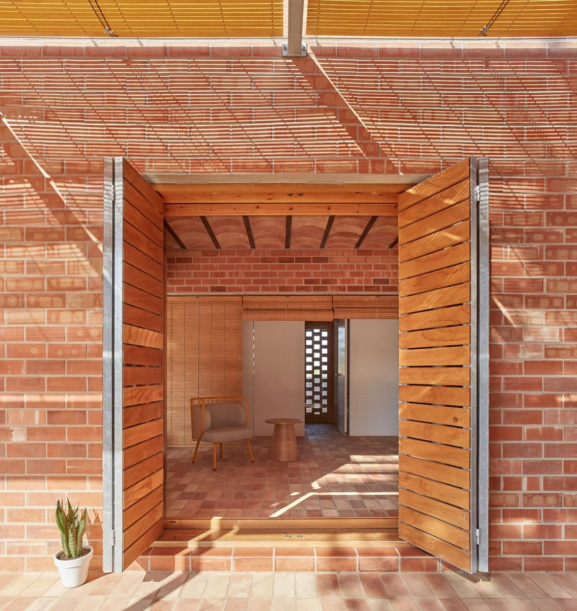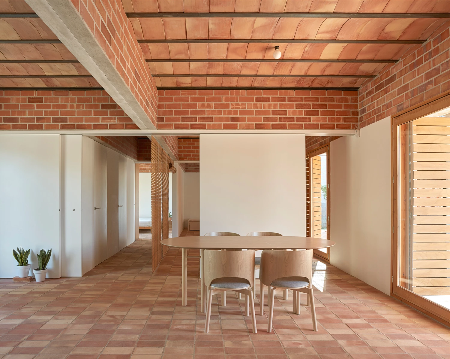 Aplicando la normativa local y la máxima economía de medios, un volumen rectangular y depurado resuelve compositivamente el programa, complementado con una pequeña alberca y un sencillo porche, para atender las necesidades de una pareja con dos hijos. Ocho espacios iguales dispuestos de manera ortogonal presentan espacios pintados en color blanco, delimitados por la cerámica del suelo y del grueso plano del techo. Los paneles correderos compartimentan las estancias, permitiendo generar un espacio continuo y unitario. La organización y las soluciones constructivas adoptadas buscan optimizar el comportamiento pasivo de la casa con gran eficacia energética.