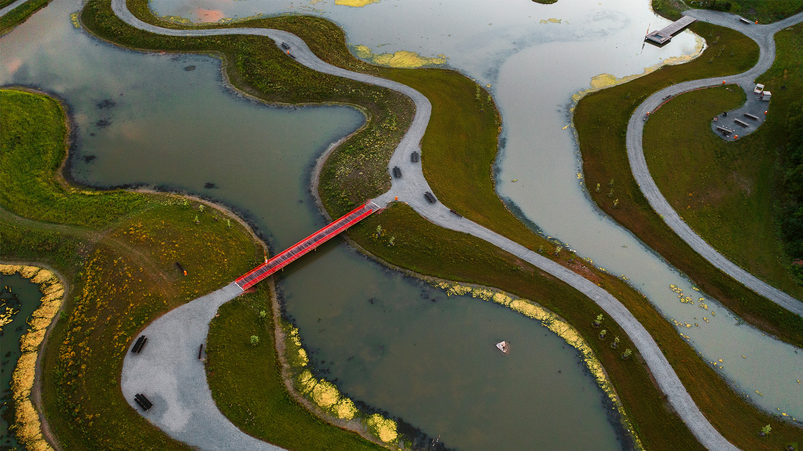A composition of six concatenated swamps form a recreational space that also functions as a natural cleanser of the waters of an urban stream before they flow into a large lake.
