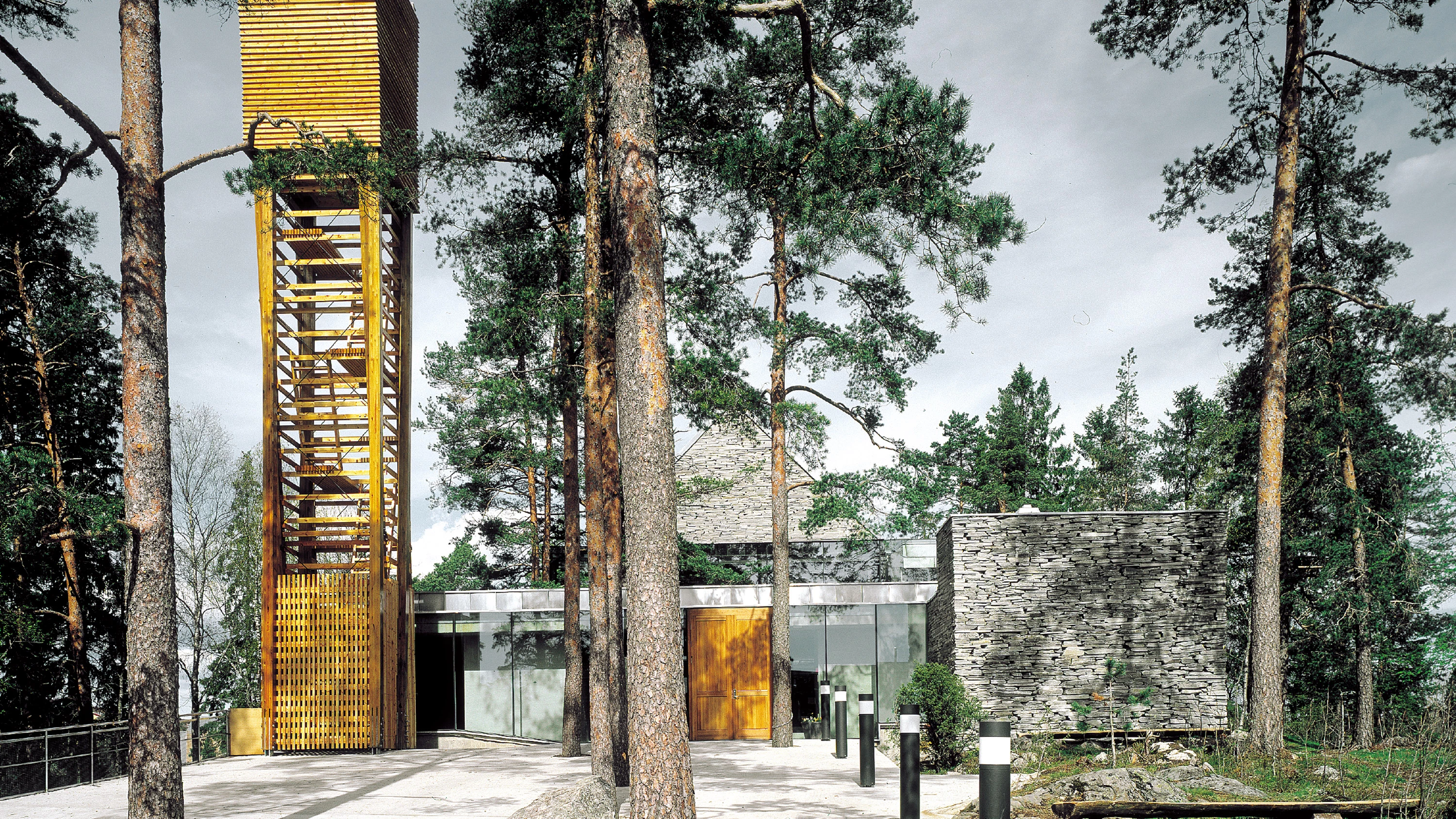 En un distrito del sur de Oslo y sobre una colina coronada por ejemplares de pino de gran porte se levanta esta nueva iglesia que, siguiendo la tradición escandinava, busca con avidez la luz y la proximidad con la naturaleza. La parcela disponible, de unos 2.000 metros cuadrados, permitió situar las piezas con cierta holgura, dejando que la edificación encontrara su sitio sin recurrir a grandes talas ni obras de excavación. Los dos elementos principales del paisaje noruego —la roca y el bosque— se transforman así en los protagonistas de una actuación en la que lo edificado evita toda disonancia con el entorno.