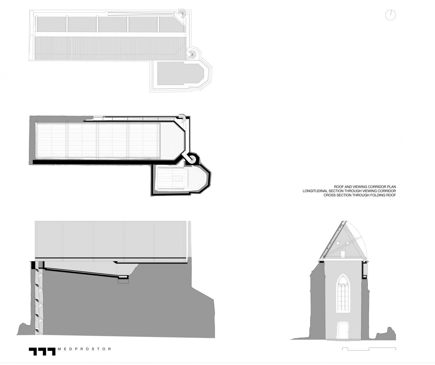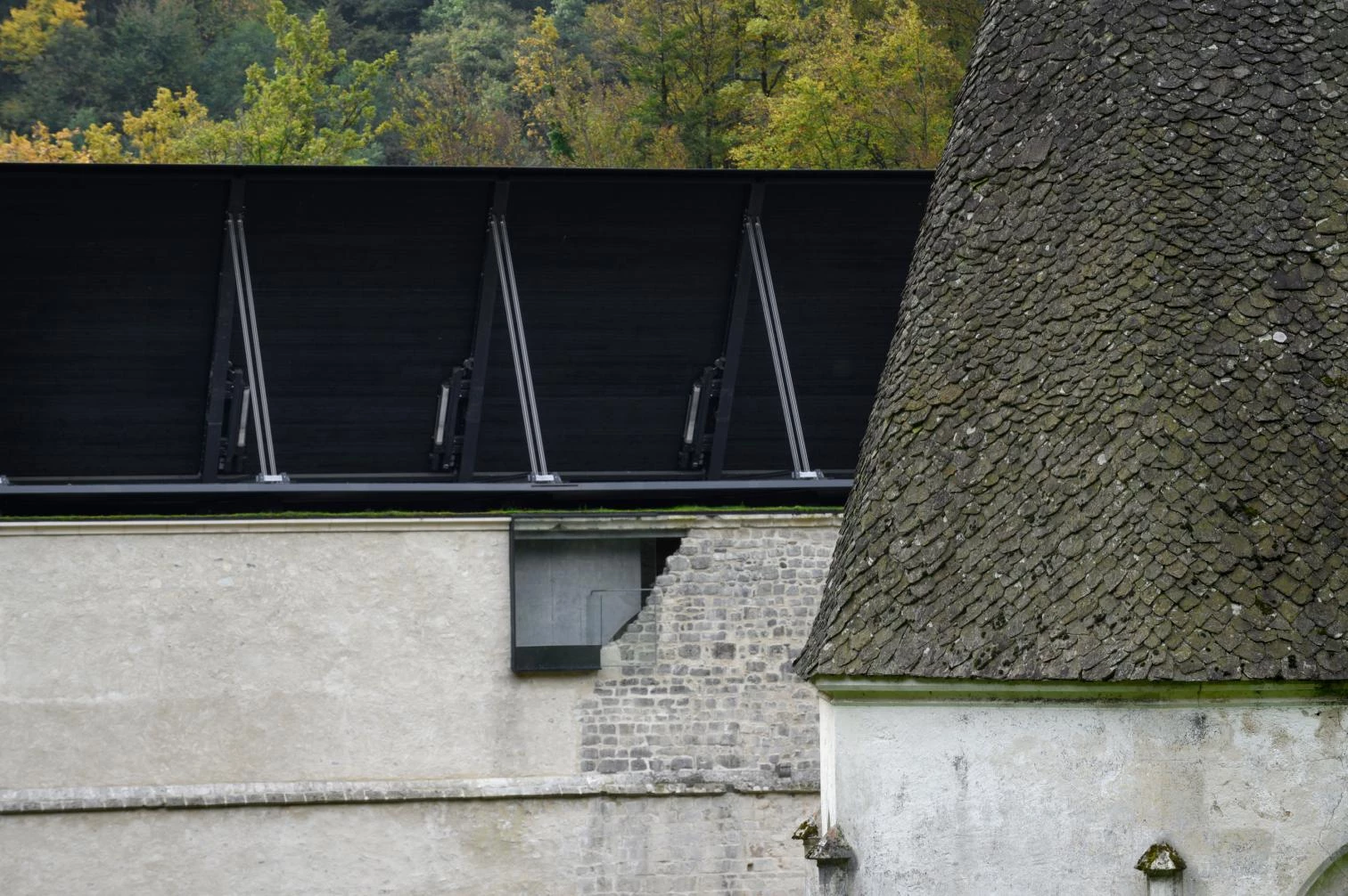 Las actuaciones de restauración y reconstrucción permiten una lectura cronológica de este espacio sacro de 900 años de antigüedad. El ligero acero negro, la madera ennegrecida y las tejas de pizarra oscuras conforman el sistema de cubierta a dos aguas, en contraste con la mampostería original de edifico monástico. Unas escaleras de caracol conducen a los visitantes a un nuevo mirador situado en un hueco del muro norte. El proyecto se ajusta a las exigencias de protección del patrimonio en materia de reversibilidad, con intervenciones poco invasivas, y un lenguaje sobrio que dialoga respetuosamente con los elementos originales.