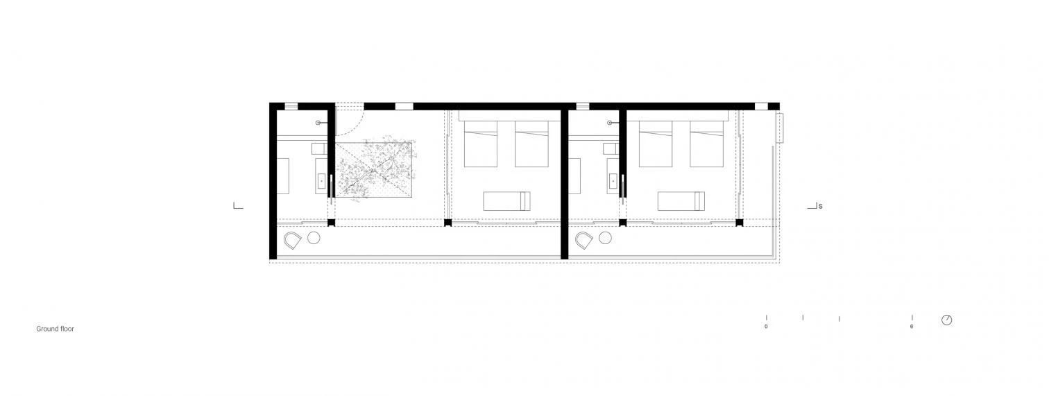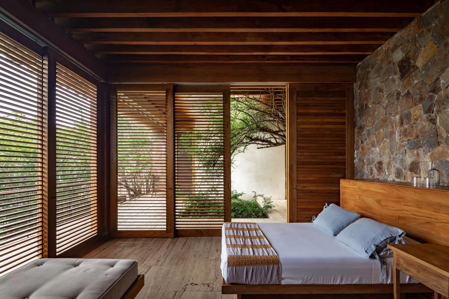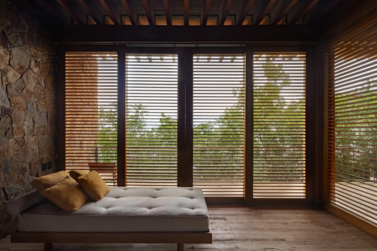 El diseño para la casa parte de dos premisas: respetar al máximo el sitio y aprender de la arquitectura vernácula. Minimizando los puntos de apoyo, la construcción utiliza materiales locales como la madera, la piedra, el estuco y el barro. El sistema estructural, compuesto de madera y hormigón, forma marcos con módulos de 4.80 metros que cargan losas ligeras recubiertas con fragmentos pétreos.